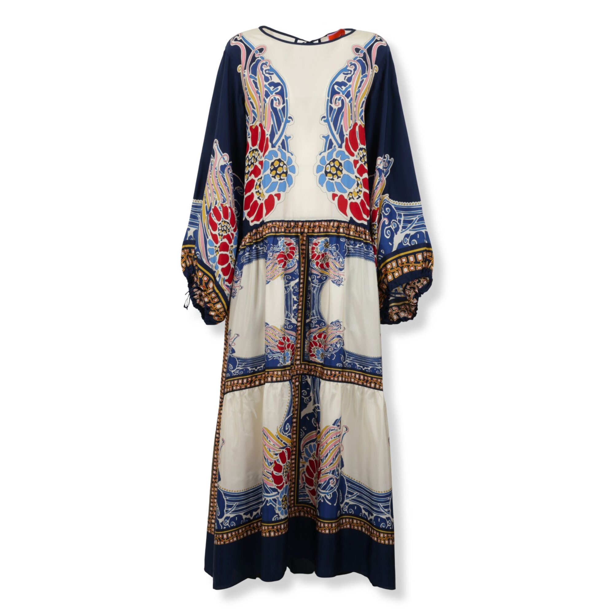 Vesta Dress La Double J. Silhouette voluminosa in seta con stampa Lemuria del brand. Scollo rotondo e maniche a sbuffo regolabili con legacci.