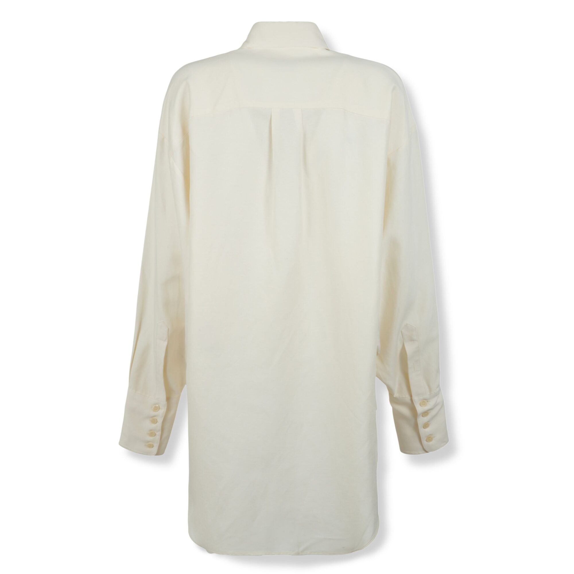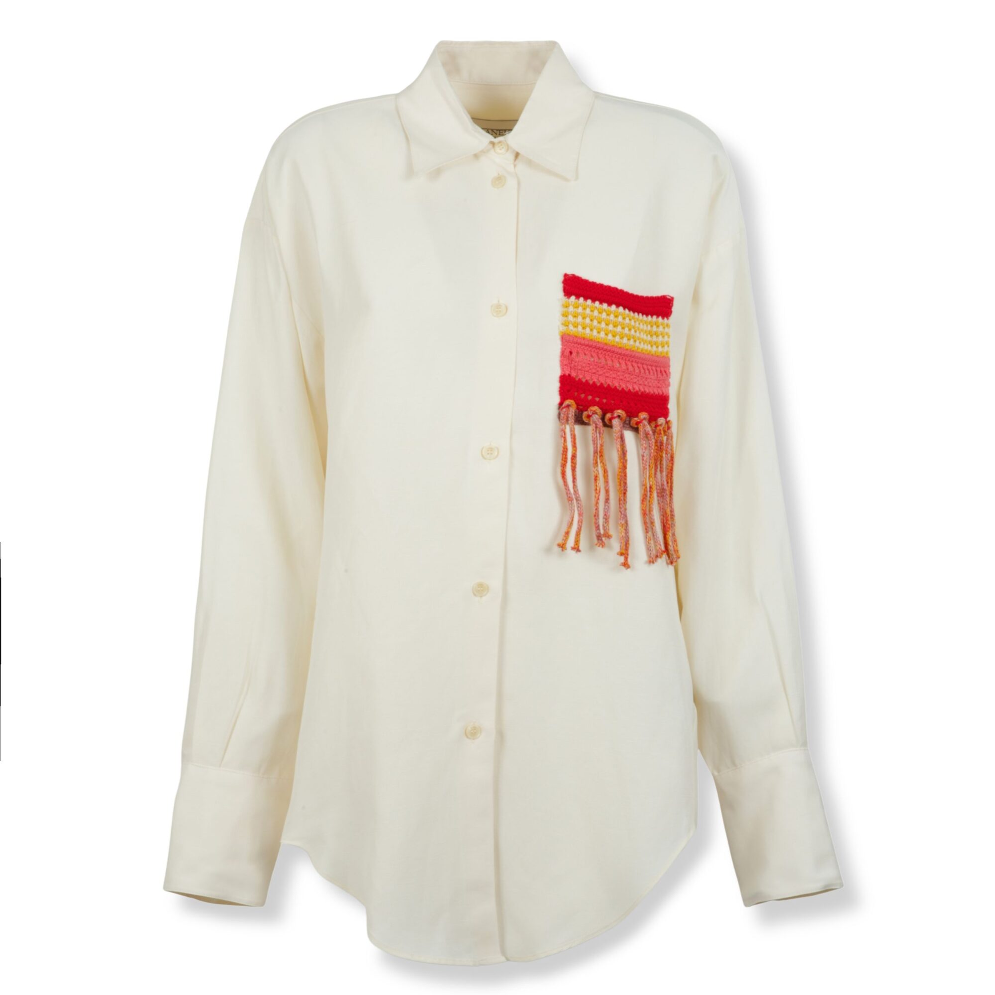 Camicia Cancun Laneus. Silhouette oversize con spalla scesa e maniche pipistrello. Taschino sul petto rifinito con frange.