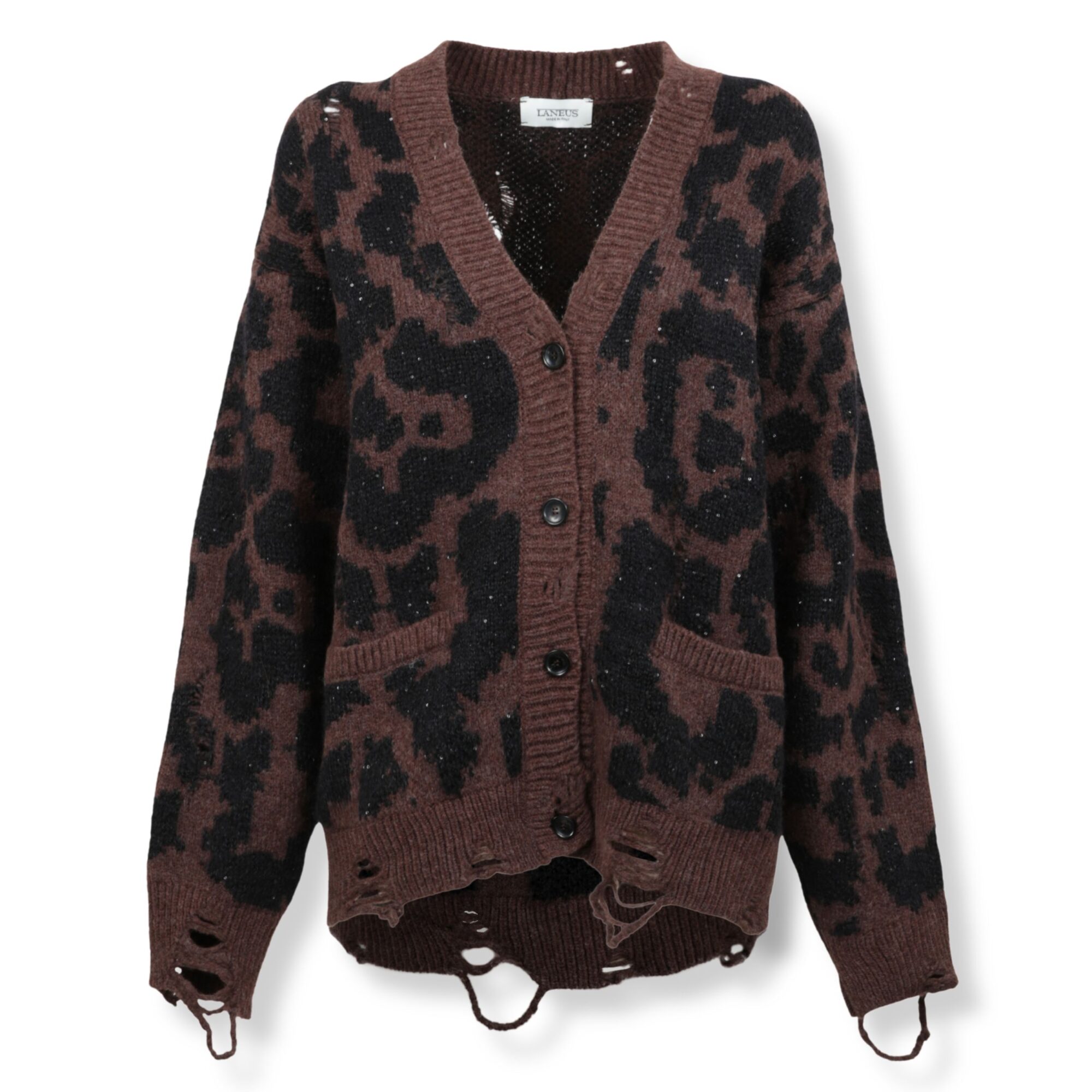 Cardigan Scollo a V Leopard Jacquard Laneus. Orli a costine, effetti destroyed su orlo inferiore e polsini. Chiusura frontale con bottoni.