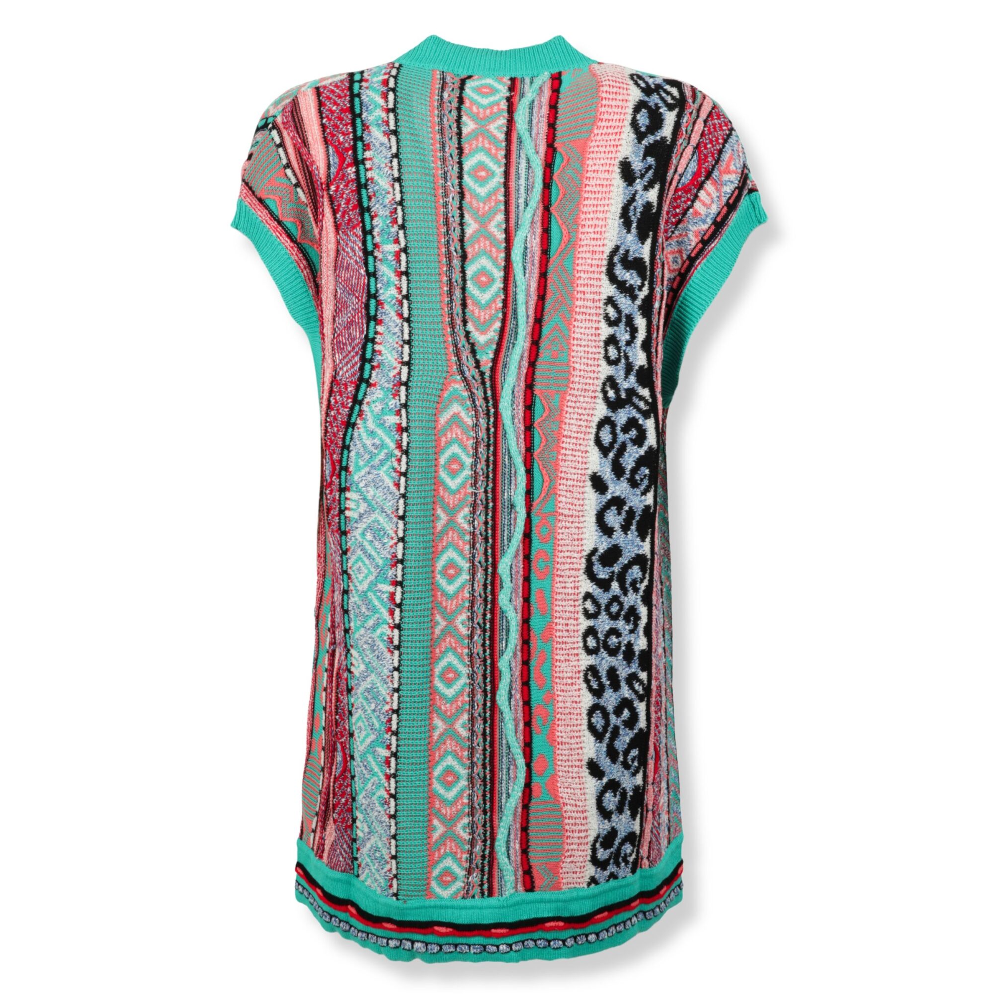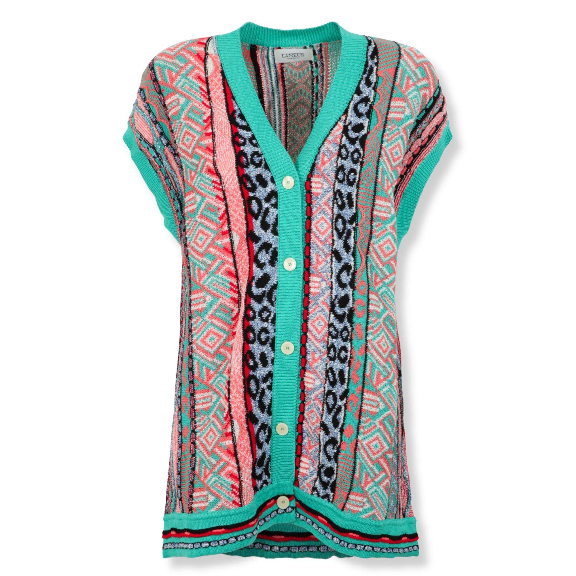 Cardigan Jacquard Multifilo Laneus. Linea oversize, smanicato. Design in cotone con trama jacquard multicolore, profili a costine in contrasto e abbottonatura frontale.