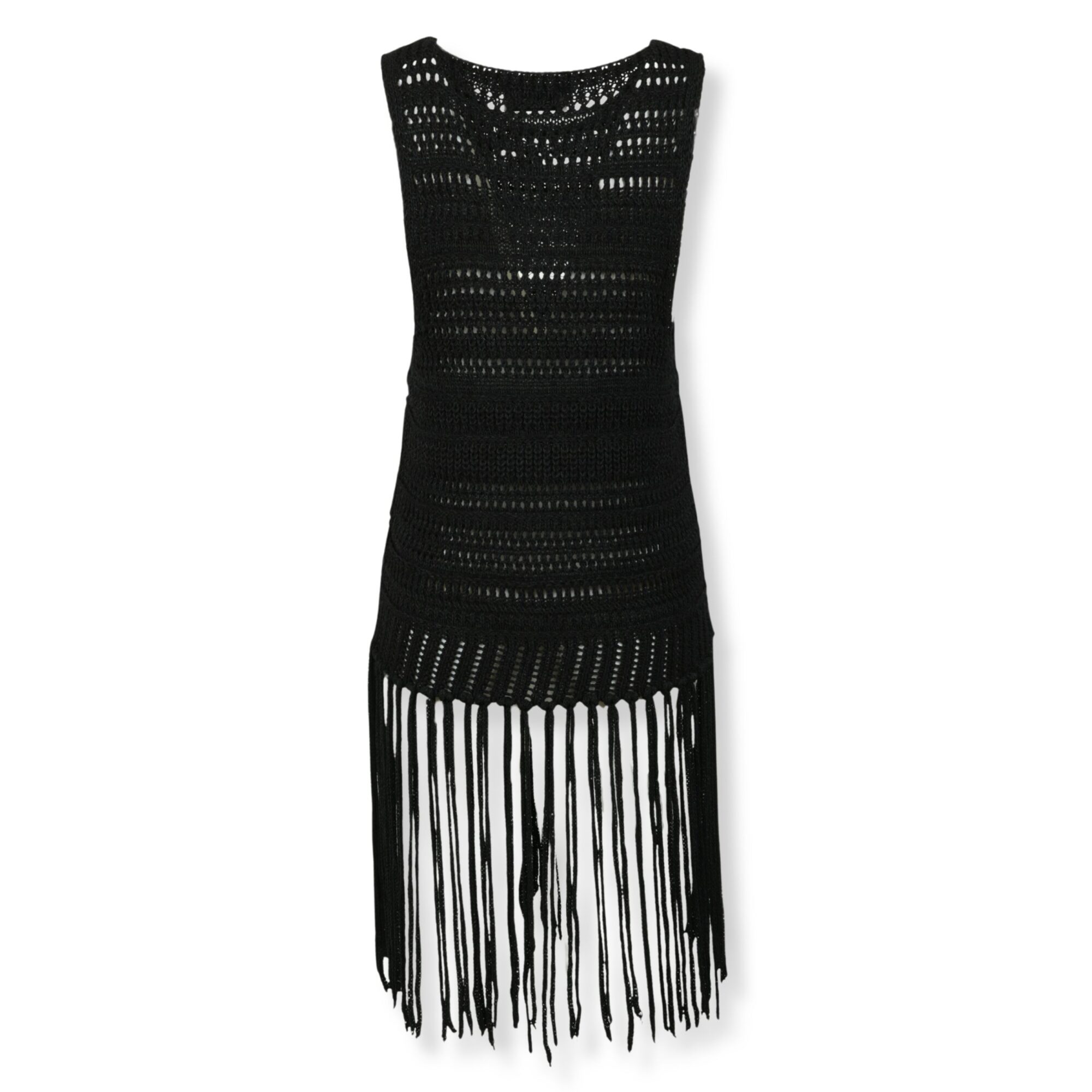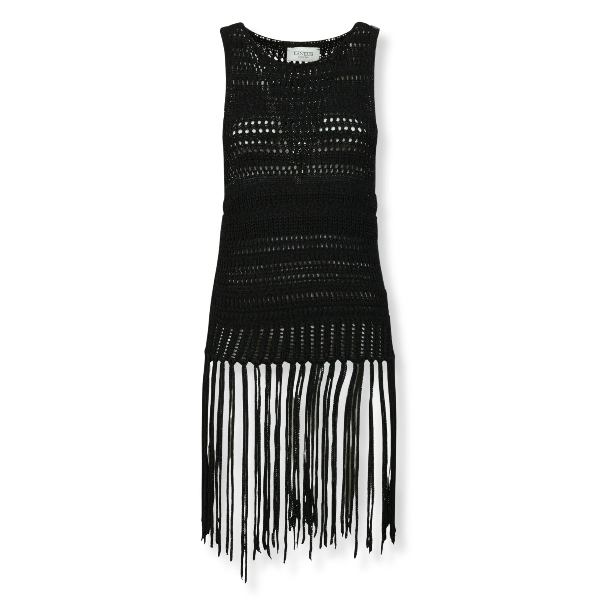 Top con frange Laneus. Smanicato con lavorazione a maglia e scollo rotondo, fondo con frange lunghe.