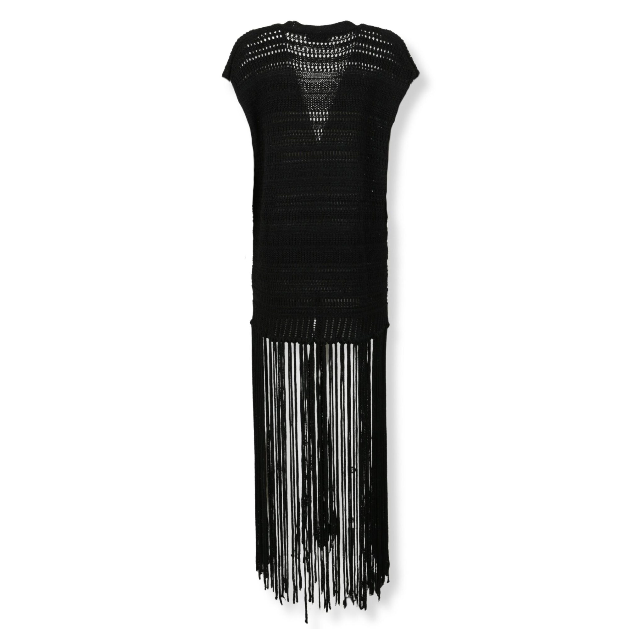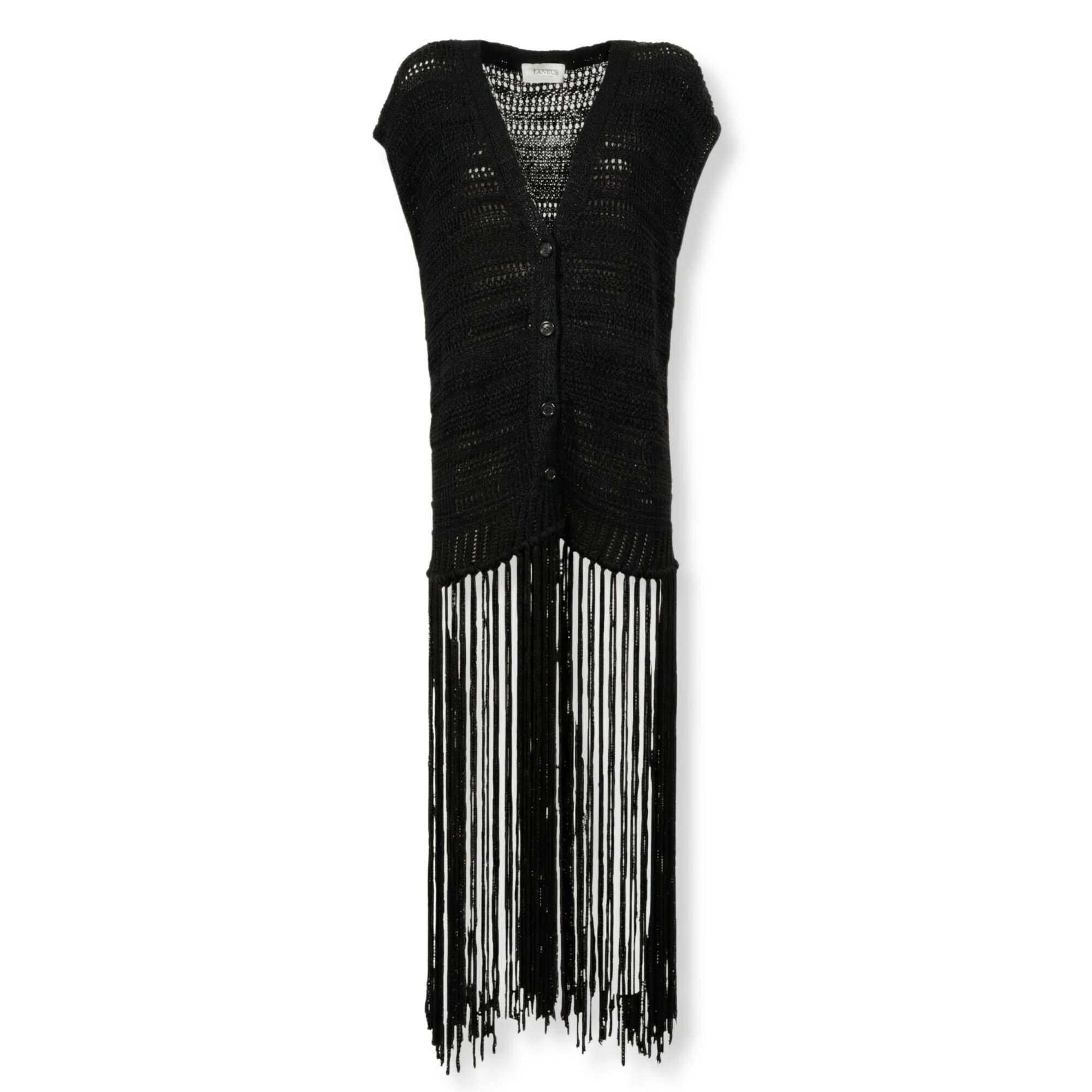 Maxi Cardigan con frange Laneus. Lavorazione a maglia e chiusura frontale con bottoni, fondo con frange lunghe.