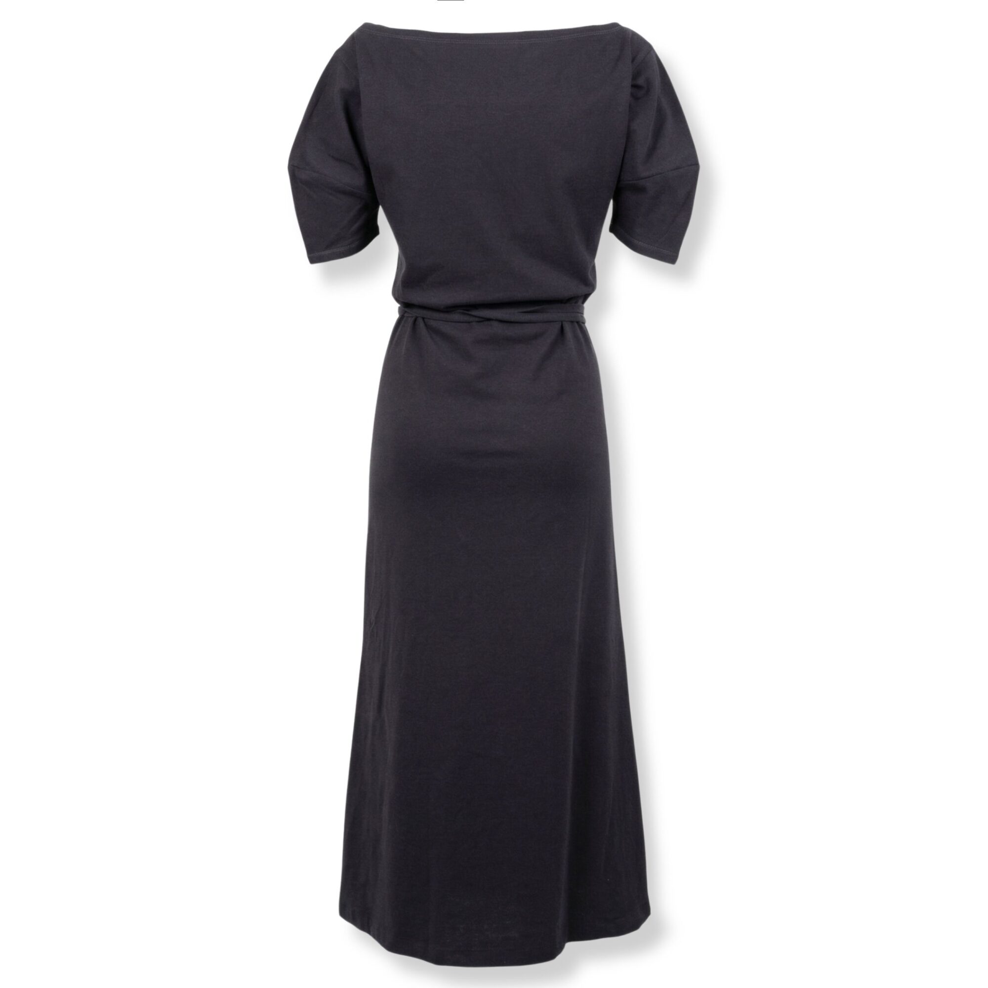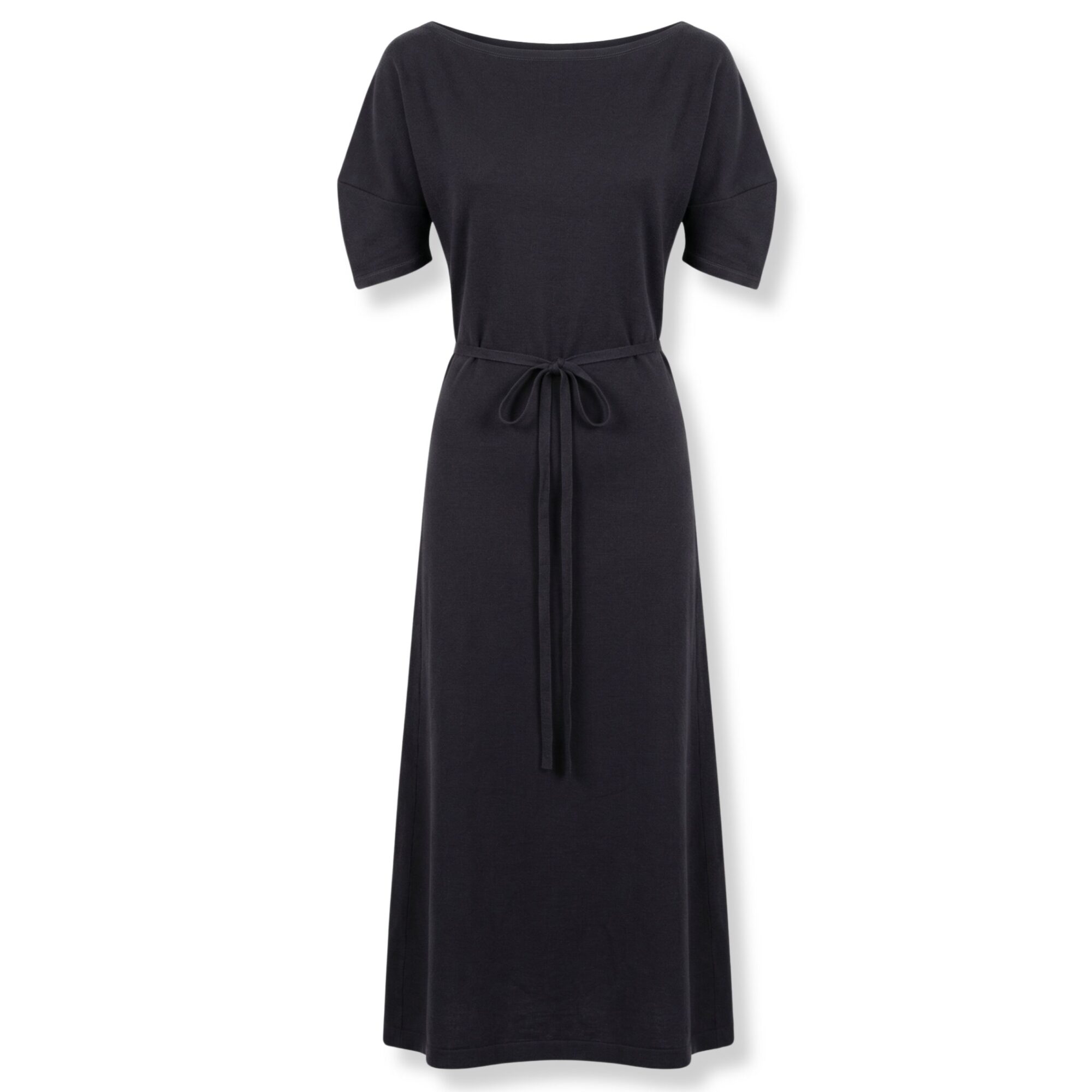 Abito a spalle scoperte Lemaire in jersey di cotone e lino pesante. Taglio aderente, scollo a barca e maniche corte. Cintura coordinata a doppio giro da annodare in vita.