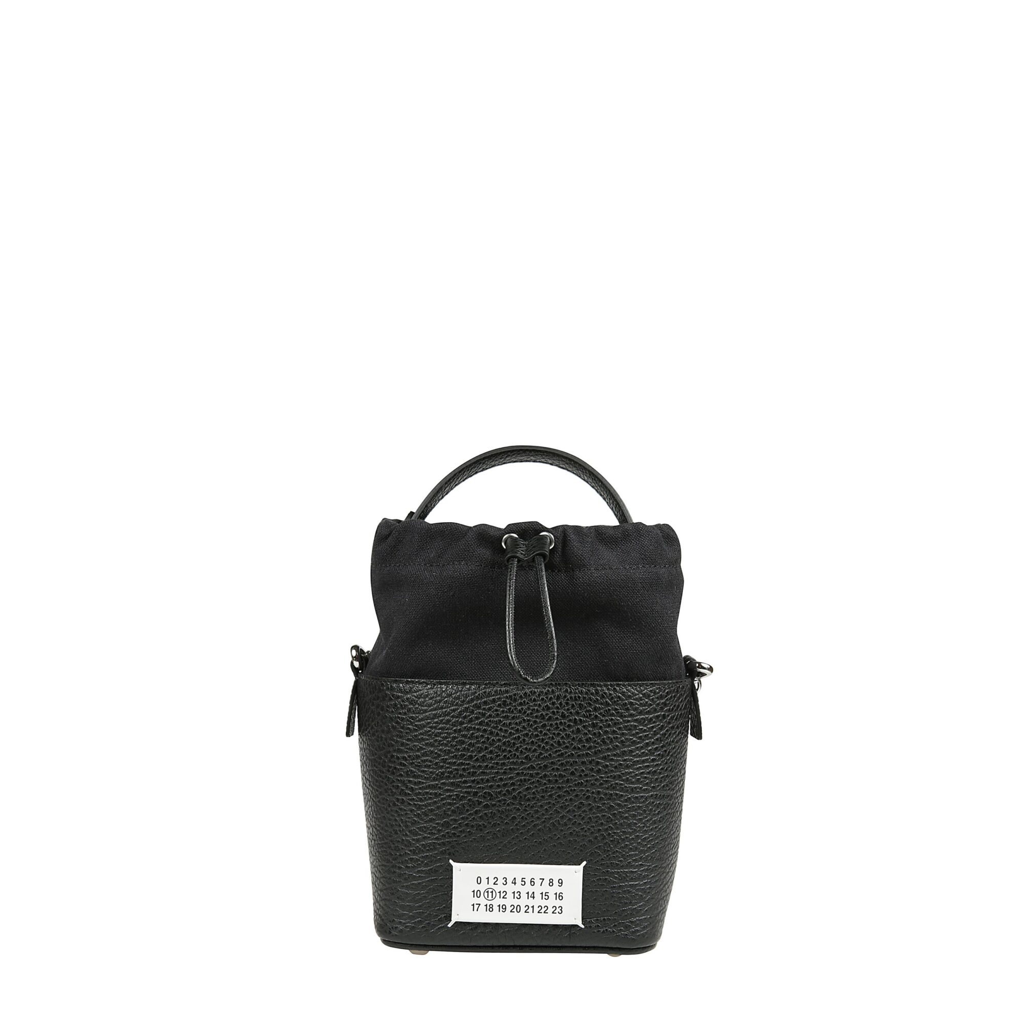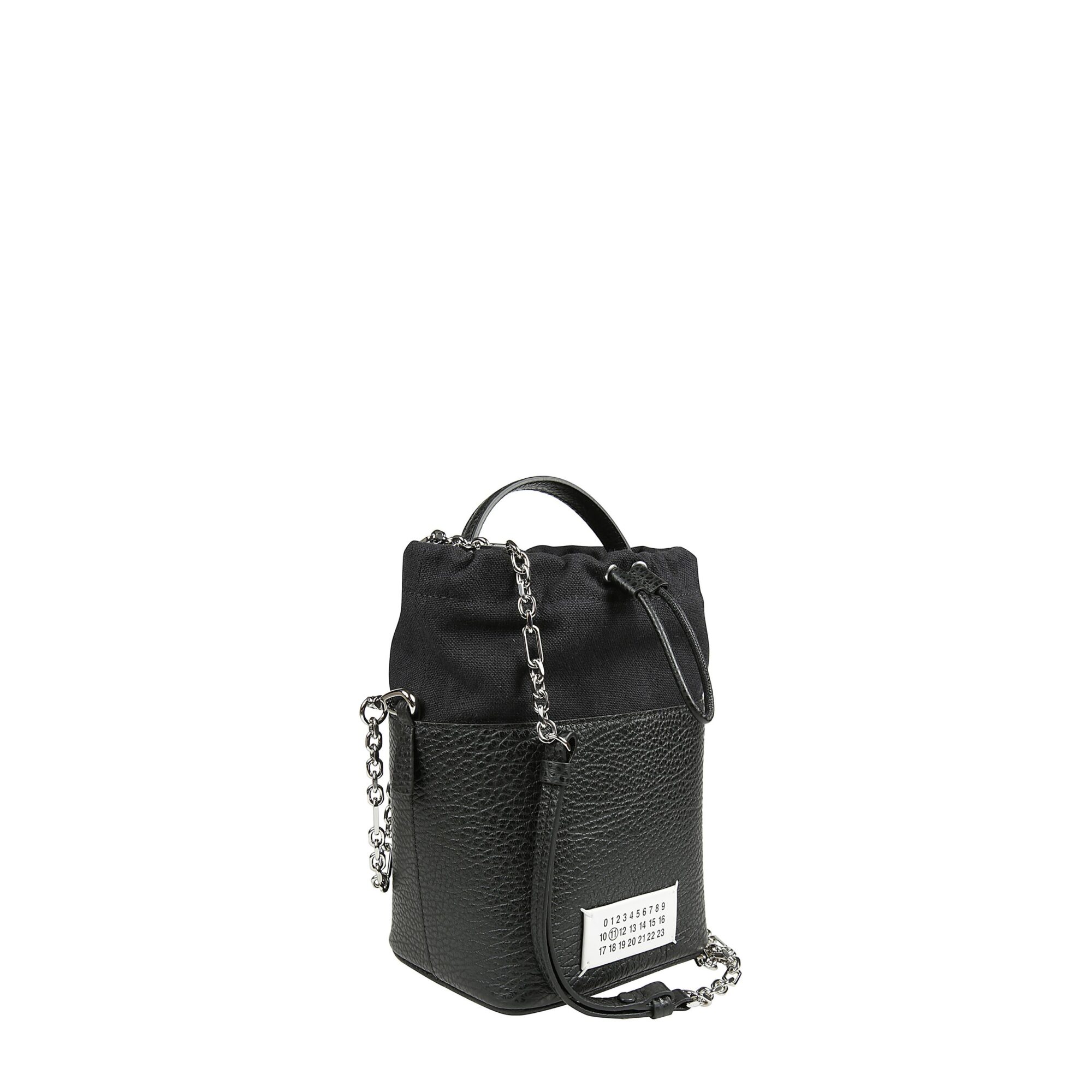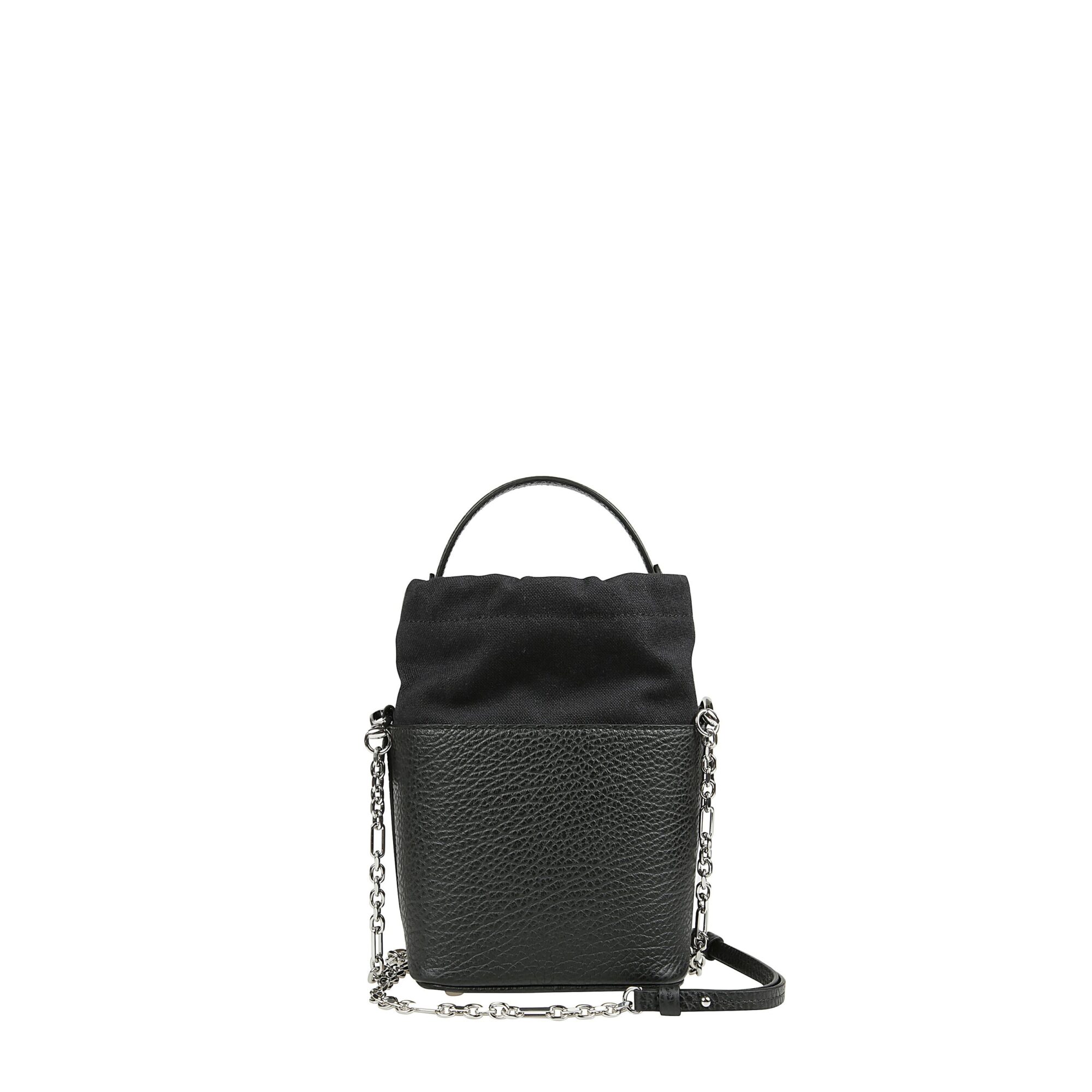 Realizzato in Italia in pelle nera martellata e canvas, il secchiello firmato Maison Margiela ha un manico in pelle rimovibile, la tracolla a catena color argento e i piedini metallici. Il modello versatile è rifinito con il celebre logo numerico del brand sul davanti.