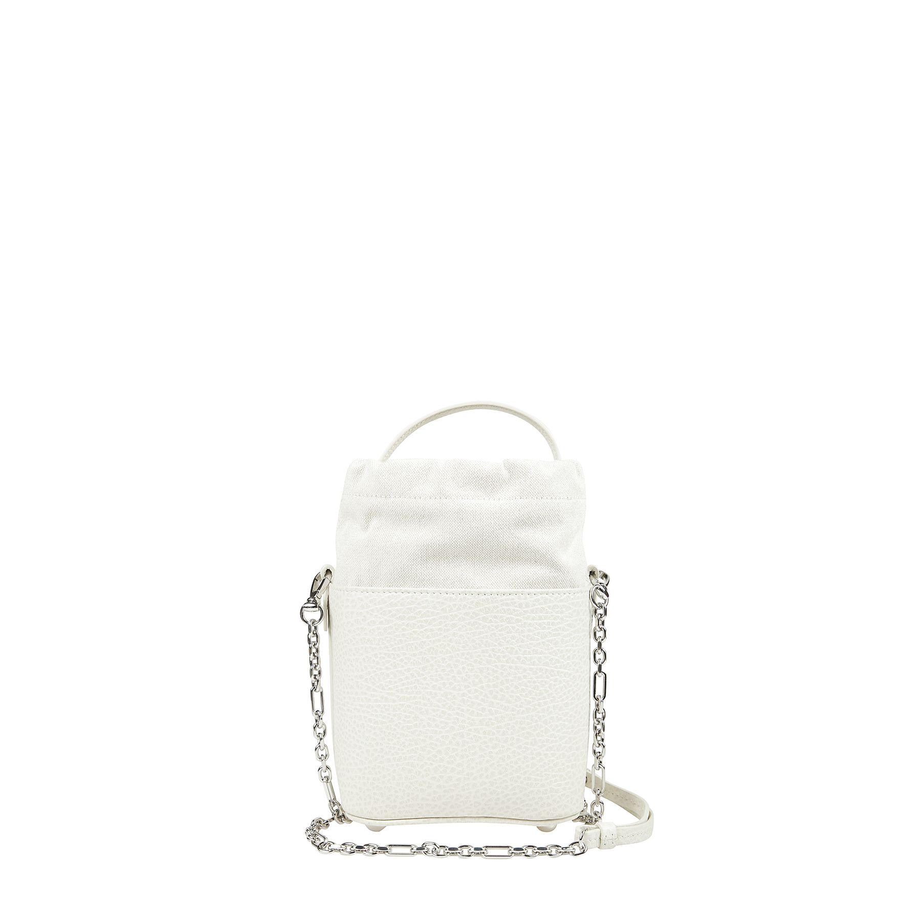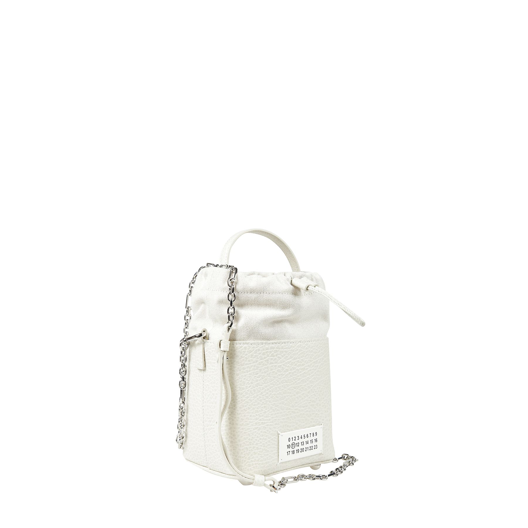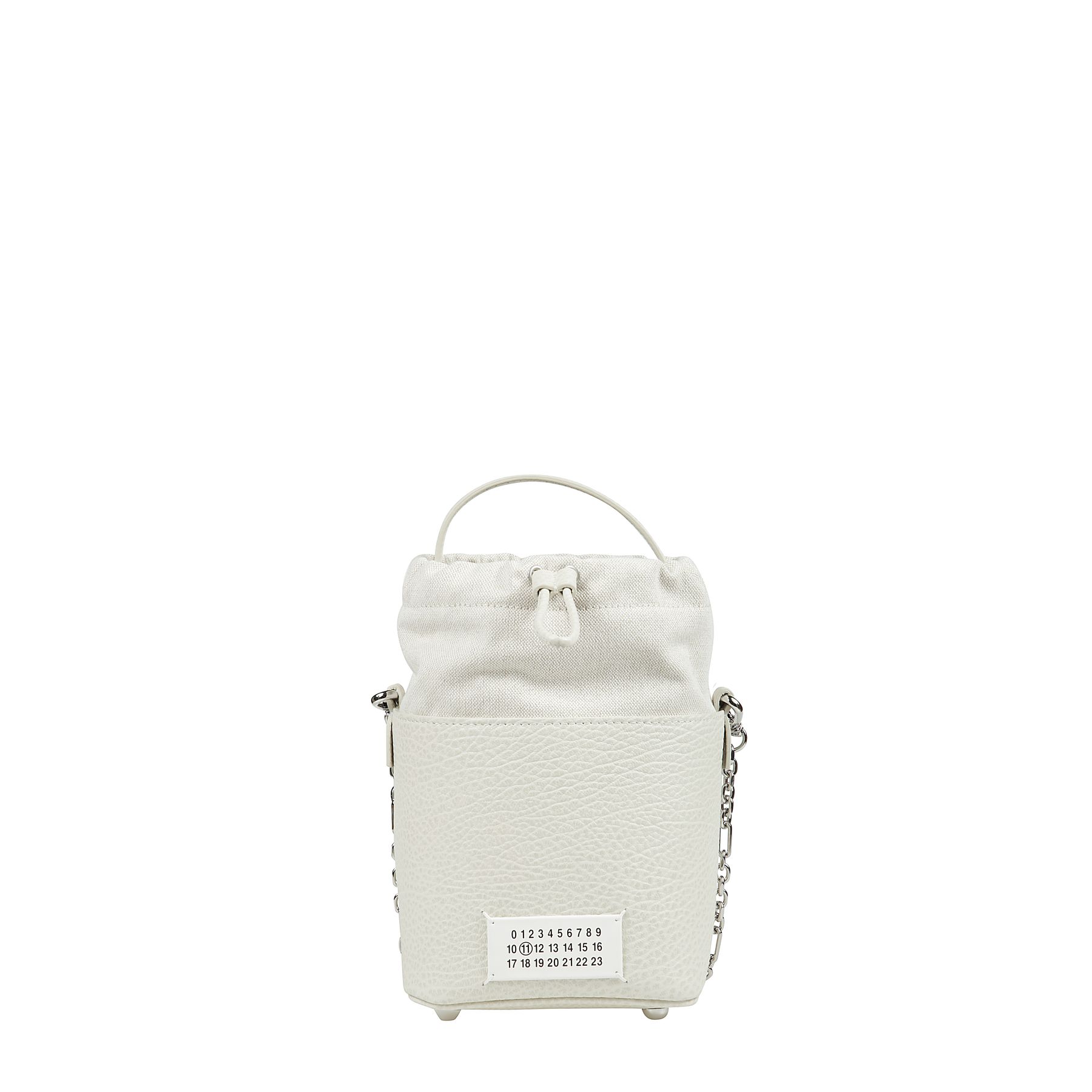 Realizzato in Italia in pelle nera martellata e canvas, il secchiello firmato Maison Margiela ha un manico in pelle rimovibile, la tracolla a catena color argento e i piedini metallici. Il modello versatile è rifinito con il celebre logo numerico del brand sul davanti.