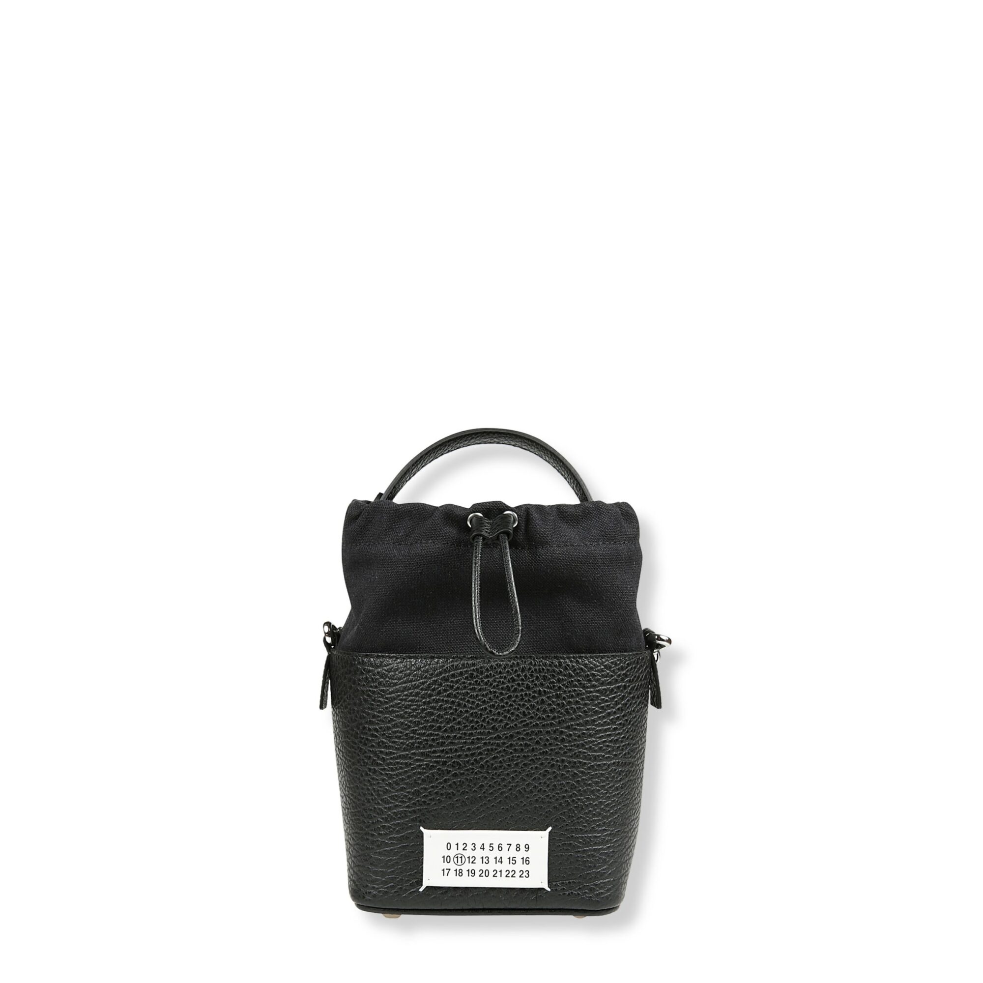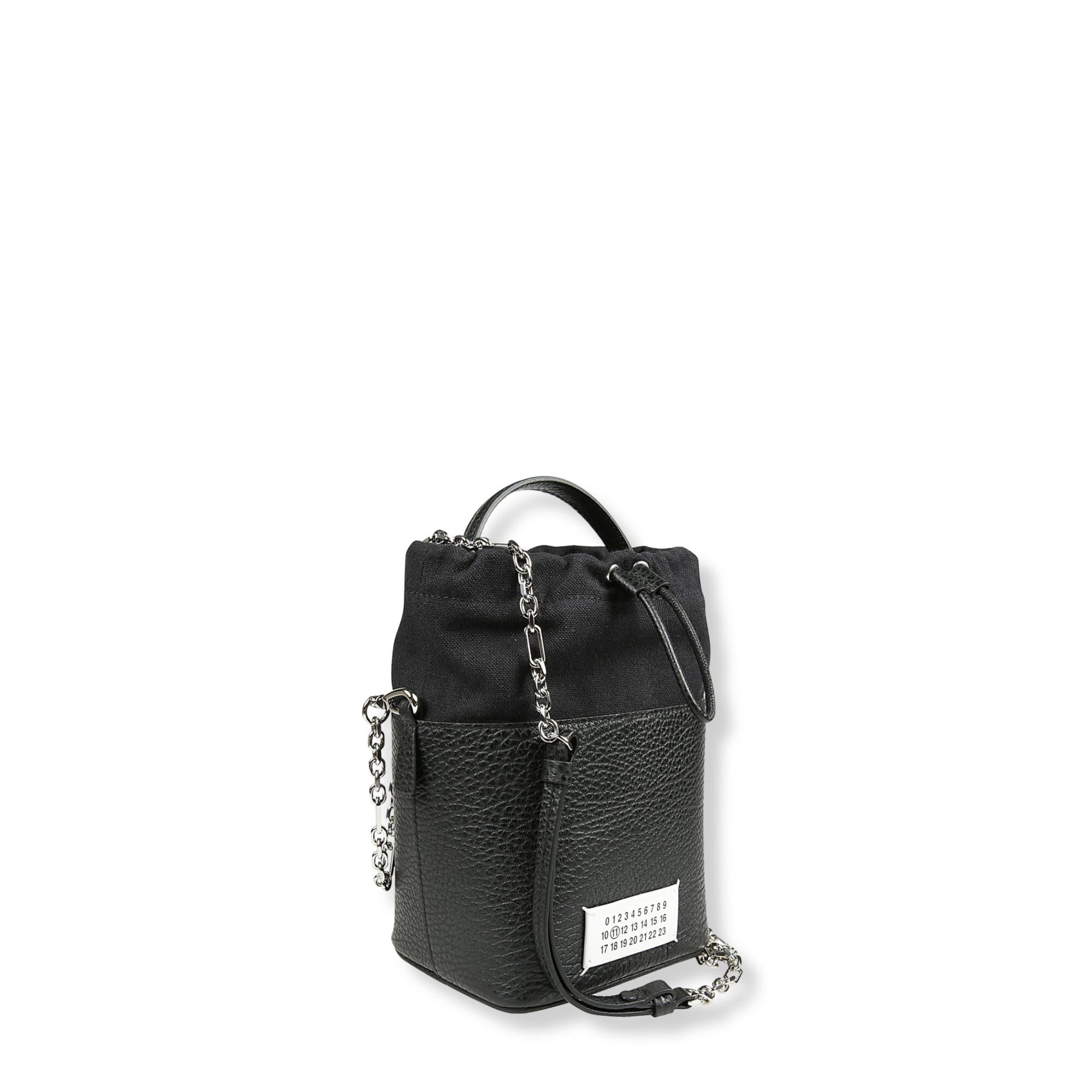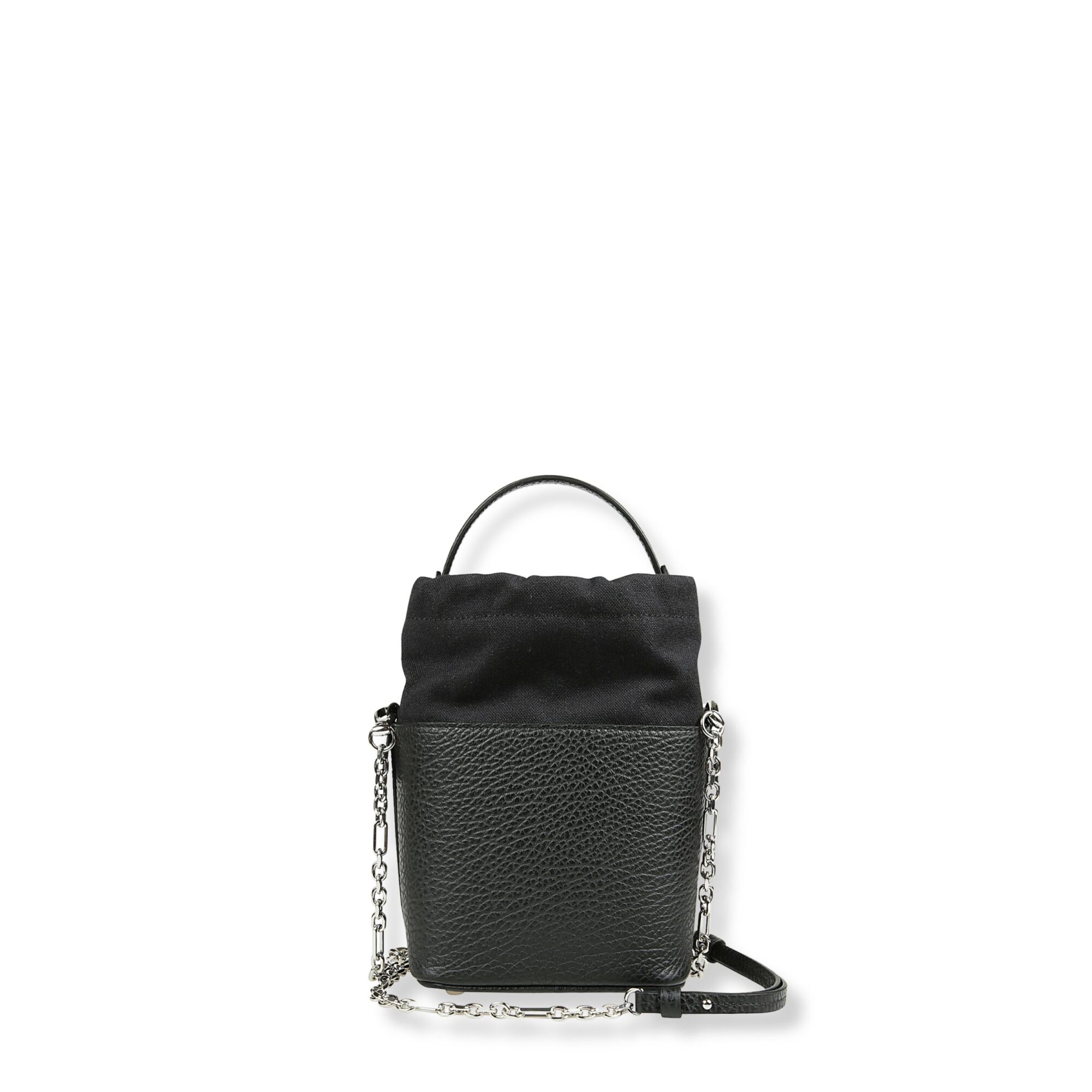 5AC Bucket Small Maison Margiela. Design in pelle martellata e tela di cotone con coulisse superiore. Manico singolo e tracolla a catena.