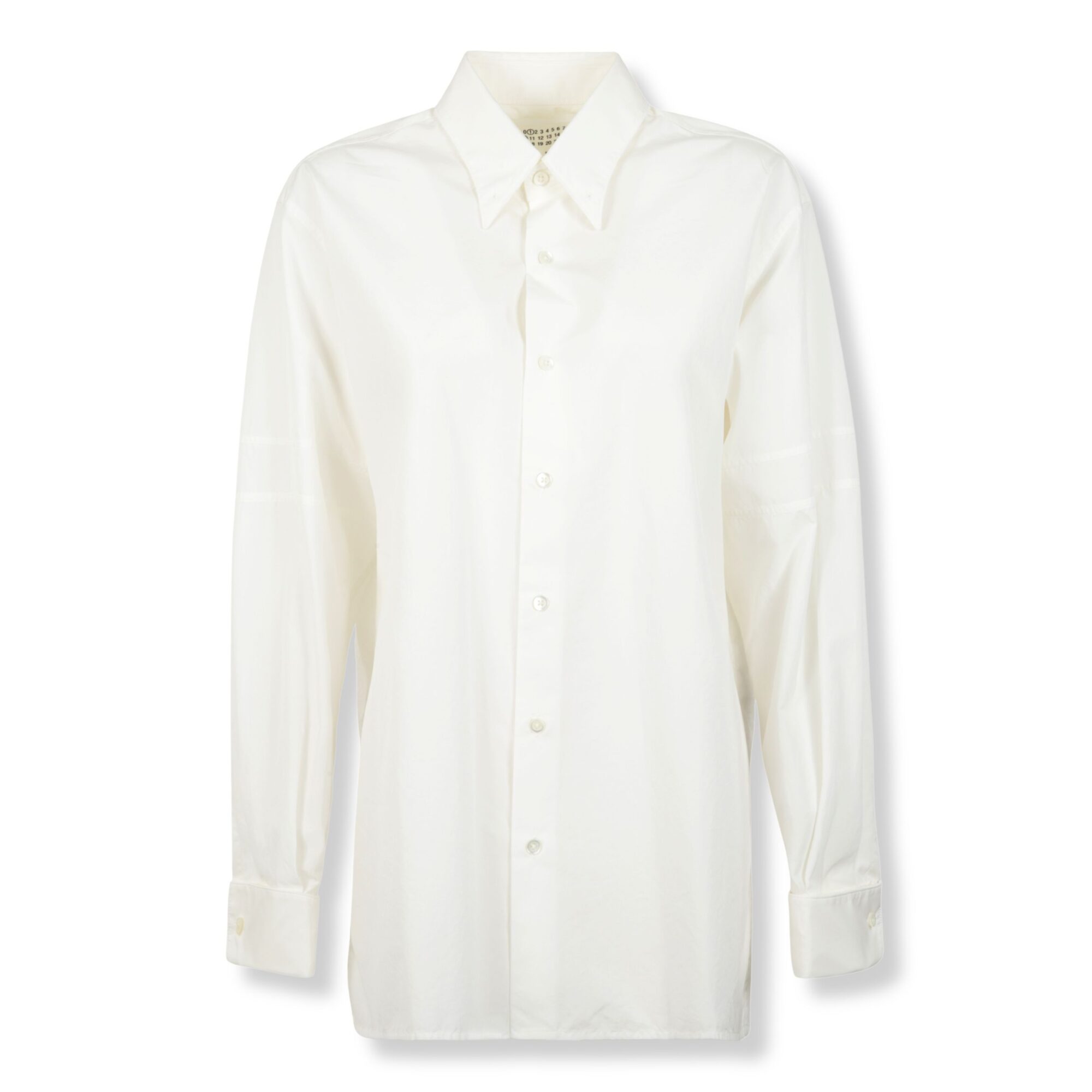 Camicia Maison Margiela in popeline di cotone. Silhouette fluida, colletto a punta e abbottonatura frontale, maniche rifinite con cuciture orizzontali a vista.