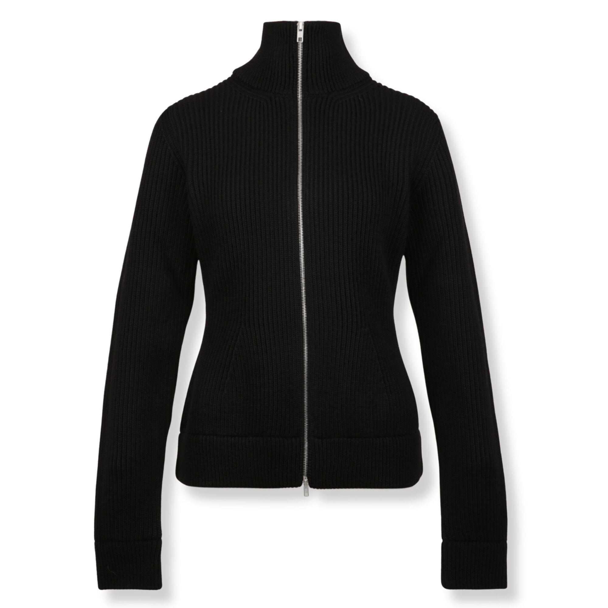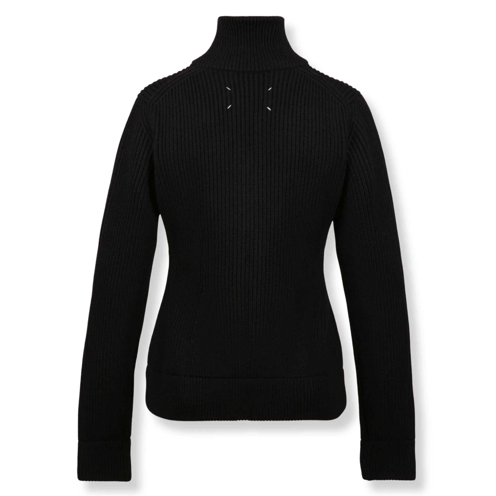 Cardigan in lana con zip Maison Margiela. Lavorazione a costine verticali, scollo alto a imbuto, spalle scolpite. Orlo inferiore e polsini ampi. Retro con logo Four Stitches del brand.