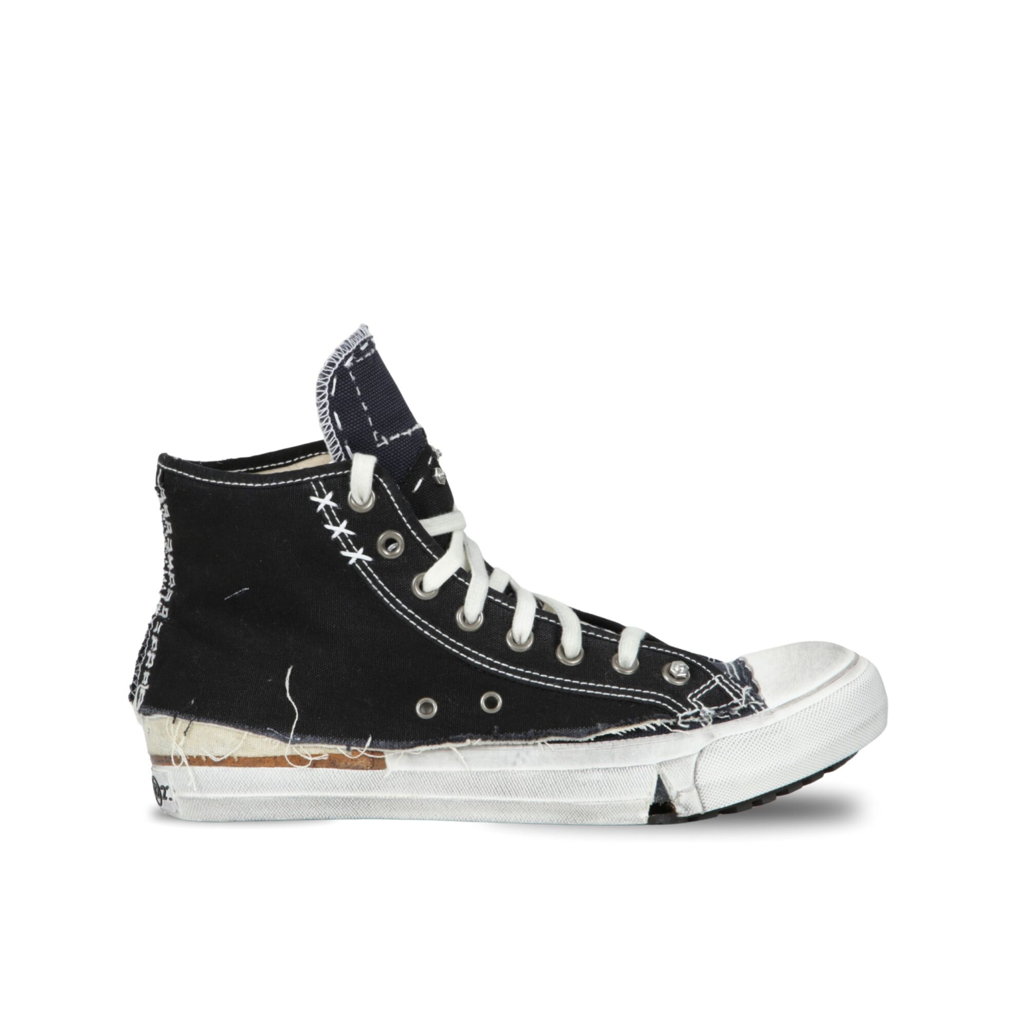 Sneakers Love to Death Maison Margiela. Design high-top, in tela stratificata, con tagli e sfrangiature effetto usurato. Cuciture a vista e bordi consumati.