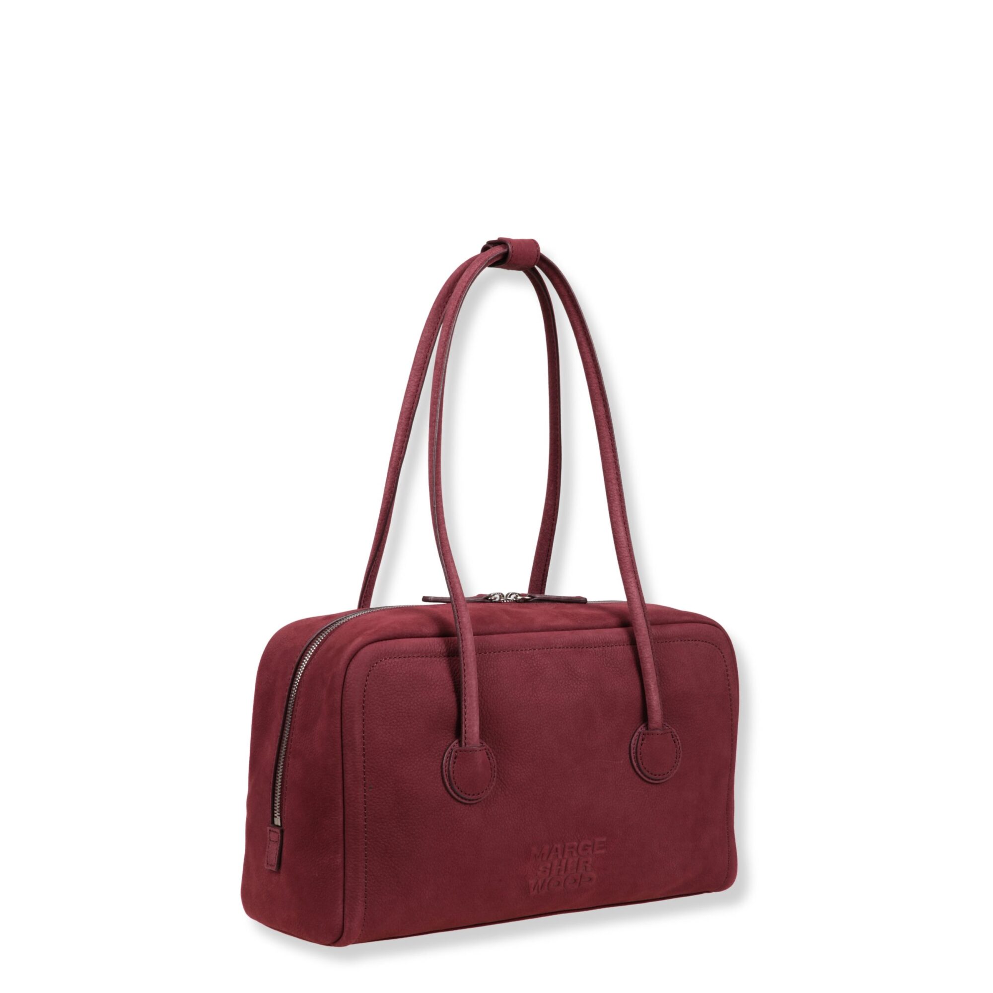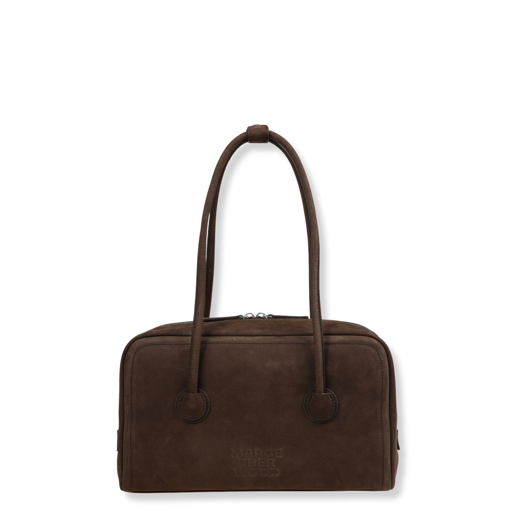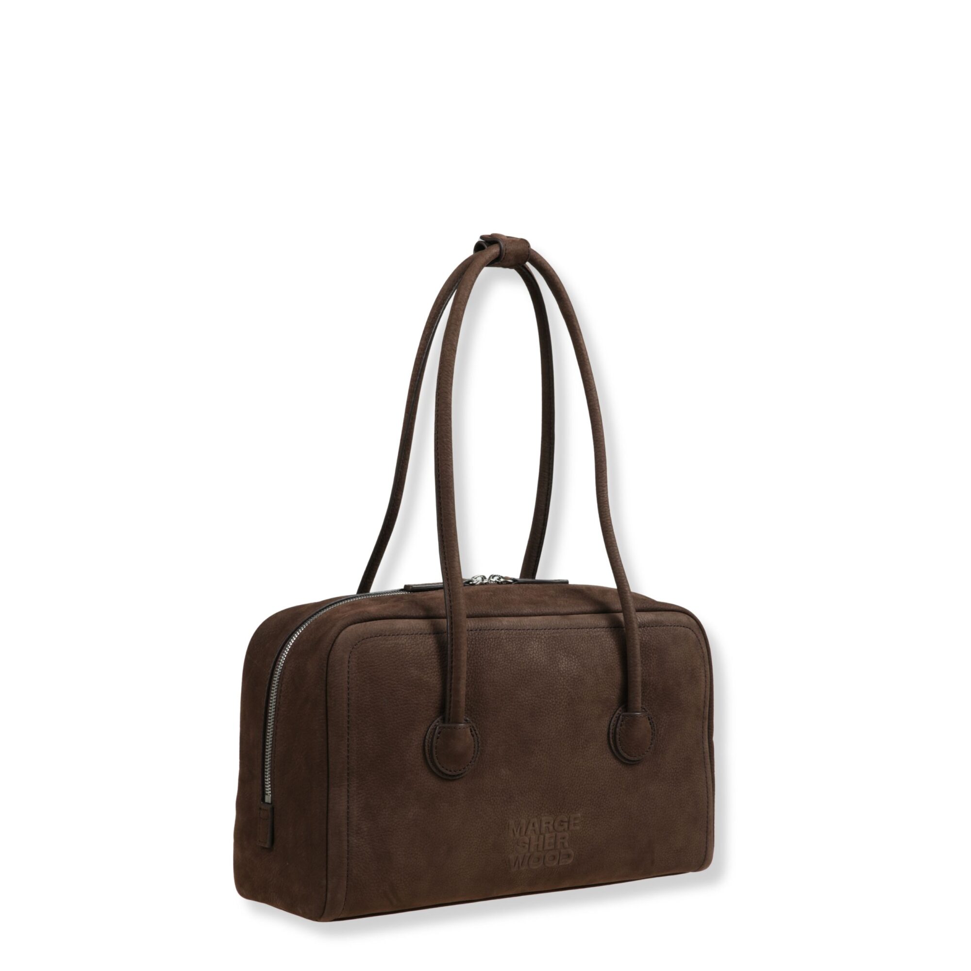 Soft Boston Bag Marge Sherwood. Corpo in pelle effetto nabuck, con logo del brand impresso sul pannello frontale. Chiusura superiore a cerniera e due manici sottili.