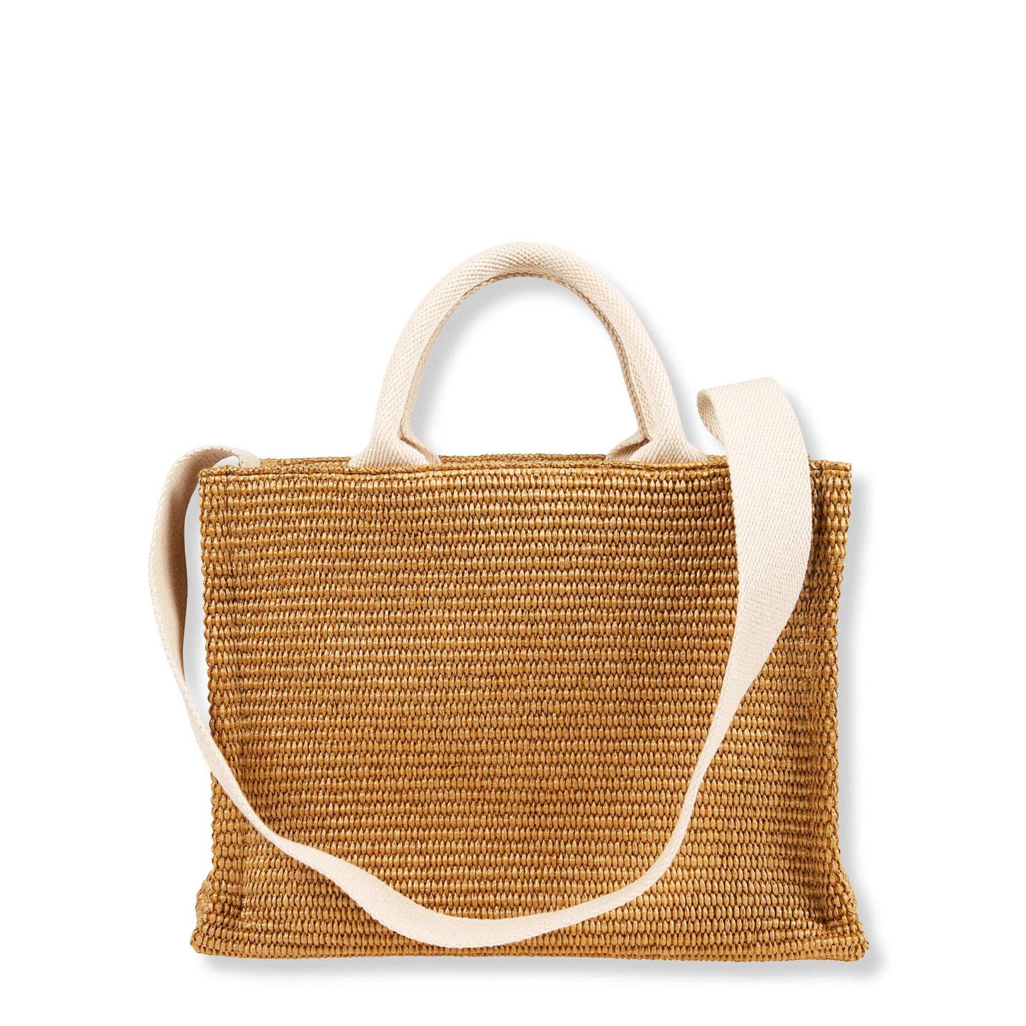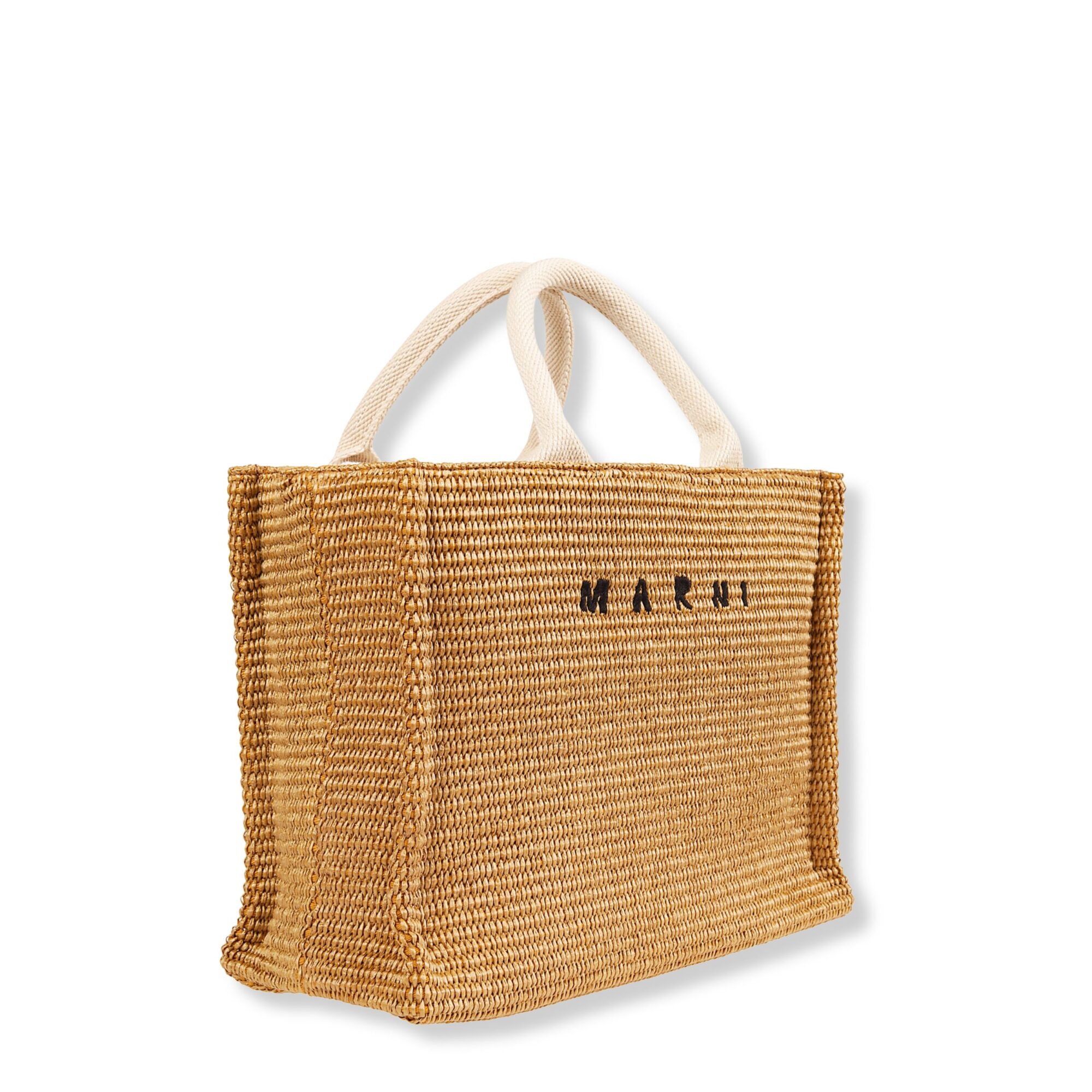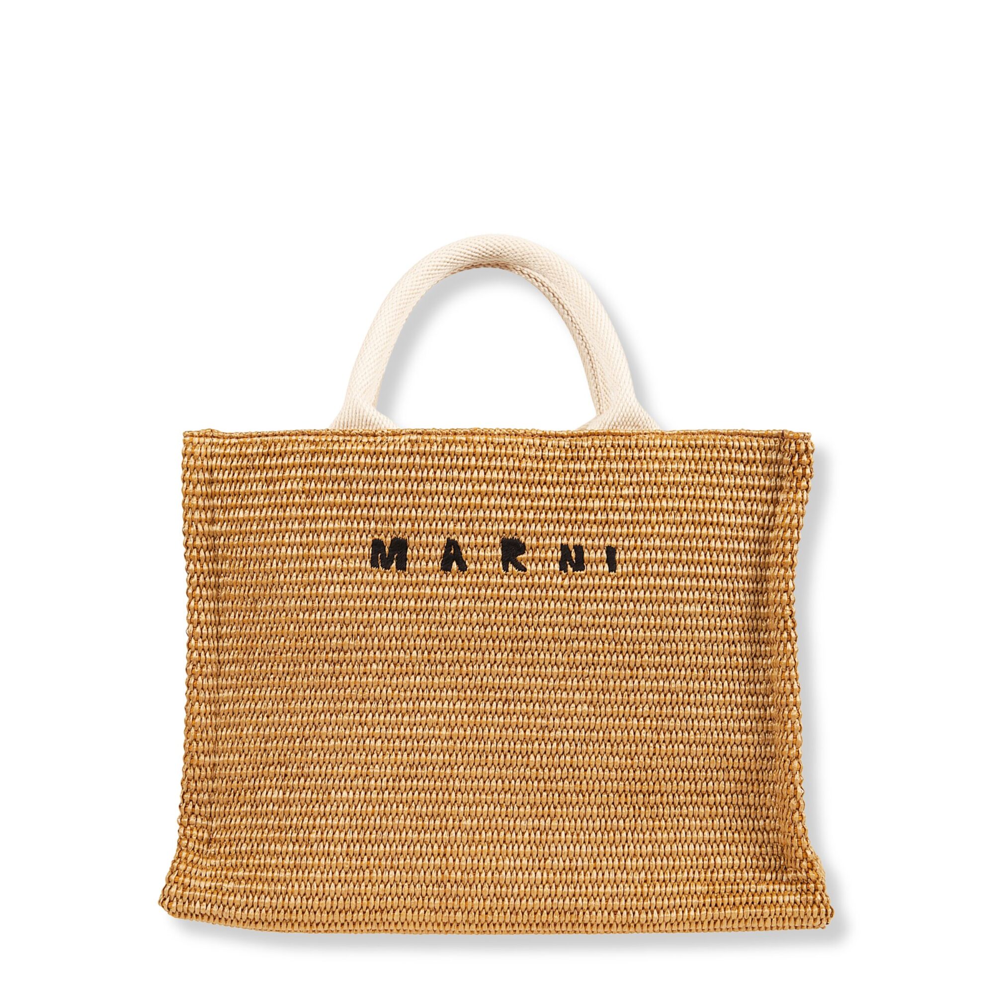 Tote Bag Piccola Marni. Design in tessuto effetto rafia con logo del brand sul davanti. Doppio manico superiore e tracolla rimovibile in morbido nastro di cotone.