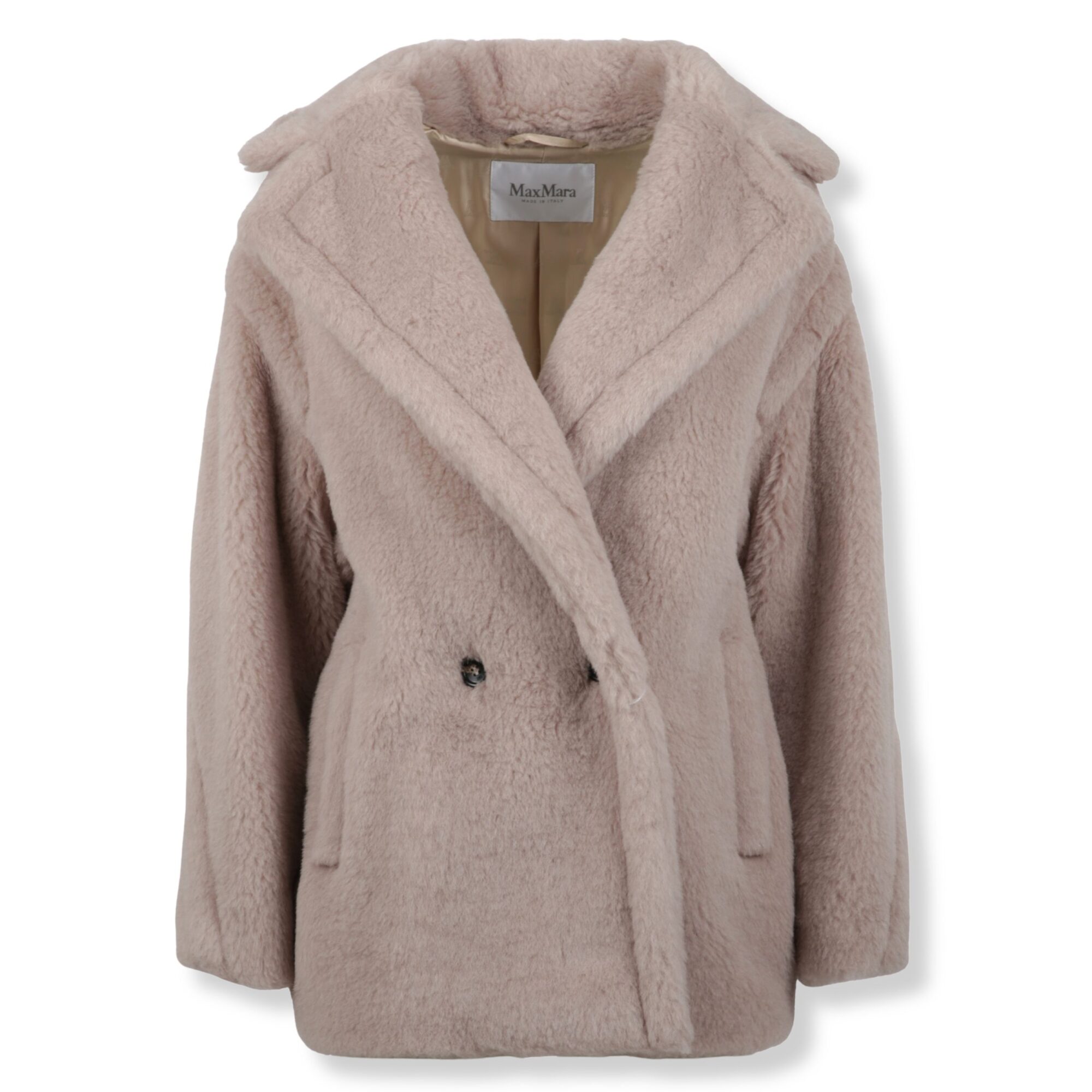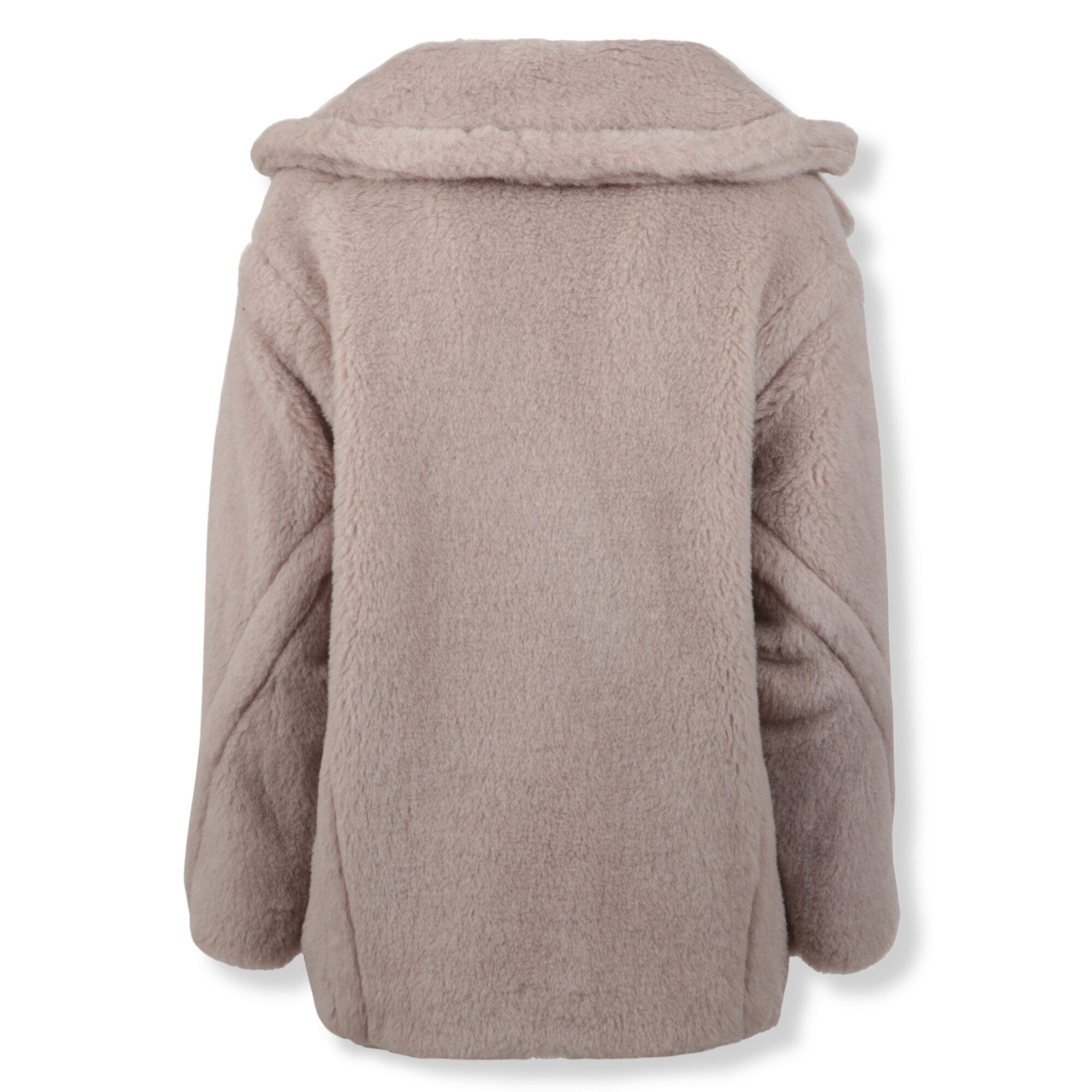 Cappotto Olga Max Mara. Design teddy doppiopetto, con vestibilità oversize e lunghezza sopra al ginocchio. Collo ampio a rever e maniche lunghe a giro basso.