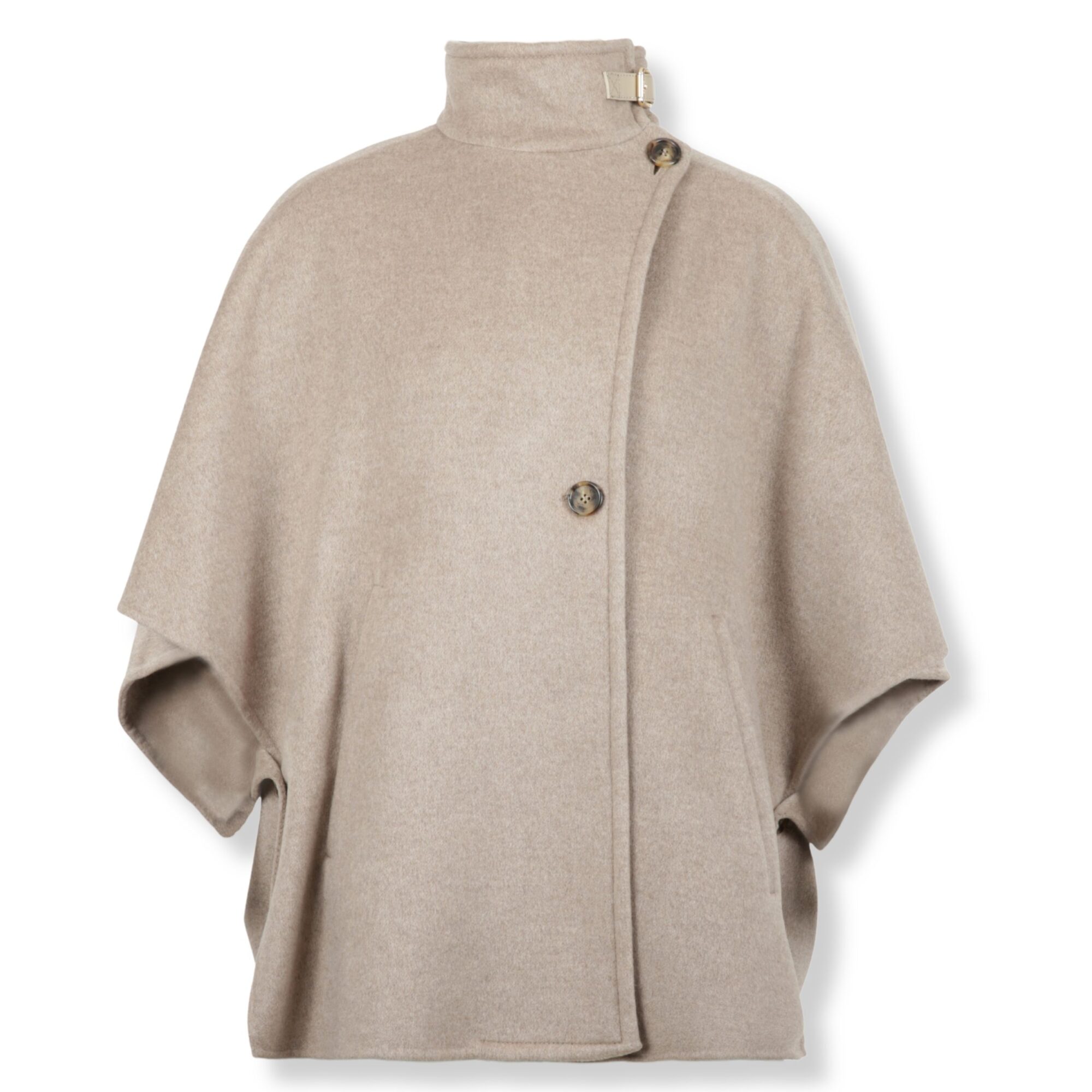 Cappa Derrik Max Mara. Design in drap cachemire leggero, linea leggermente svasata, con profondi spacchi laterali. Collo a cratere chiuso con alamaro e maniche corte ampie a kimono.