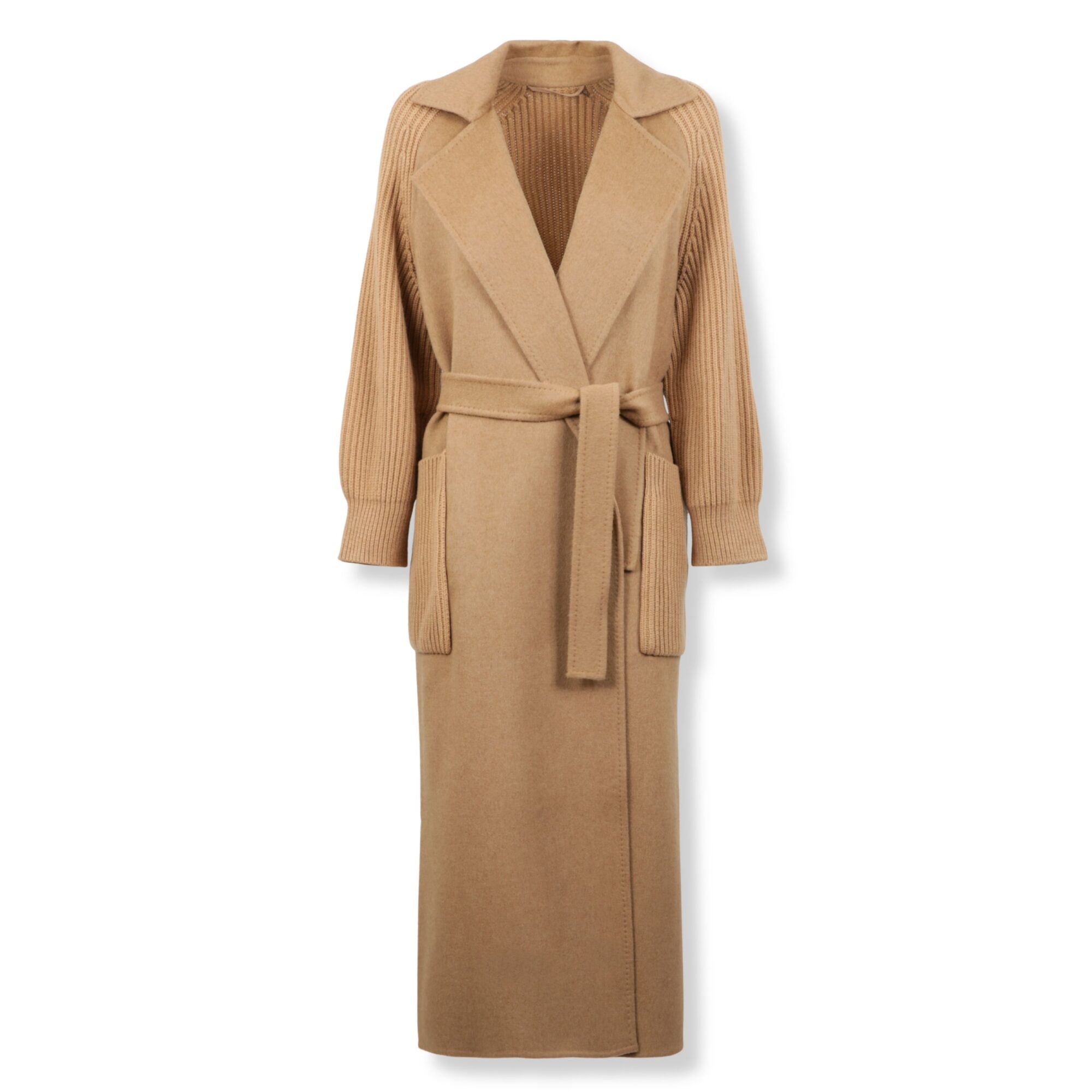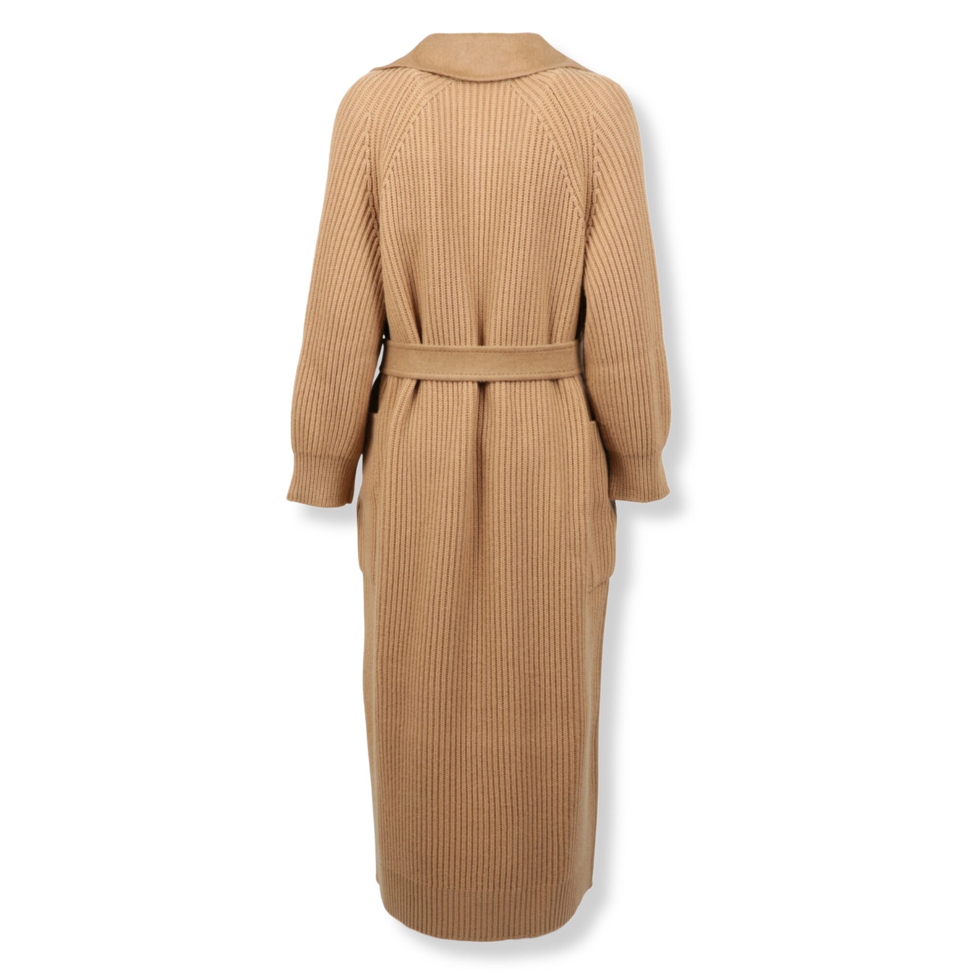 Cappotto Berard Max Mara. Design a vestaglia, con inserti a costa inglese su maniche, schiena e tasche. Collo rever, chiusura con cintura abbinata in vita e grandi tasche applicate sul davanti.