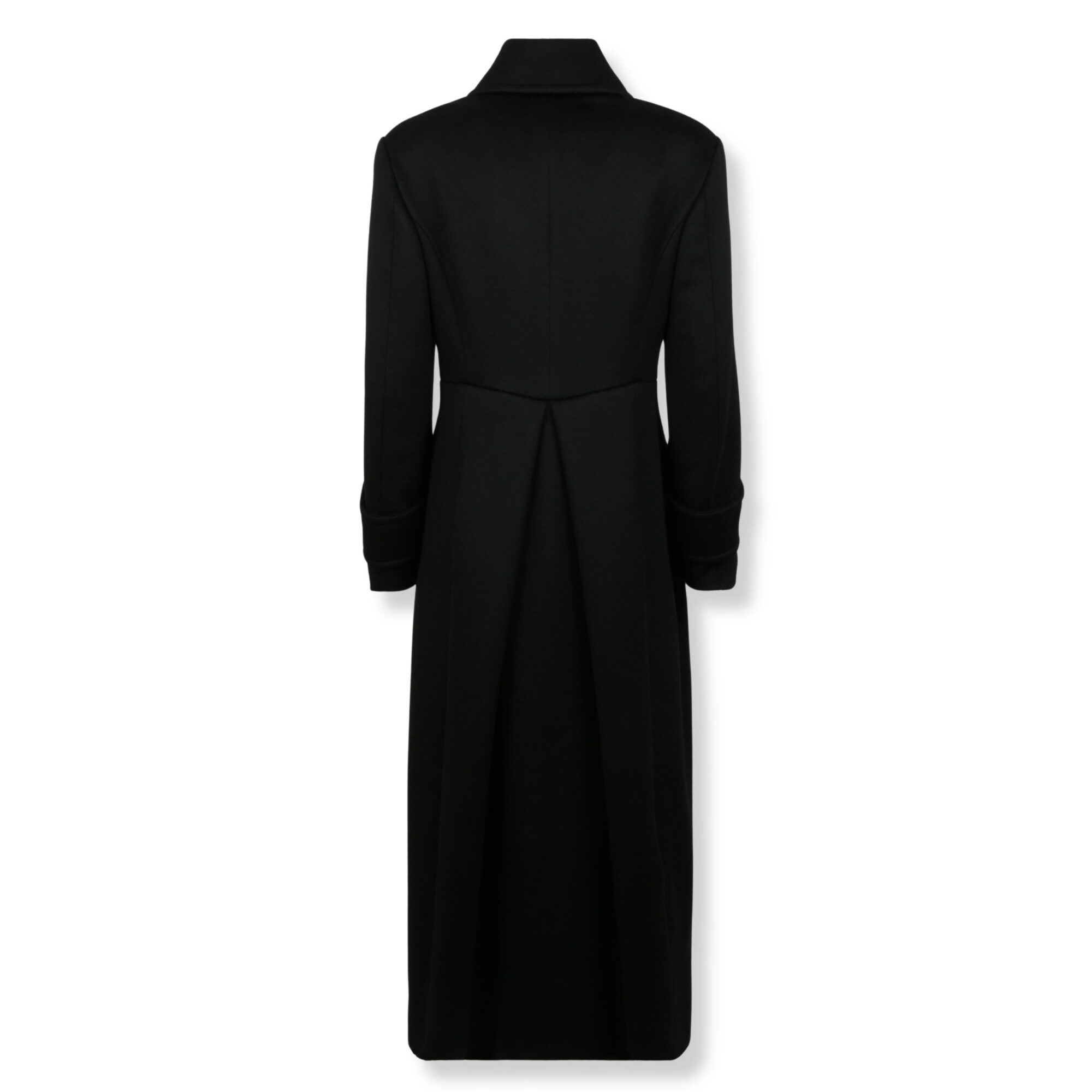 Cappotto Beati Max Mara. Linea dritta, doppiopetto con bottoni e pince in vita. Colletto a camicia, maniche lunghe con alamari sui polsini e tasche a filetto nei fianchi.