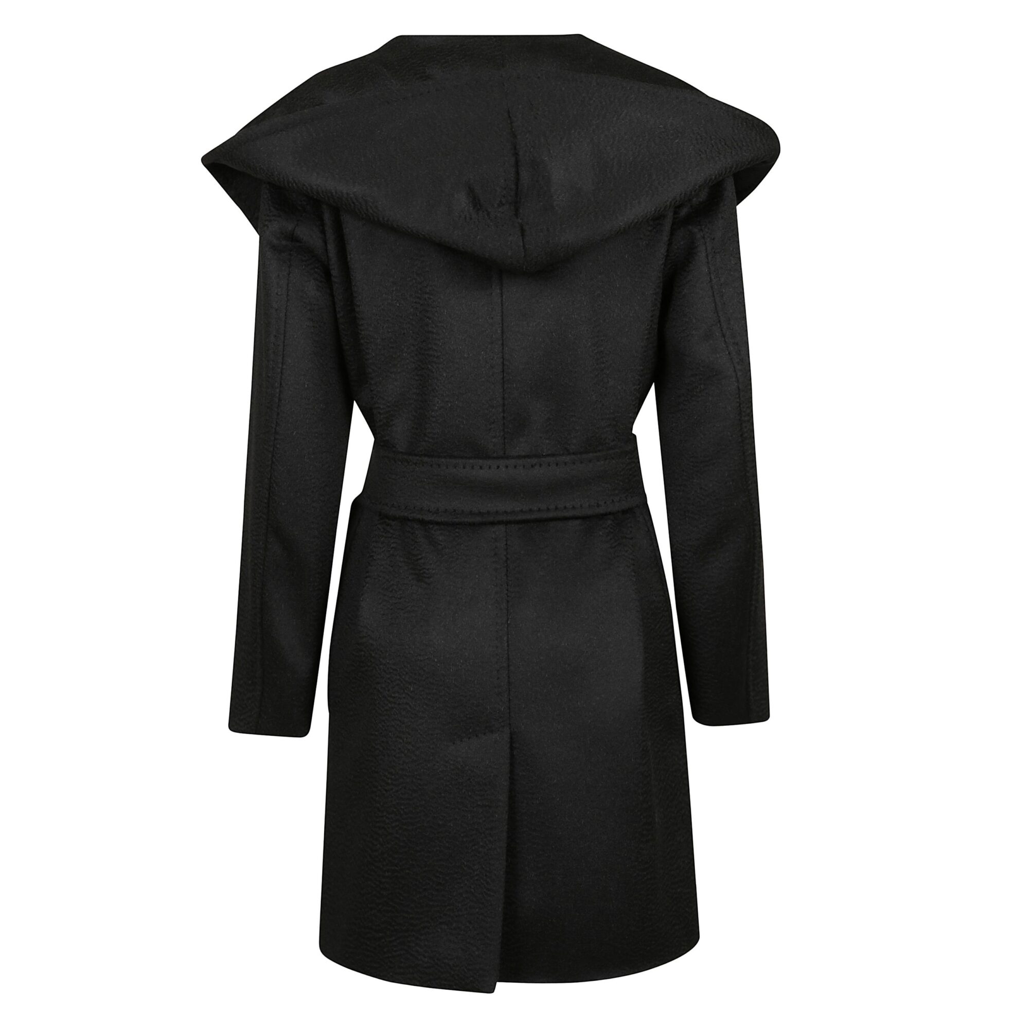 Cappotto Rialto Max Mara. Linea a vestaglia, con cappuccio, con spacco centrale sul retro. Maniche lunghe a giro, tasche applicate sul davanti e chiusura con cintura abbinata.