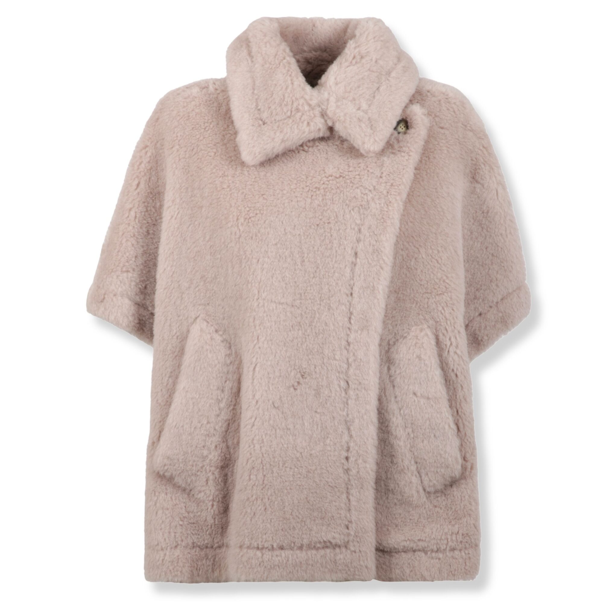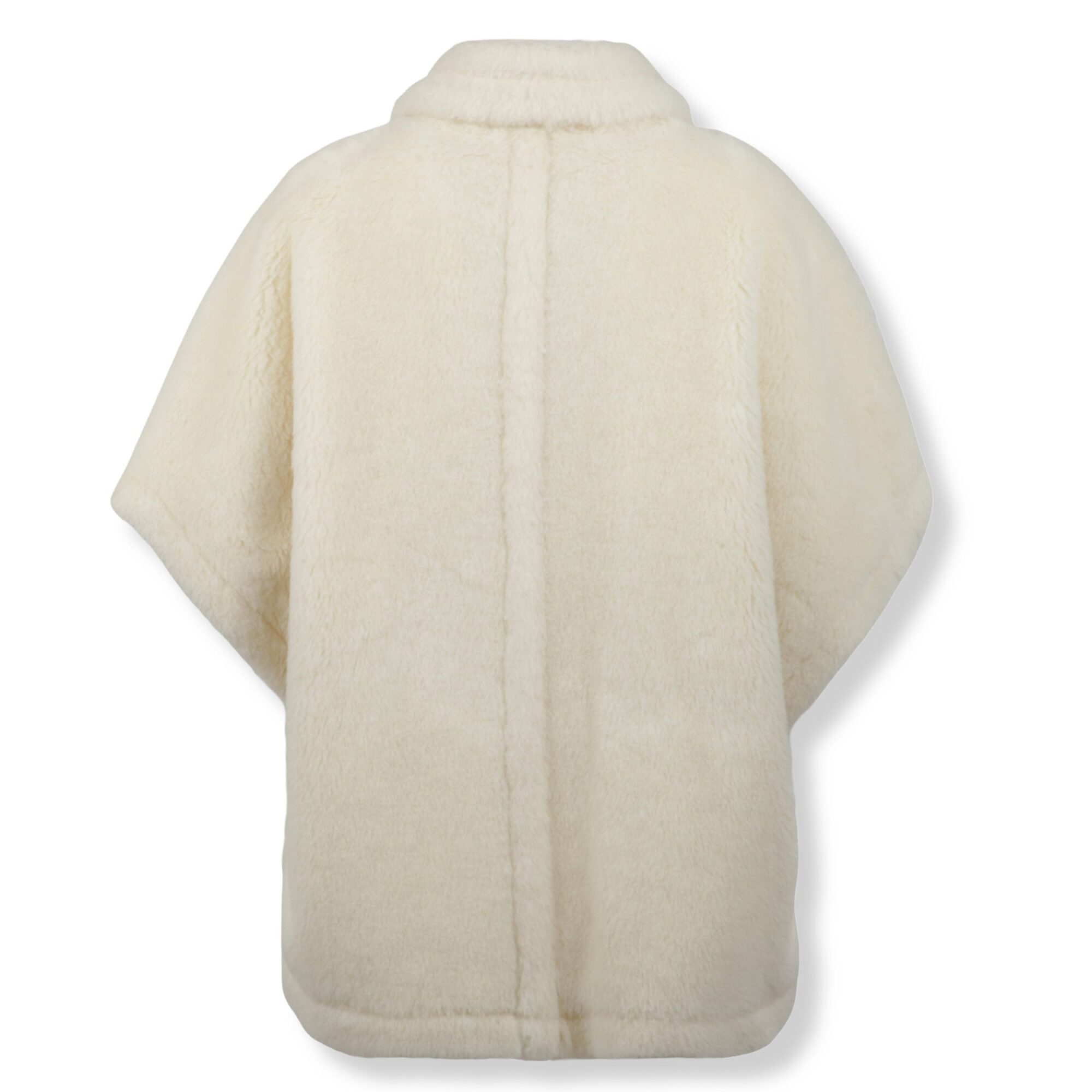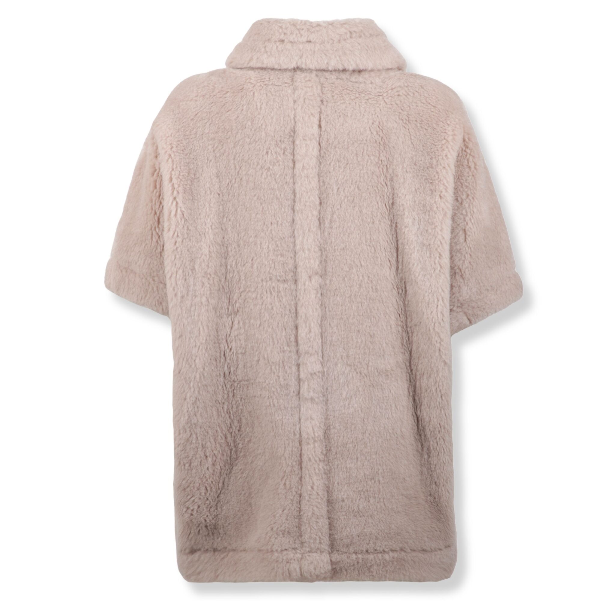 Mantella Tebe Max Mara. Lunghezza corta, in teddy, con chiusura asimmetrica con bottone al collo. Colletto rever, tasche a filetto sui fianchi e maniche corte a kimono.