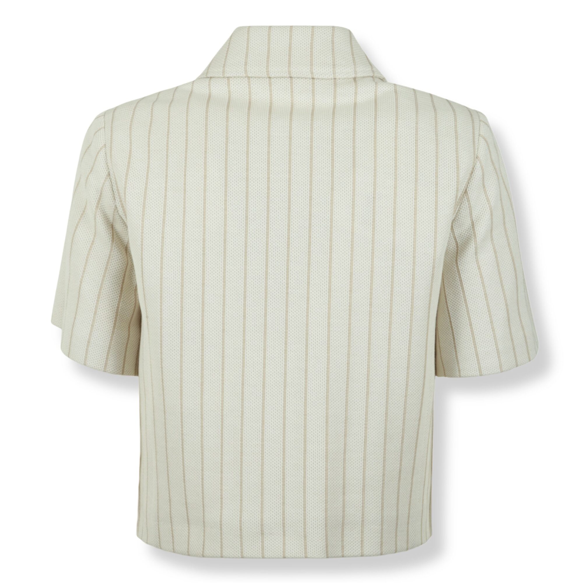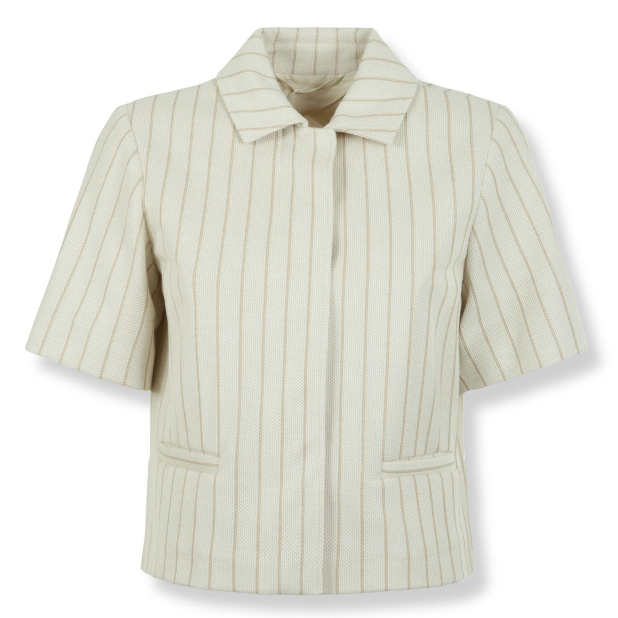 Giacca Mxmangio Max Mara. Design in jersey piquet cotone gessato con taglio boxy. Colletto classico a camicia e maniche corte, chiusura frontale nascosta e tasche filetto.