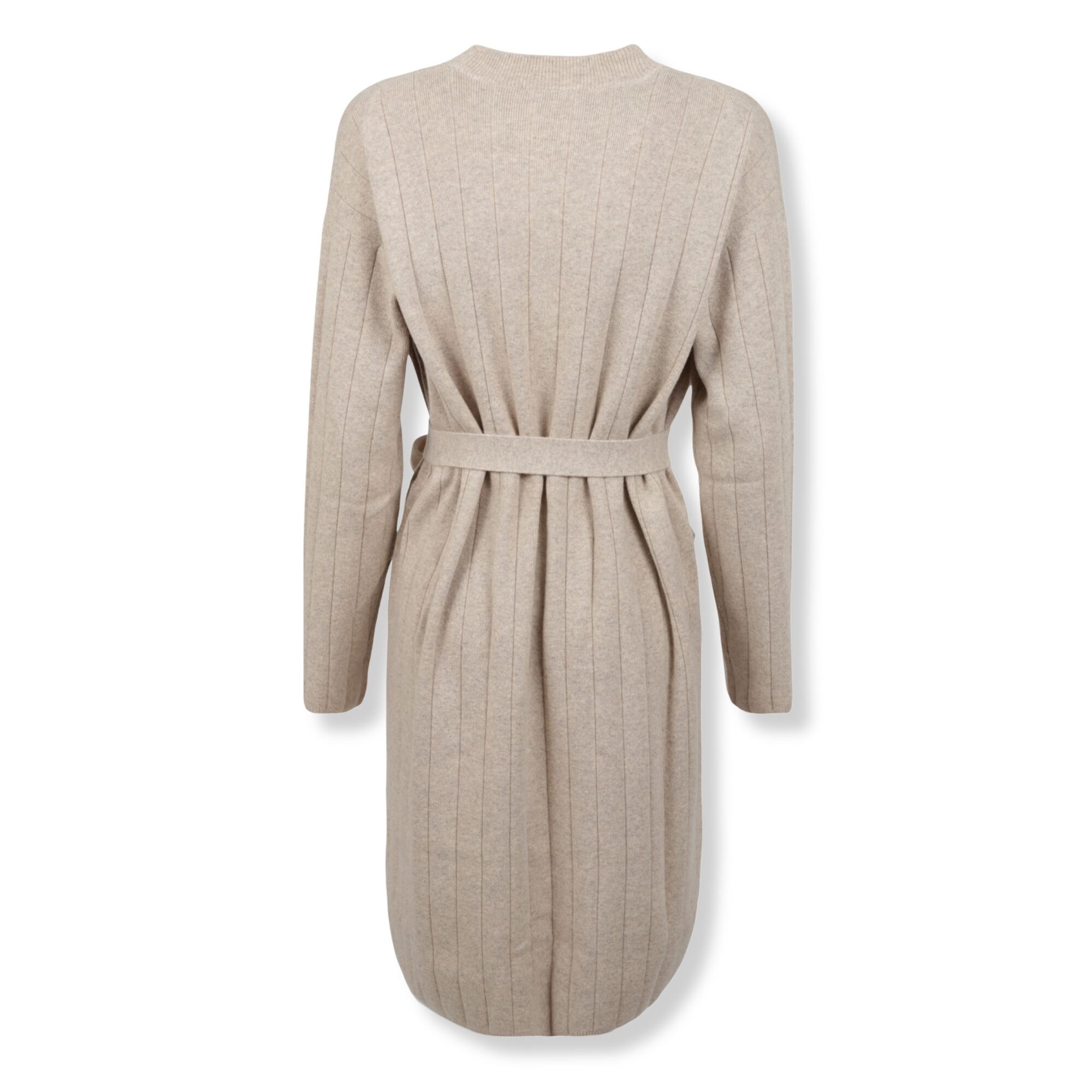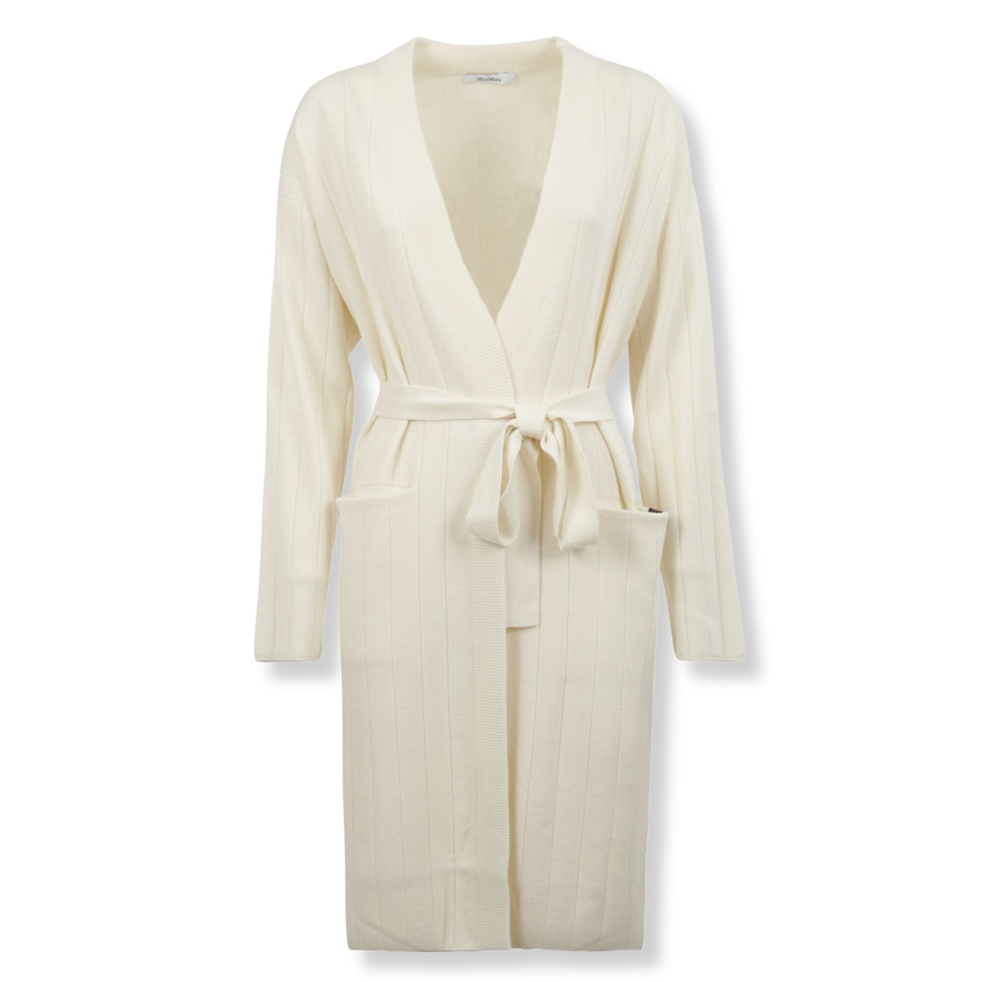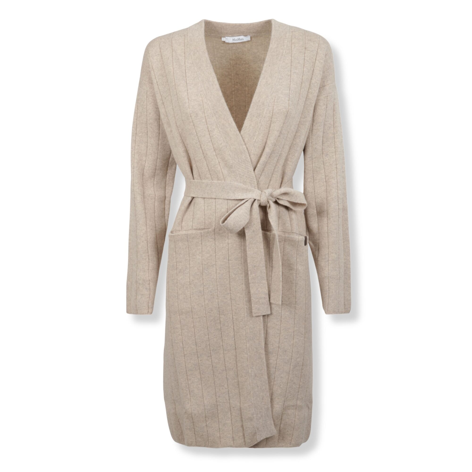 Cardigan Giusto Max Mara. Linea dritta, lavorazione a coste larghe. Chiusura a vestaglia con cintura abbinata e due tasche applicate sul davanti.