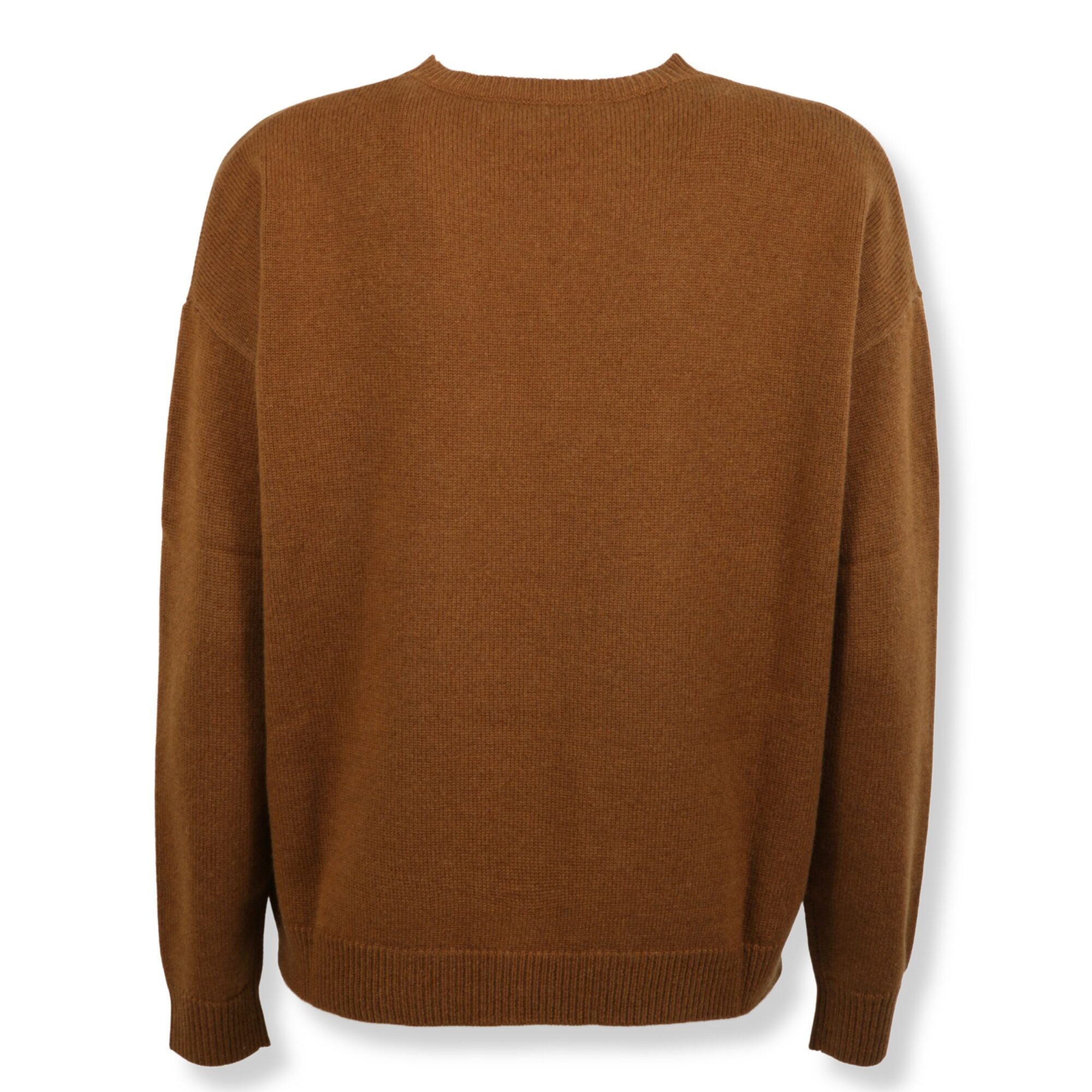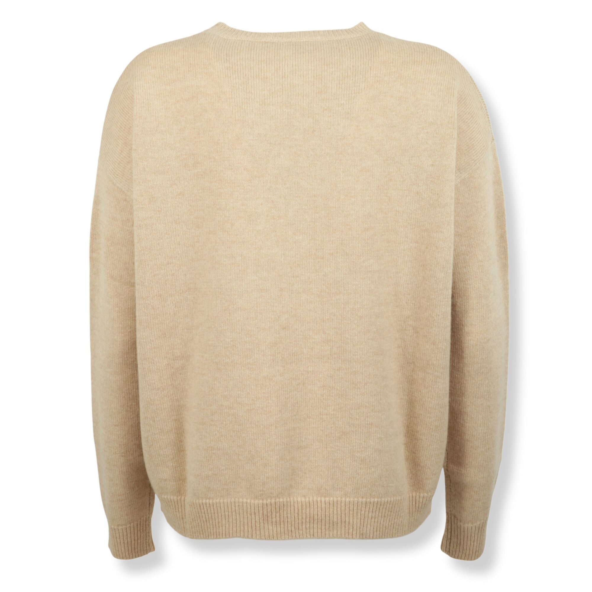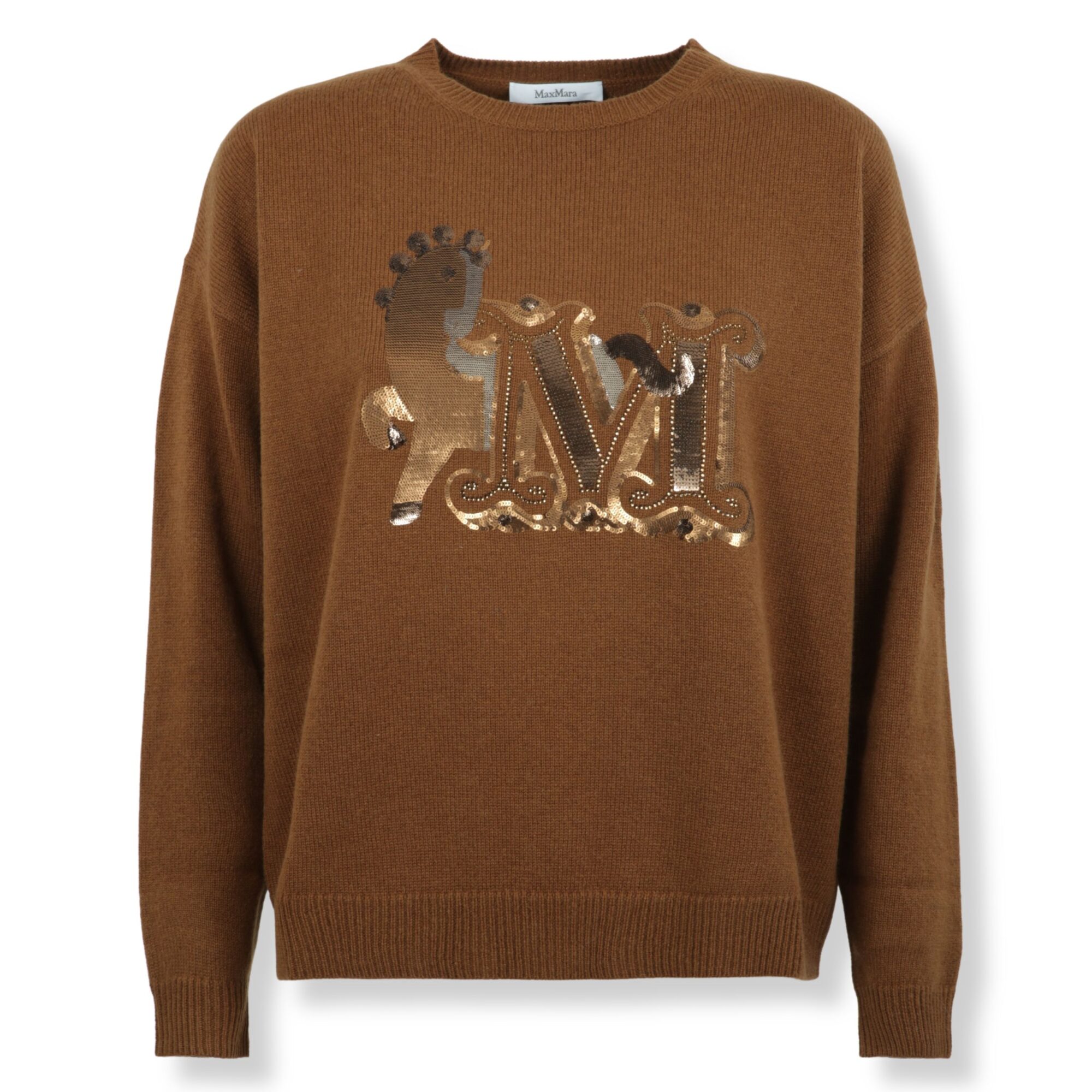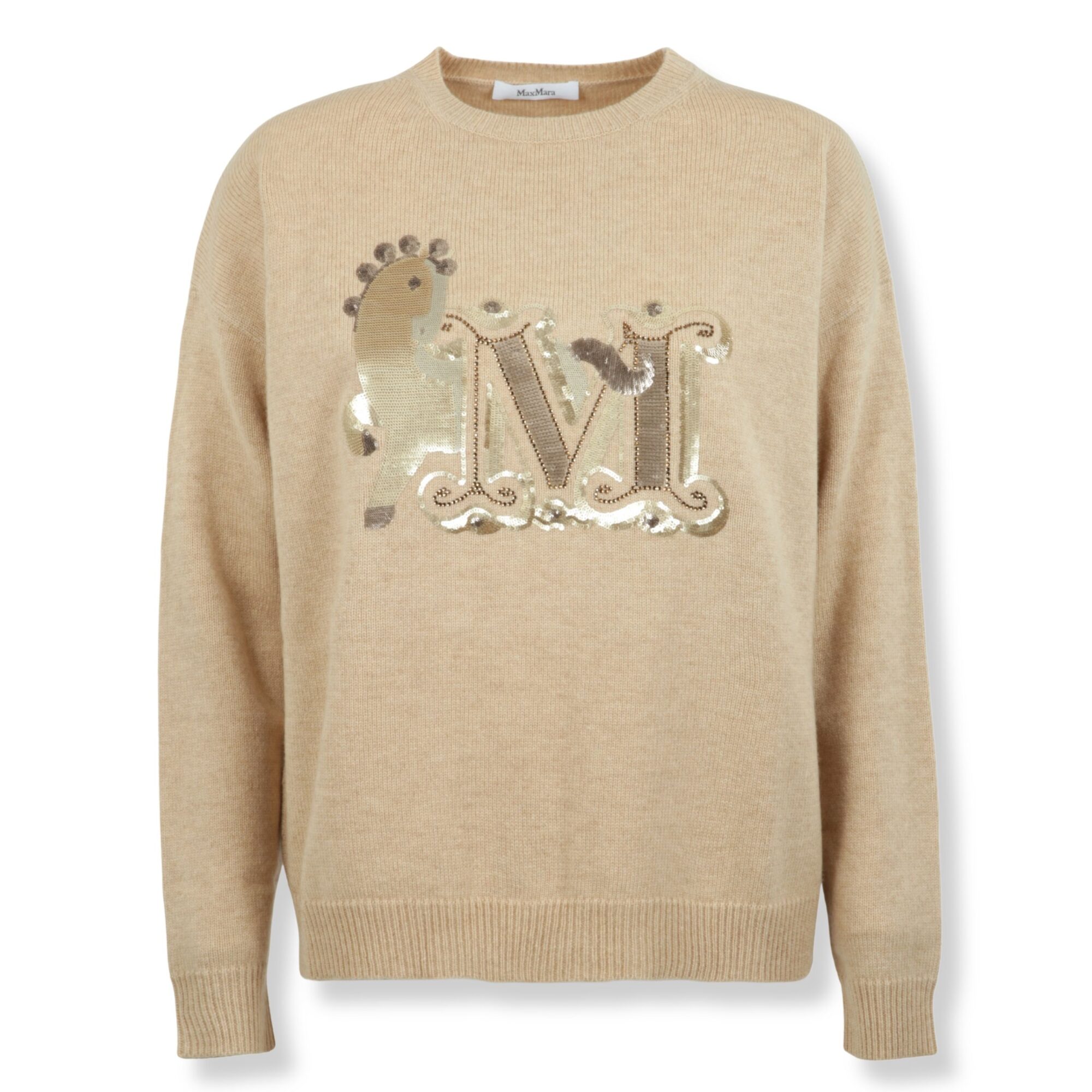 Maglia Max Mara. In filato rasato di lana e cachemire, linea oversize. Girocollo e maniche lunghe con bordi a coste e logo del brand ricamato sul davanti.