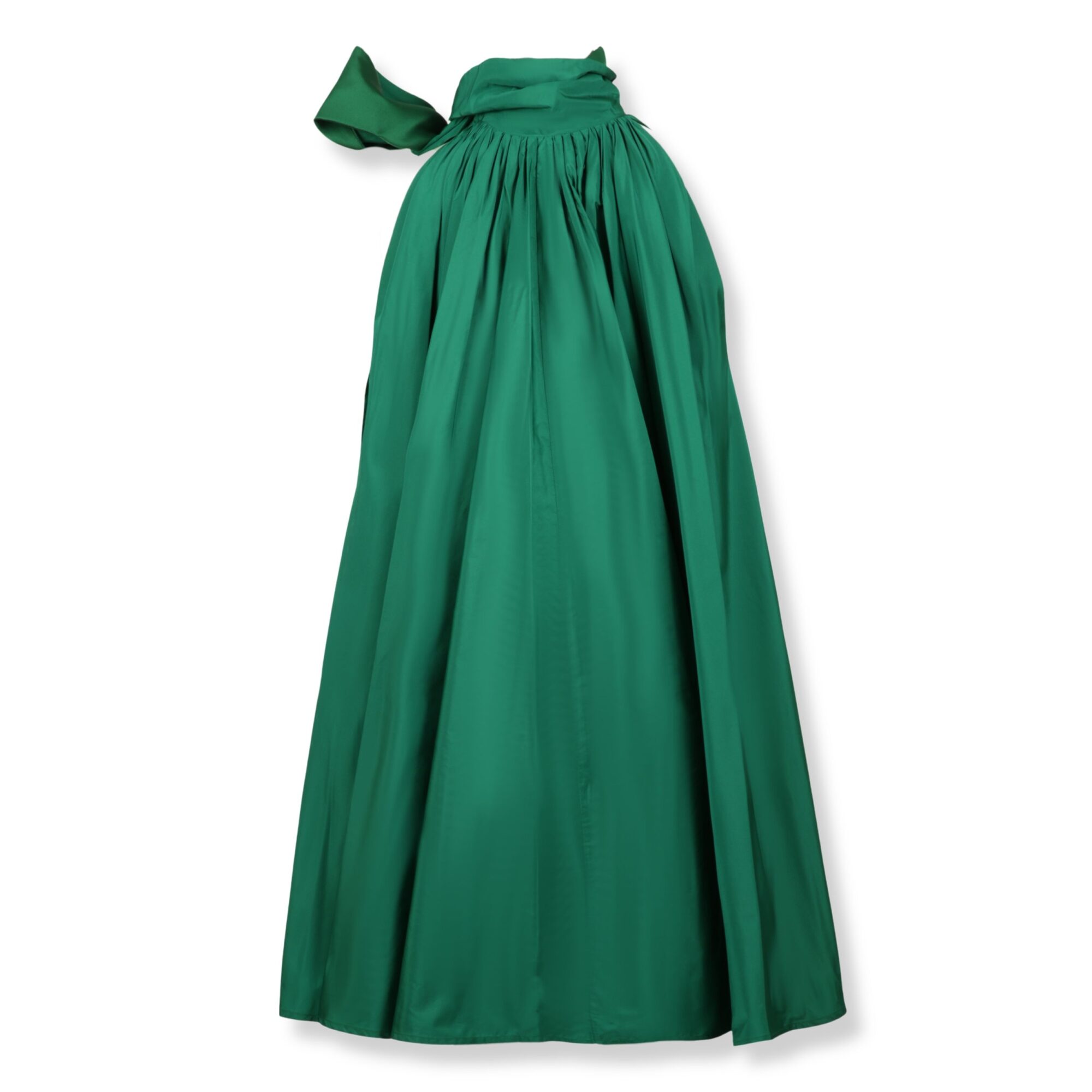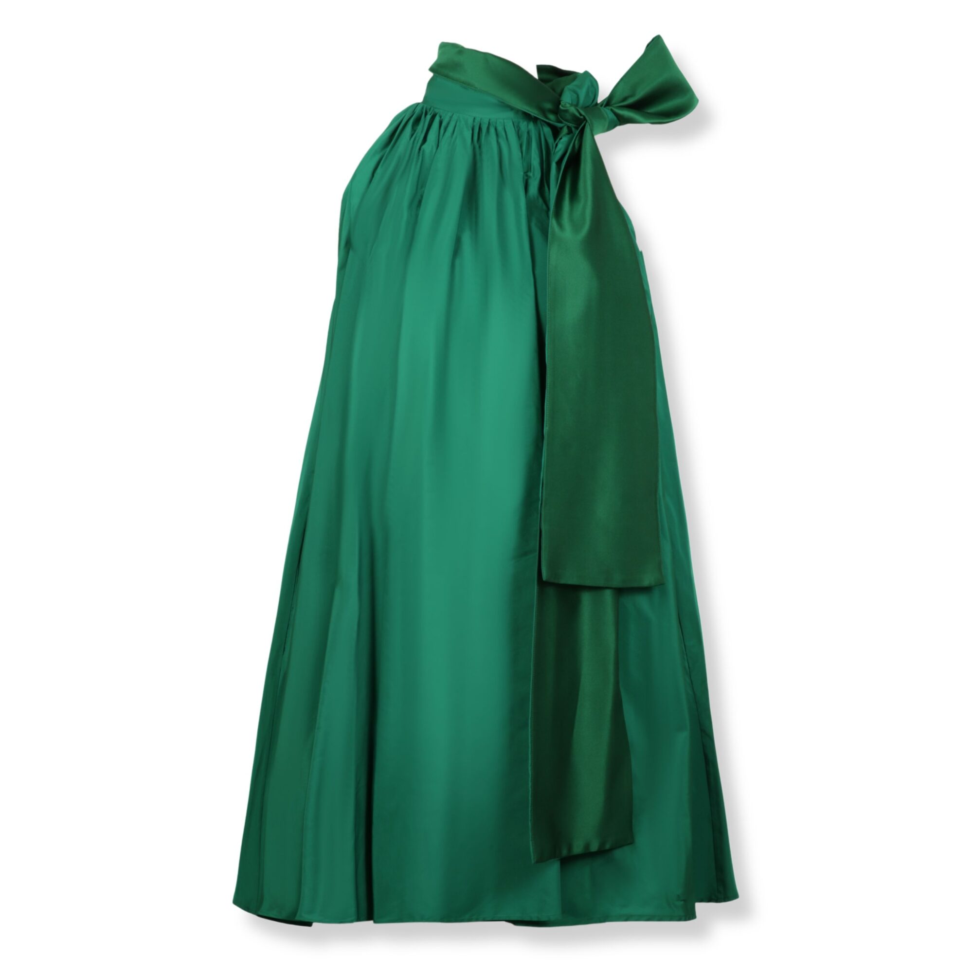Abito Beber Max Mara. Linea svasata, vestibilità ampia con motivo a pieghe effetto voluminoso su tutto il corpo. Scollo all’americana e collo con fusciacche a fiocco.