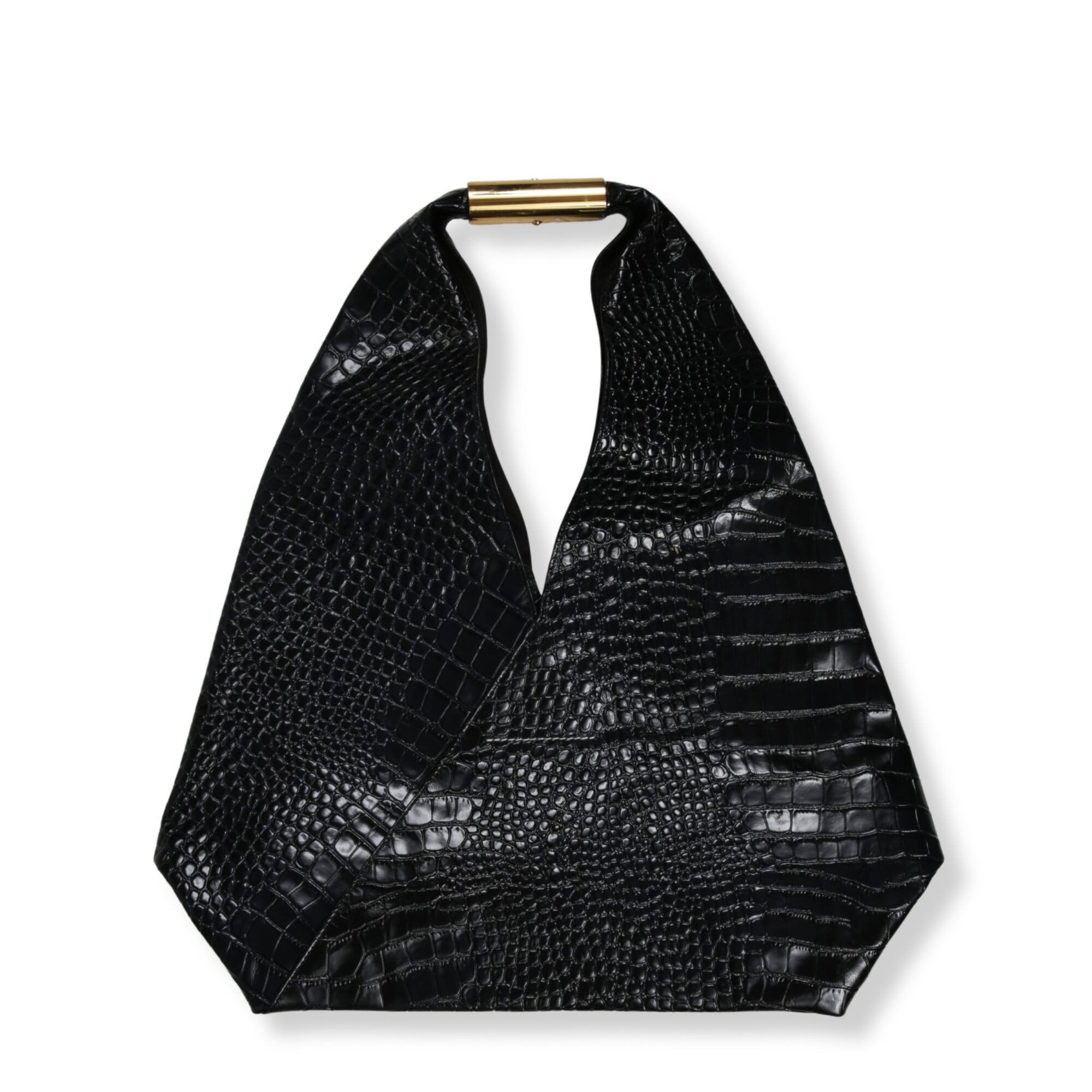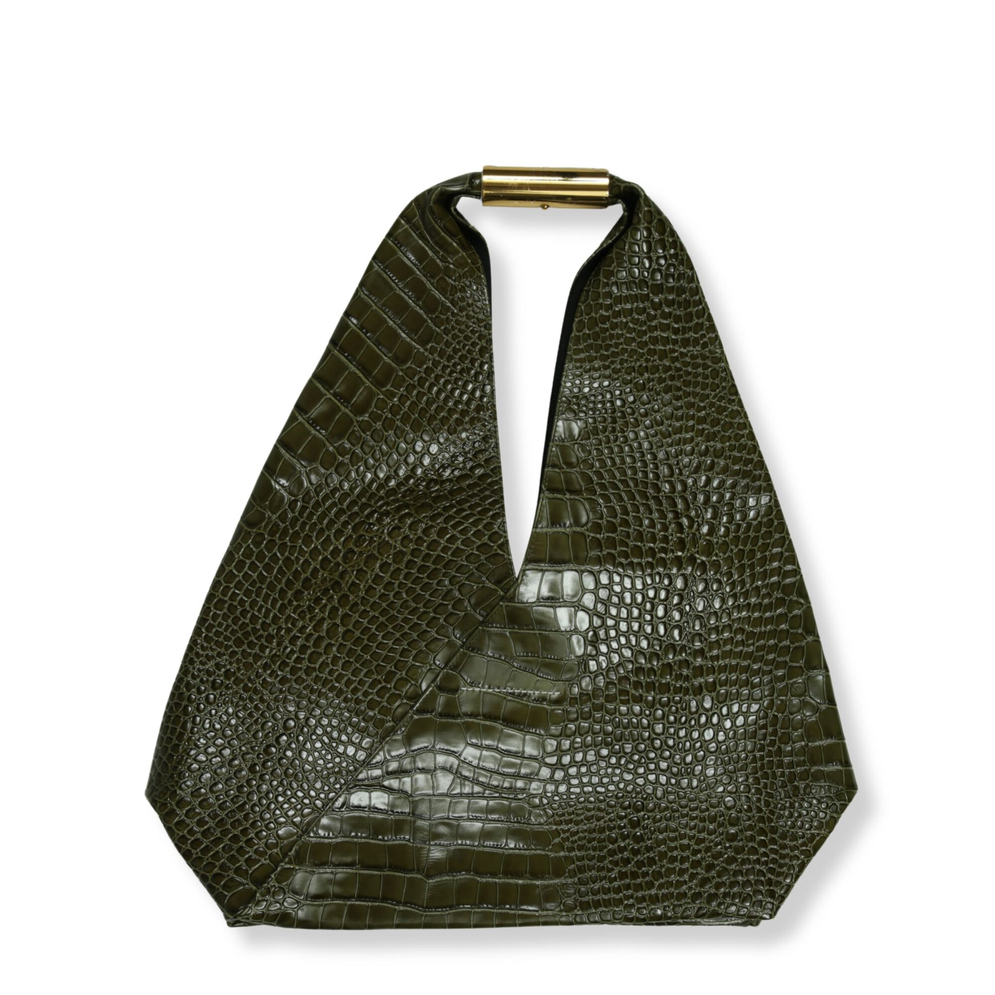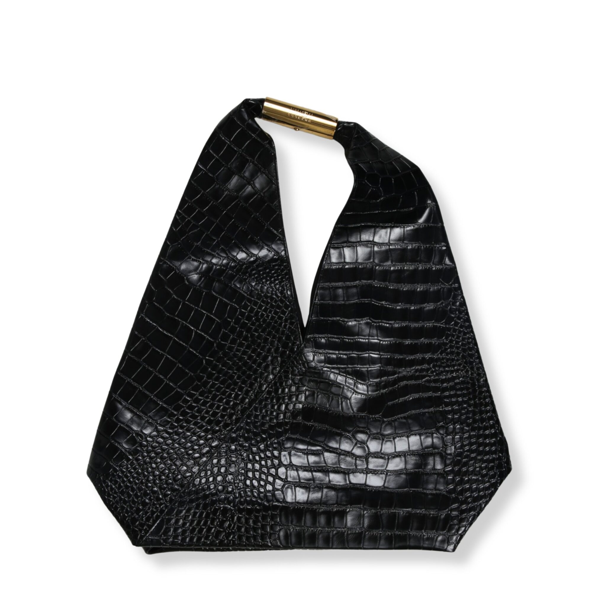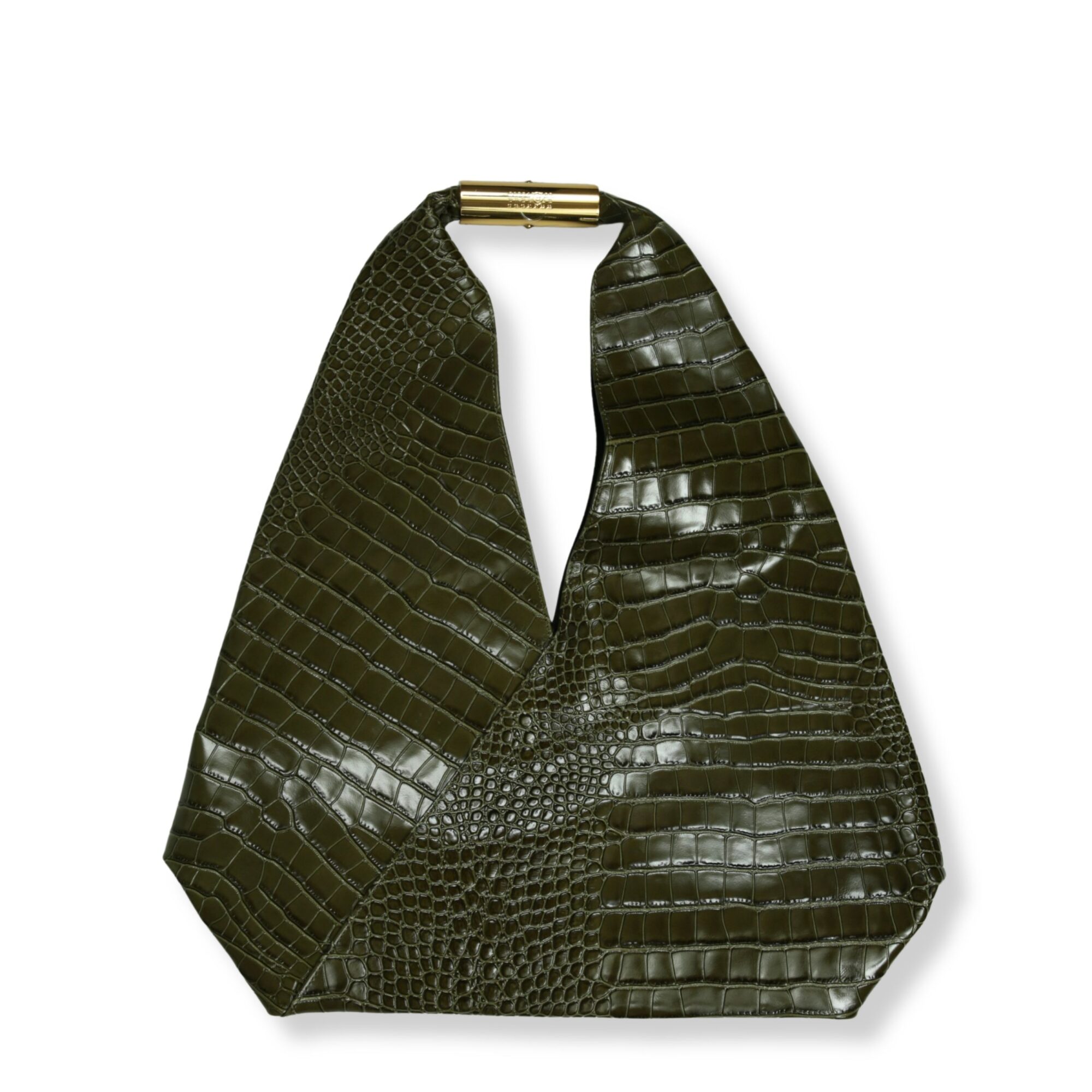 Japanese Bag Medium MM6. Iconico design origami, con pieghe angolari laterali, in stampa effetto coccodrillo. Tracolla regolabile e manico con dettaglio metallico color oro, con logo Numeric del brand.