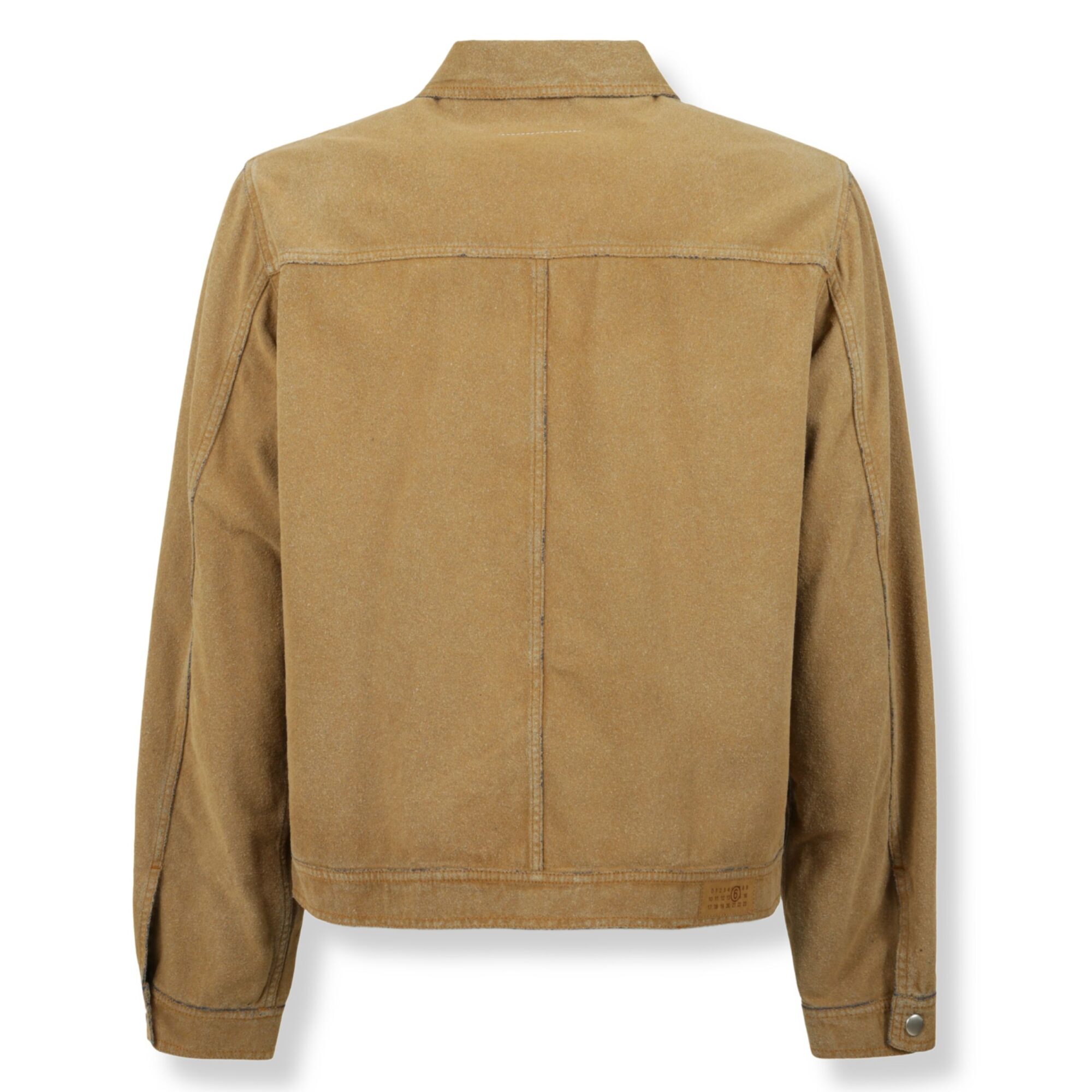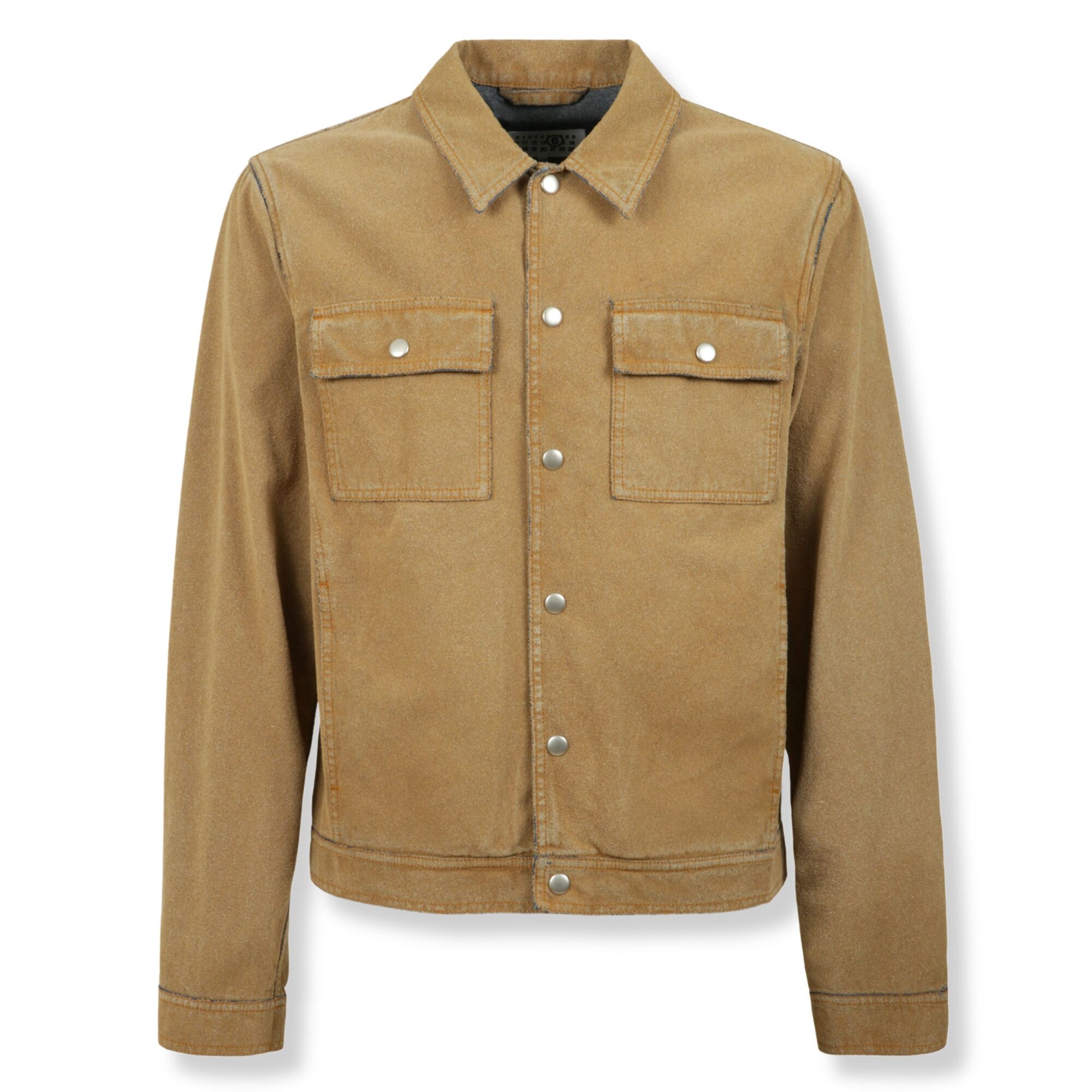 Giacca Trucker MM6. Design in denim con finitura effetto scamosciato, colletto a camicia e due tasche con patta sul petto.