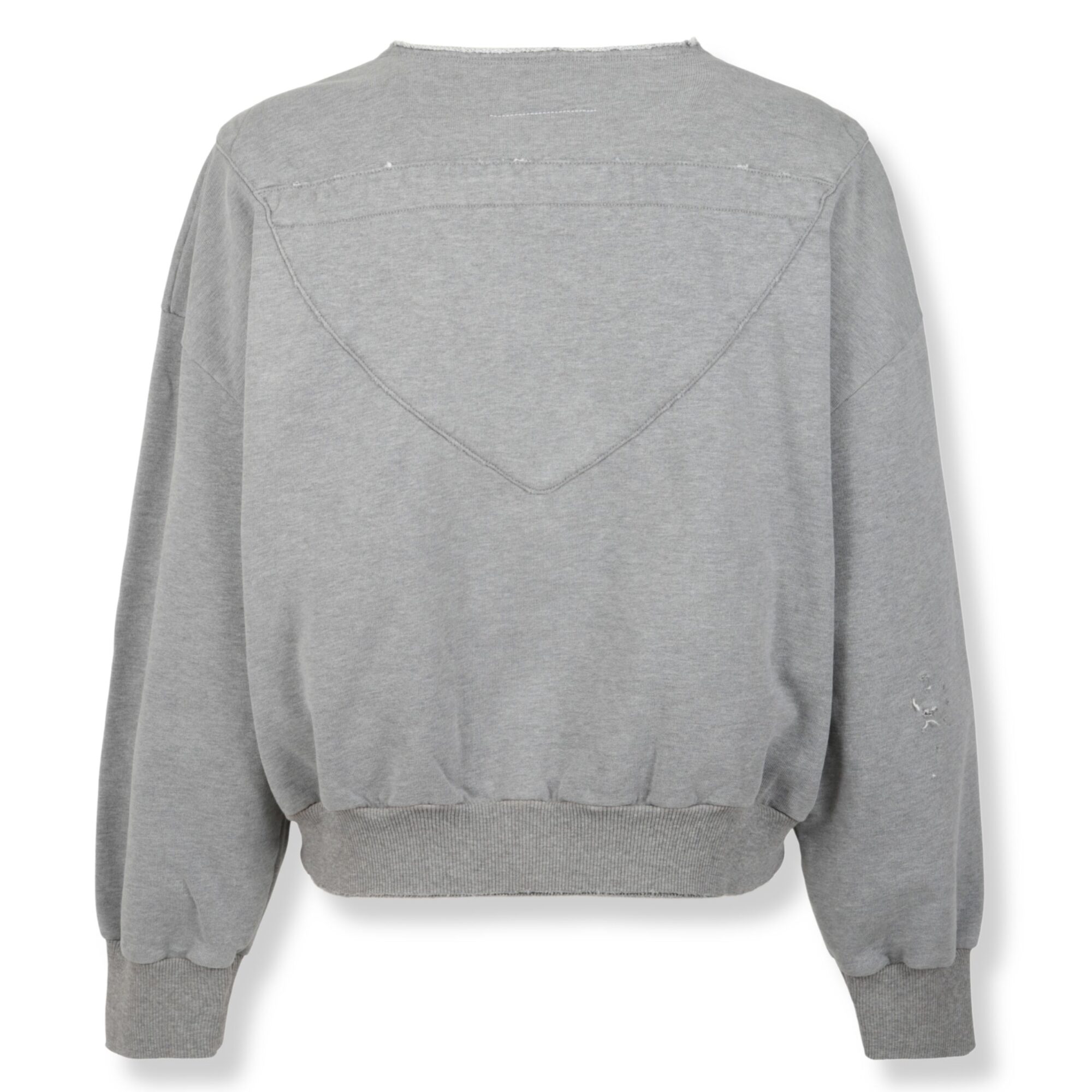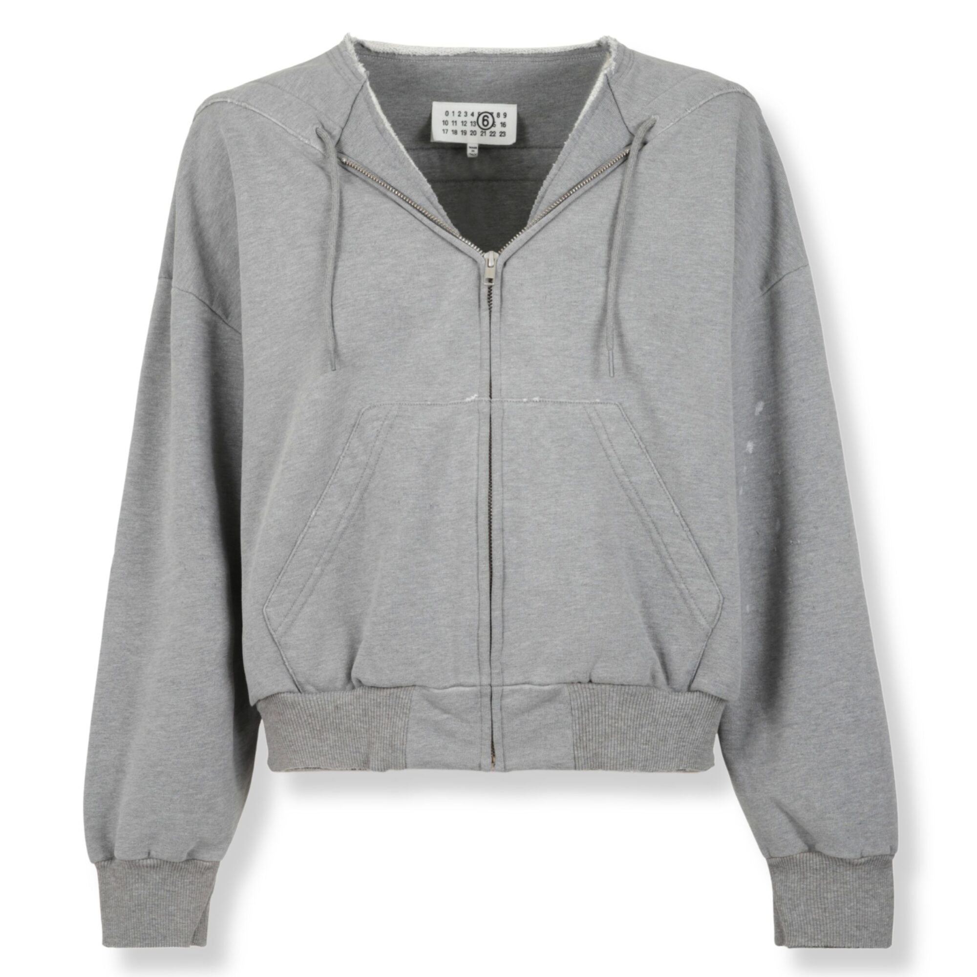 Felpa MM6 in cotone. Scollo a V con coulisse frontale, bordi a costine e dettagli effetto used con tasca a marsupio sul davanti.