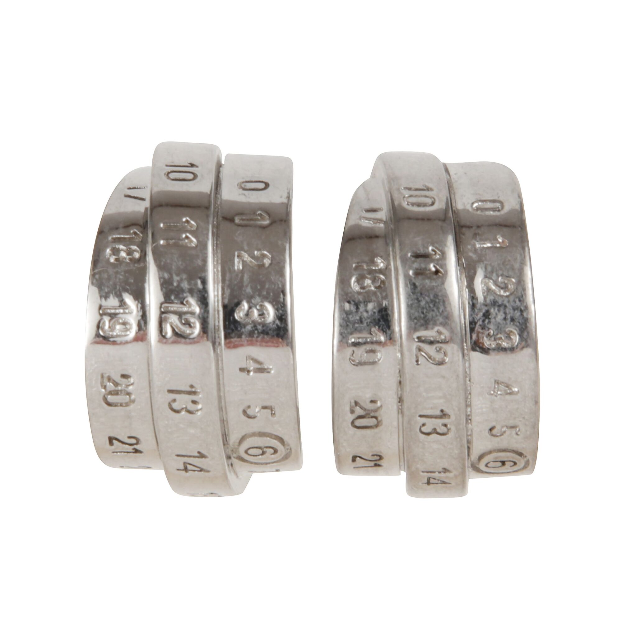 Orecchini a cerchio con tre fasce sovrapposte con logo inciso. Chiusura a perno.