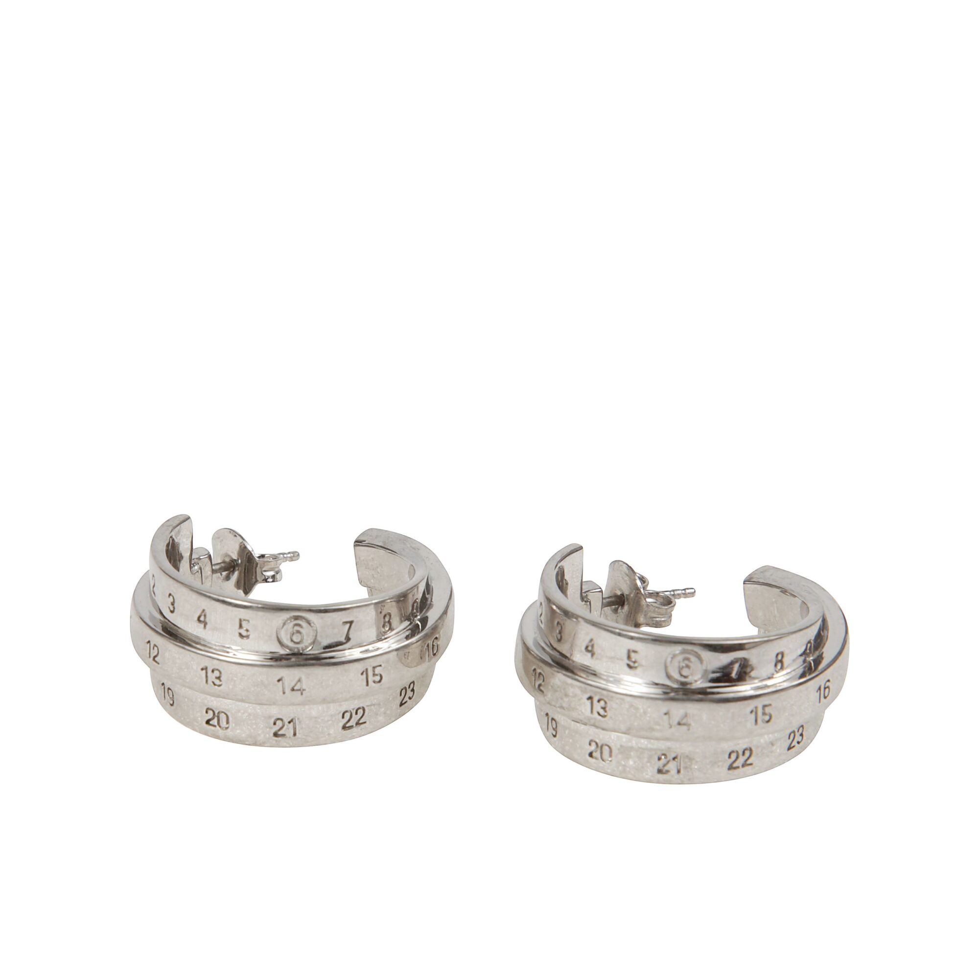 Orecchini a cerchio con tre fasce sovrapposte con logo inciso. Chiusura a perno.
