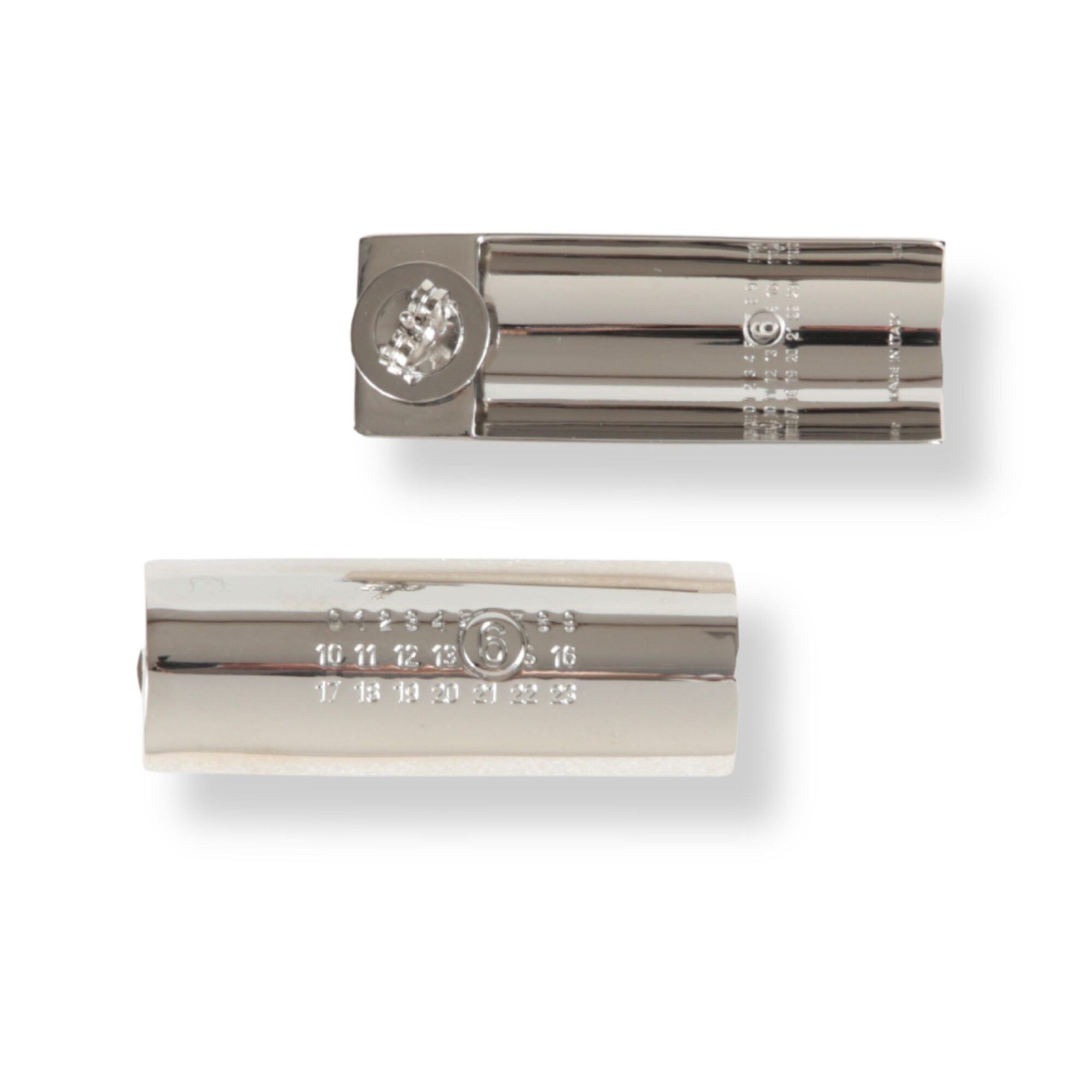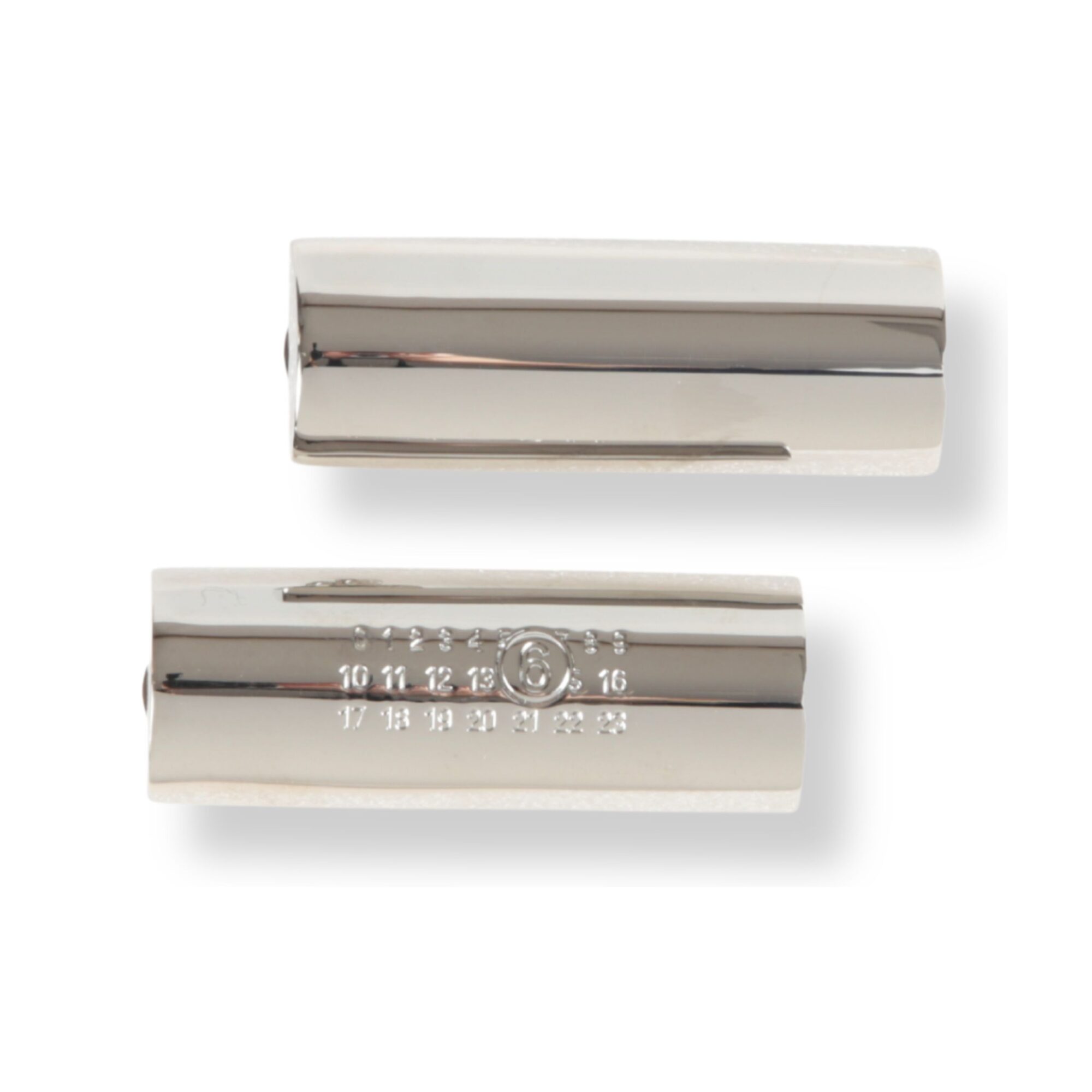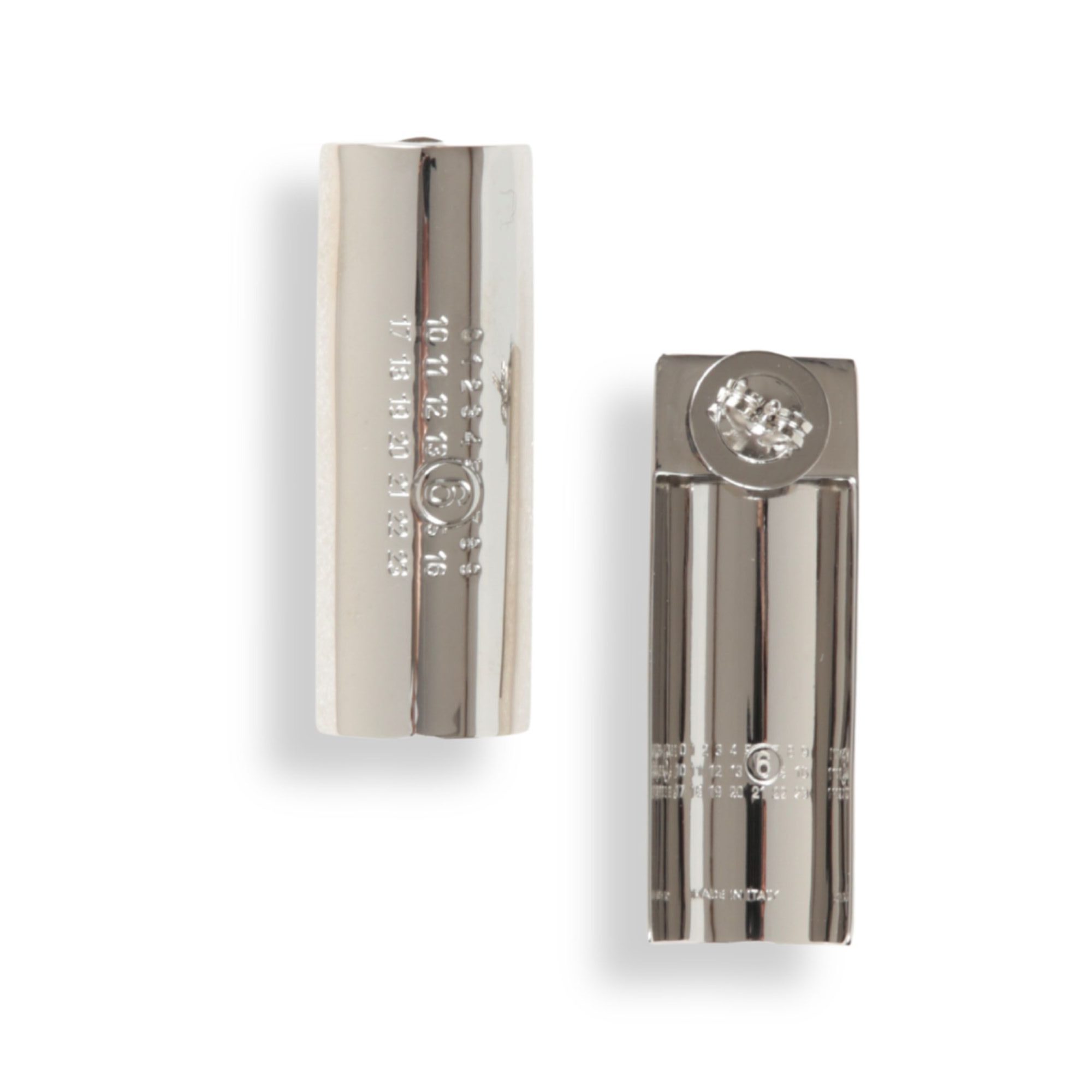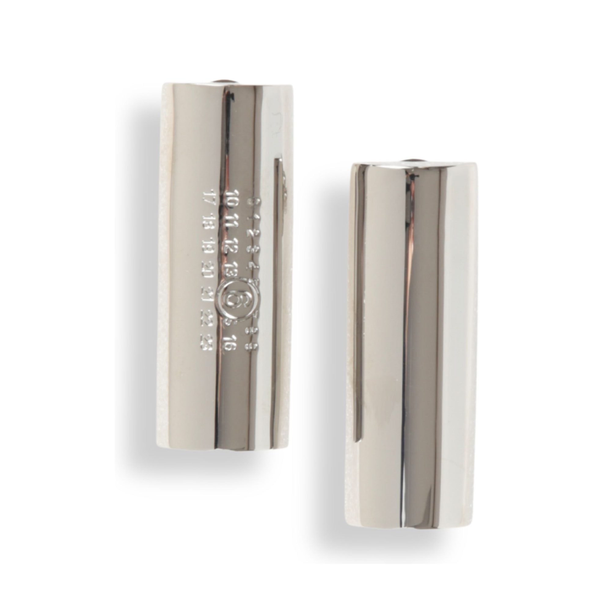 Orecchini rettangolari a goccia MM6. Forma cilindrica in finitura argentata, con loghi del brand. Chiusura a farfalla.