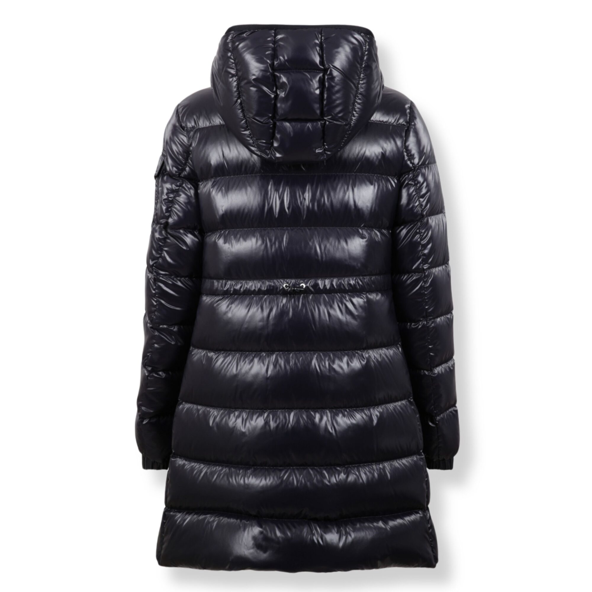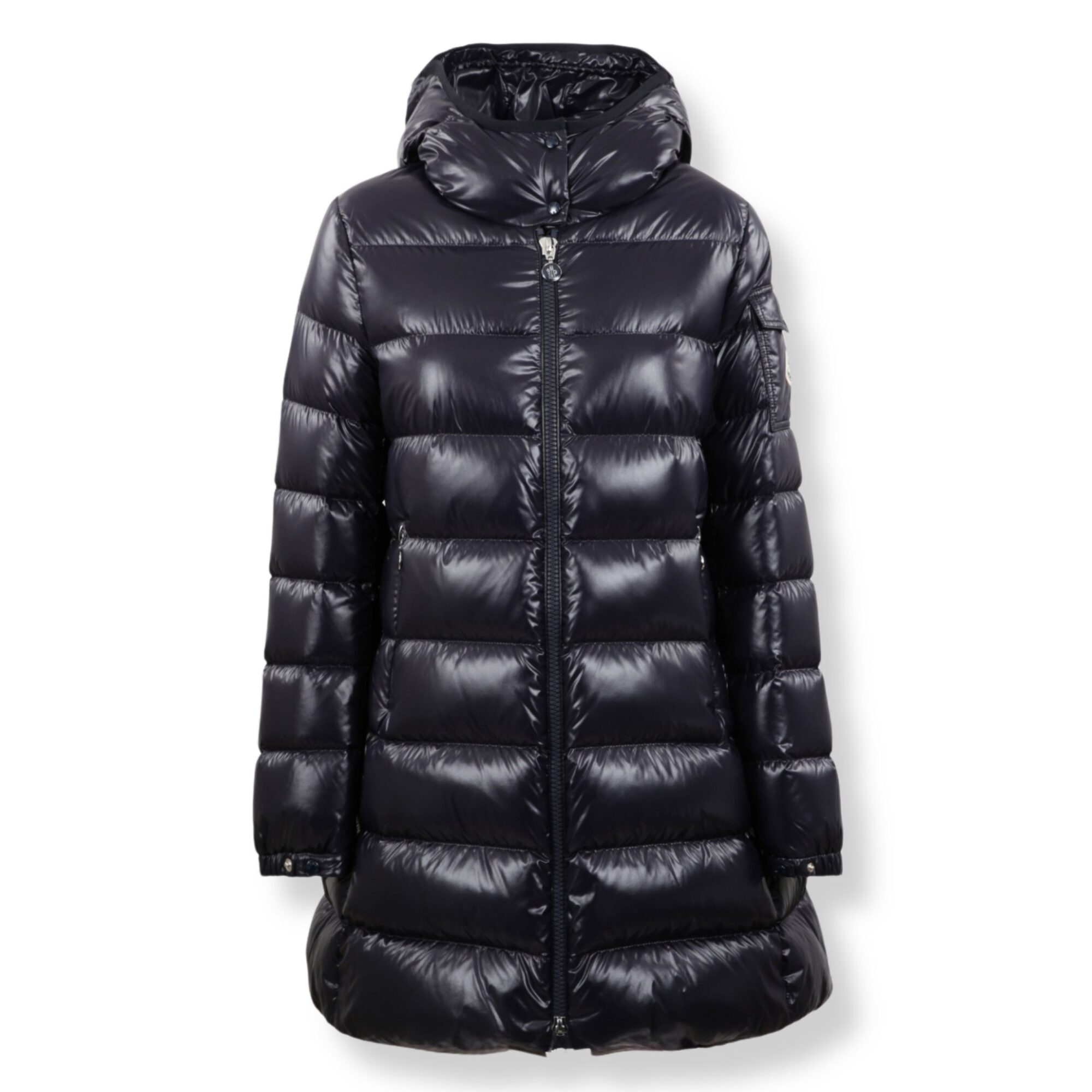 Courcelles di Moncler. Cappotto lungo con cappuccio integrato. Design con finitura lucida e trapuntature orizzontali.