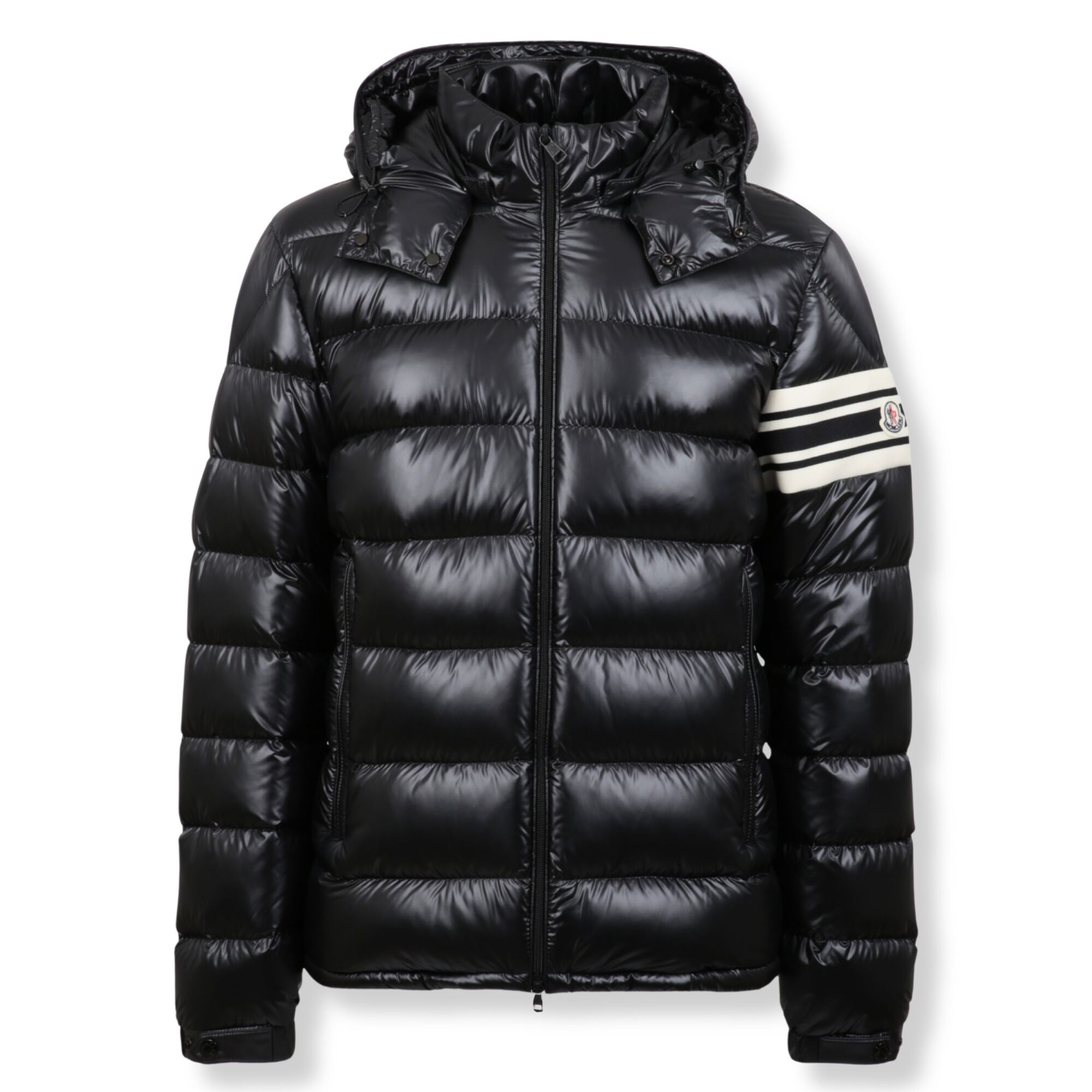 Piumino corto Landre Moncler. Modello con cappuccio, finitura effetto laqué. Due tasche laterali e polsini con bottoni. Maglia a righe e logo del brand sulla manica sinistra.