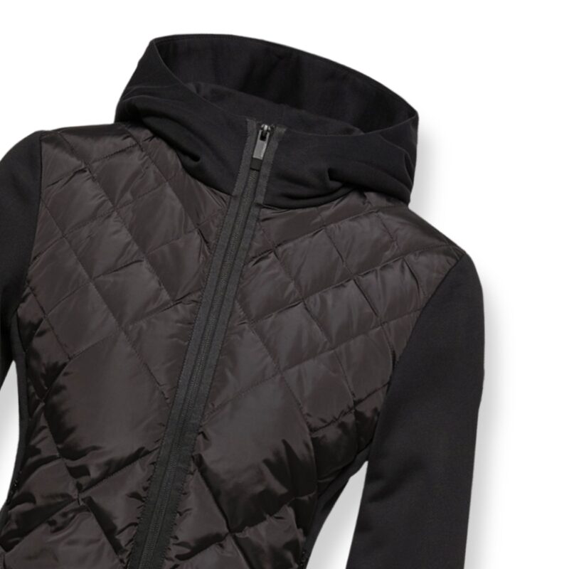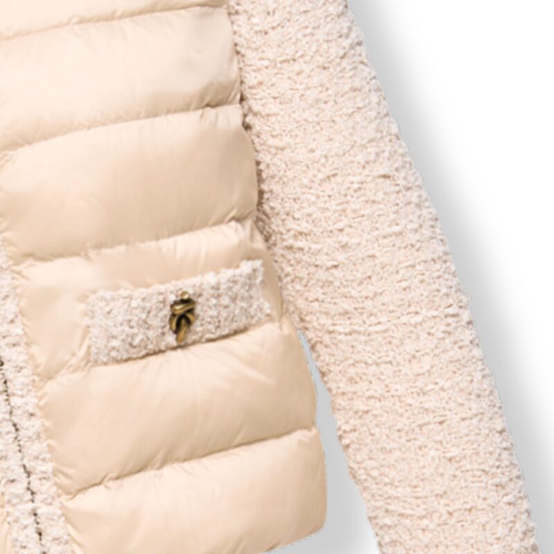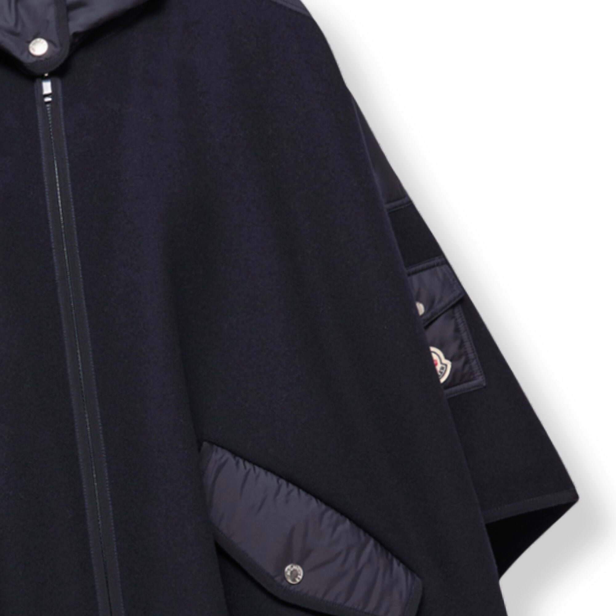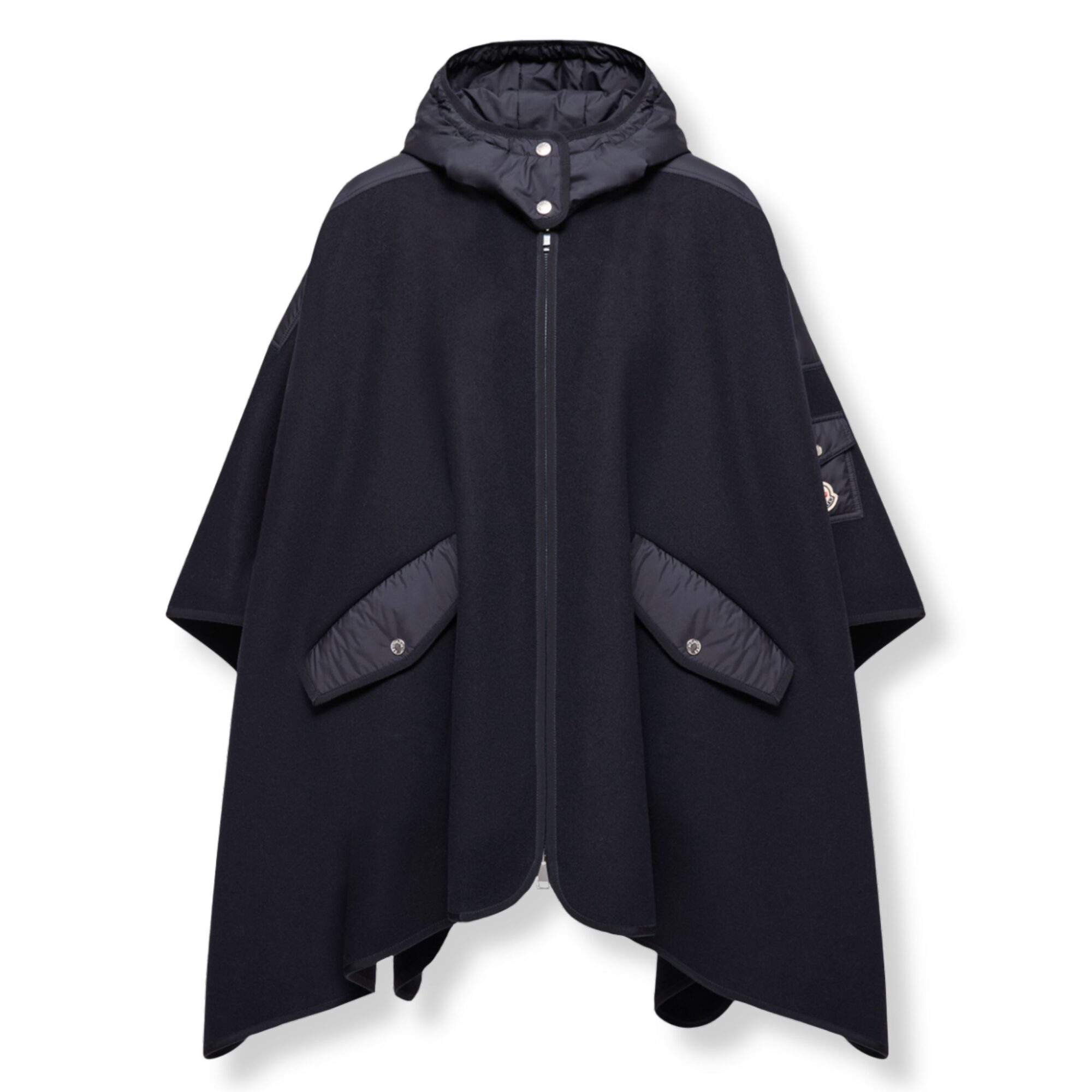Mantella Moncler. Design con cappuccio imbottito, taschino sulla manica sinistra con logo del brand e due tasche con patta e bottone sul davanti.