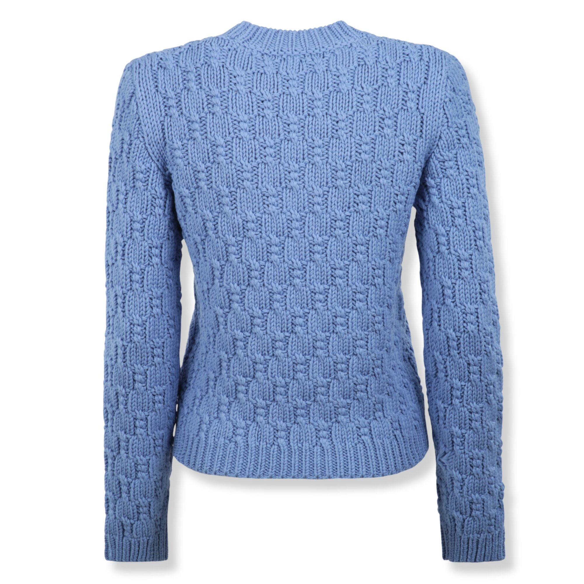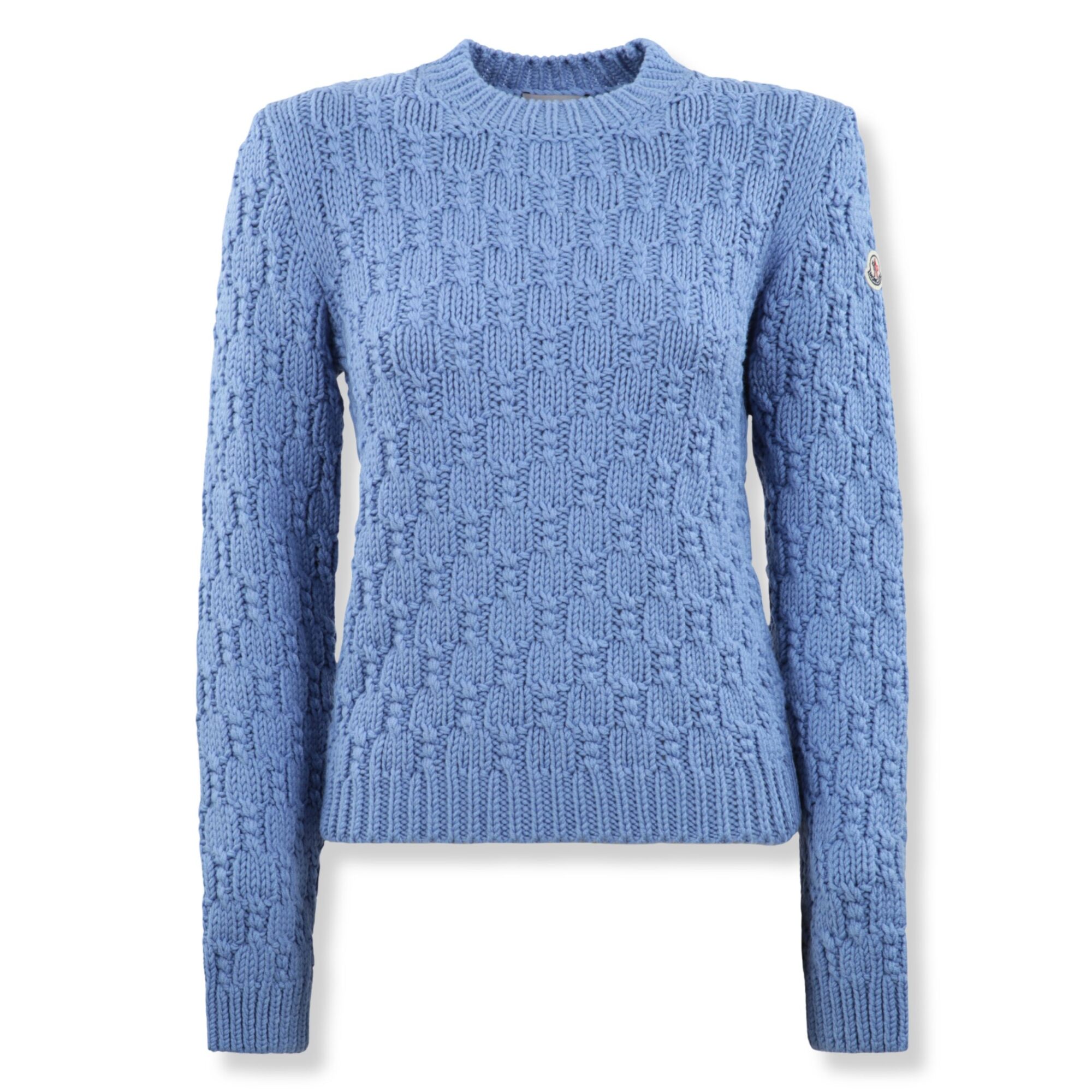 Maglione in lana Moncler, con trama a maglia. Girocollo, maniche lunghe, orlo e polsini a costine. Piccolo logo del brand sulla manica.