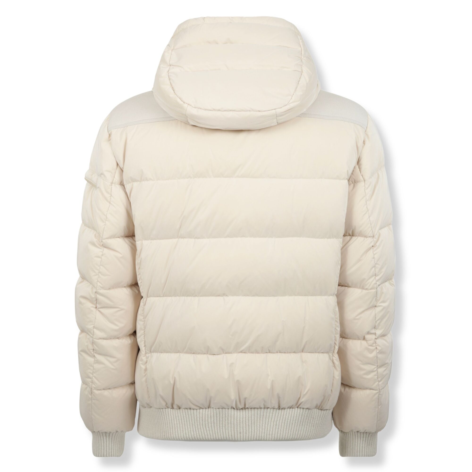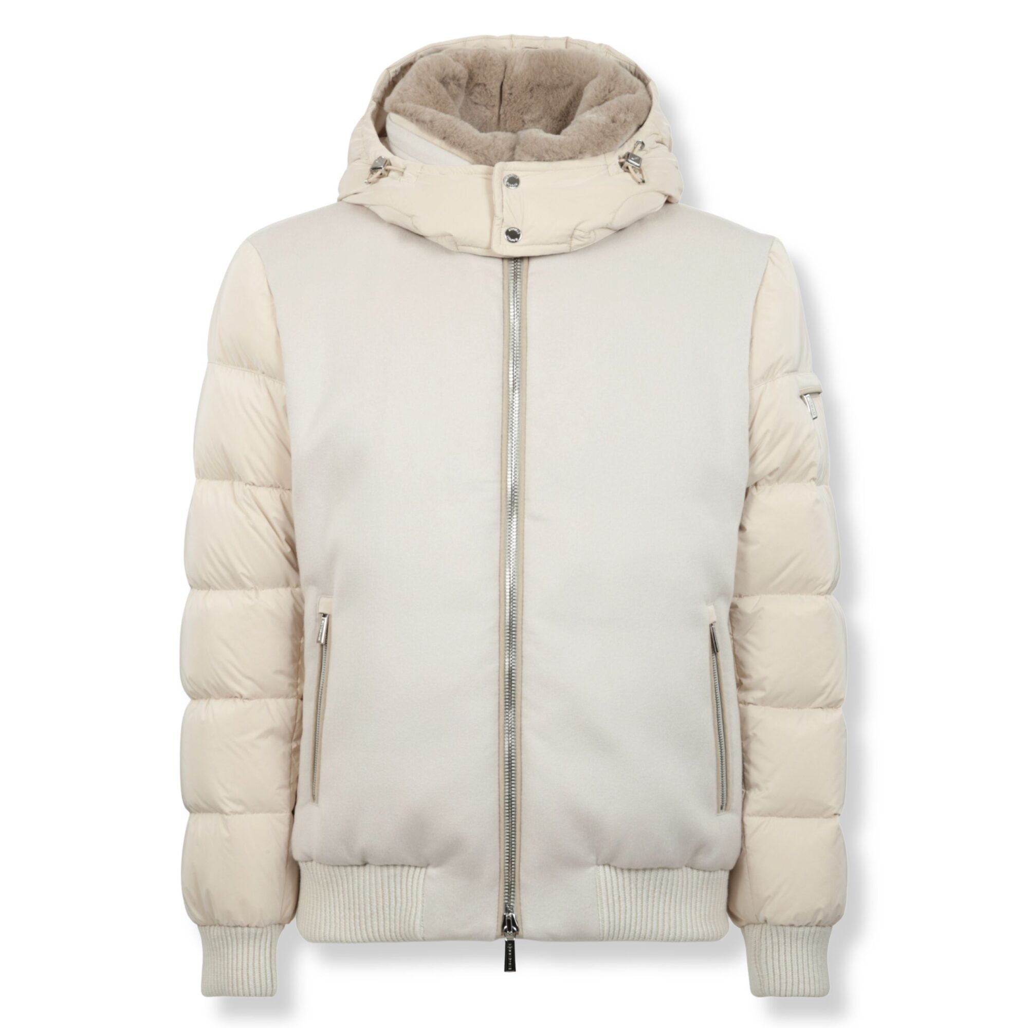 Bomber Moorer. Corpo in cashmere e microfibra, maniche imbottite con trapuntature orizzontali. Orlo e polsini a costine. Cappuccio regolabile e imbottito, rimovibile, con chiusura a bottoni a pressione. Chiusura con zip e due tasche verticali con zip frontali.