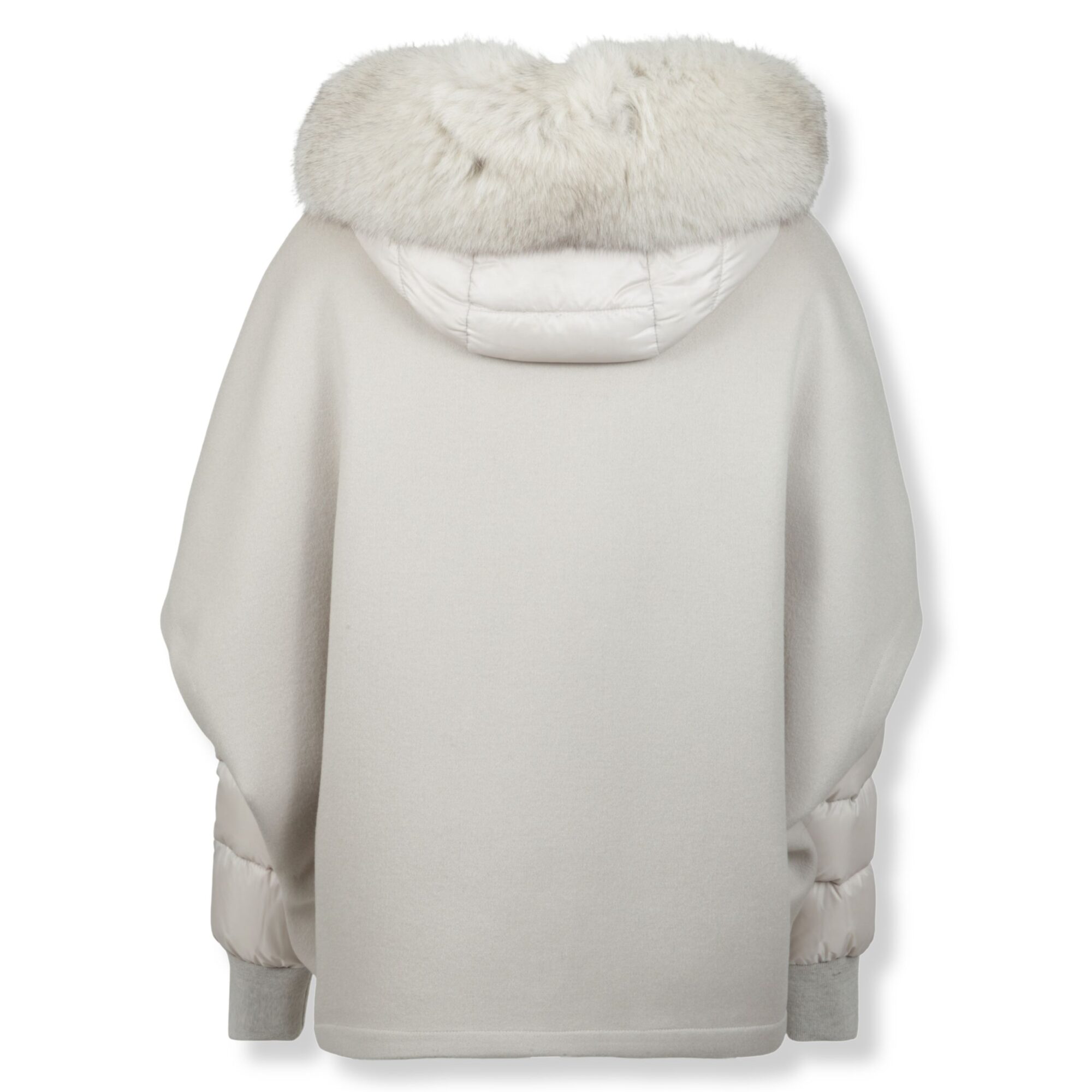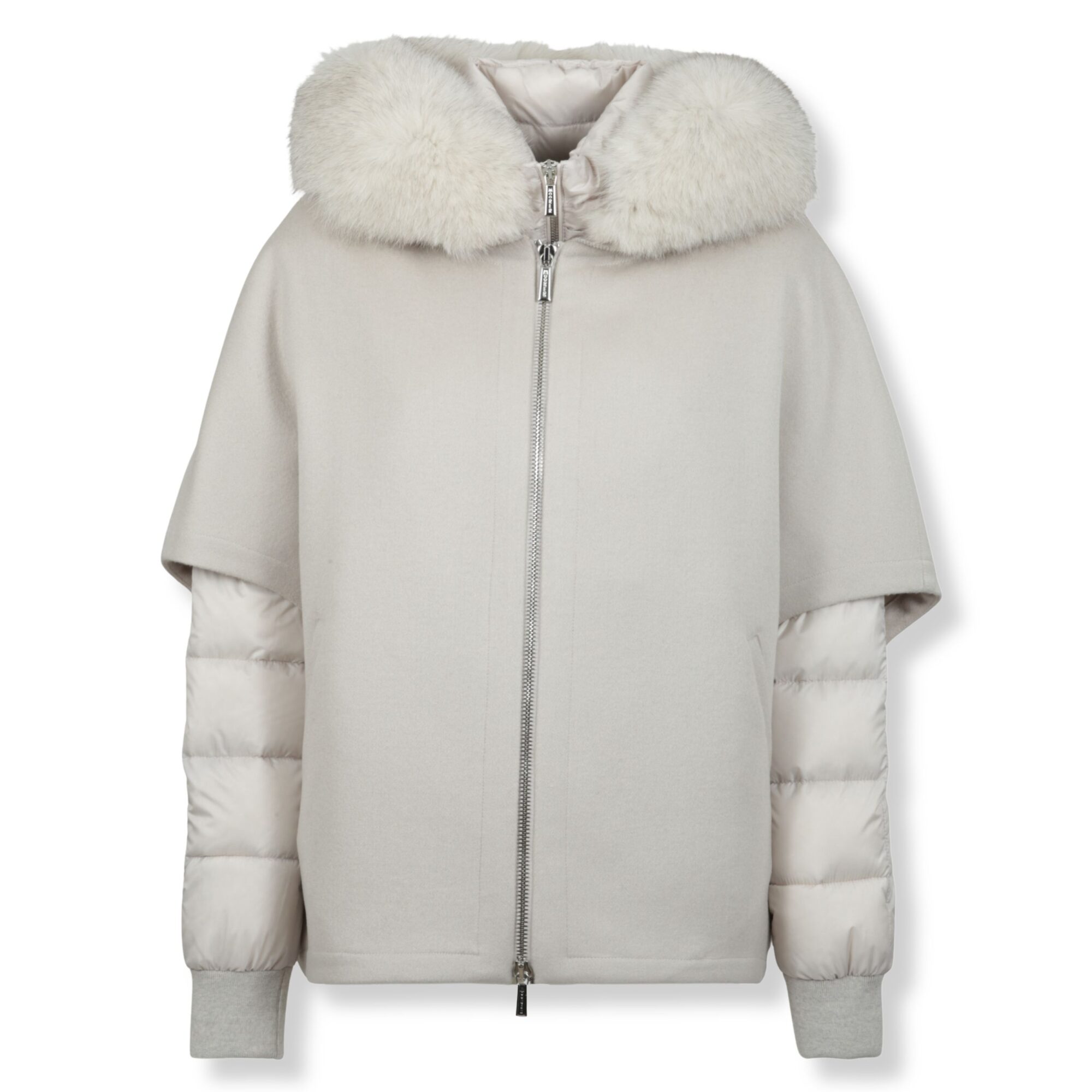 Pegaso-Lap Moorer. Cappa corta con bomber interno rimovibile in nylon imbottito in piuma d’oca. Cappuccio con inserto staccabile in pelliccia, chiusura frontale con zip e due tasche oblique laterali.