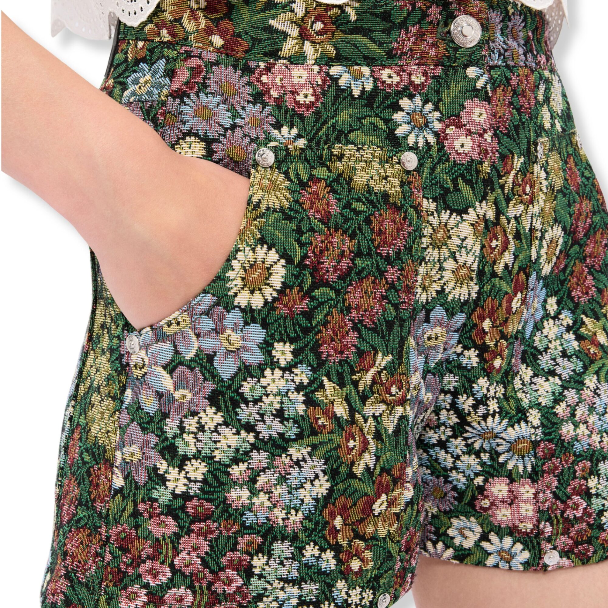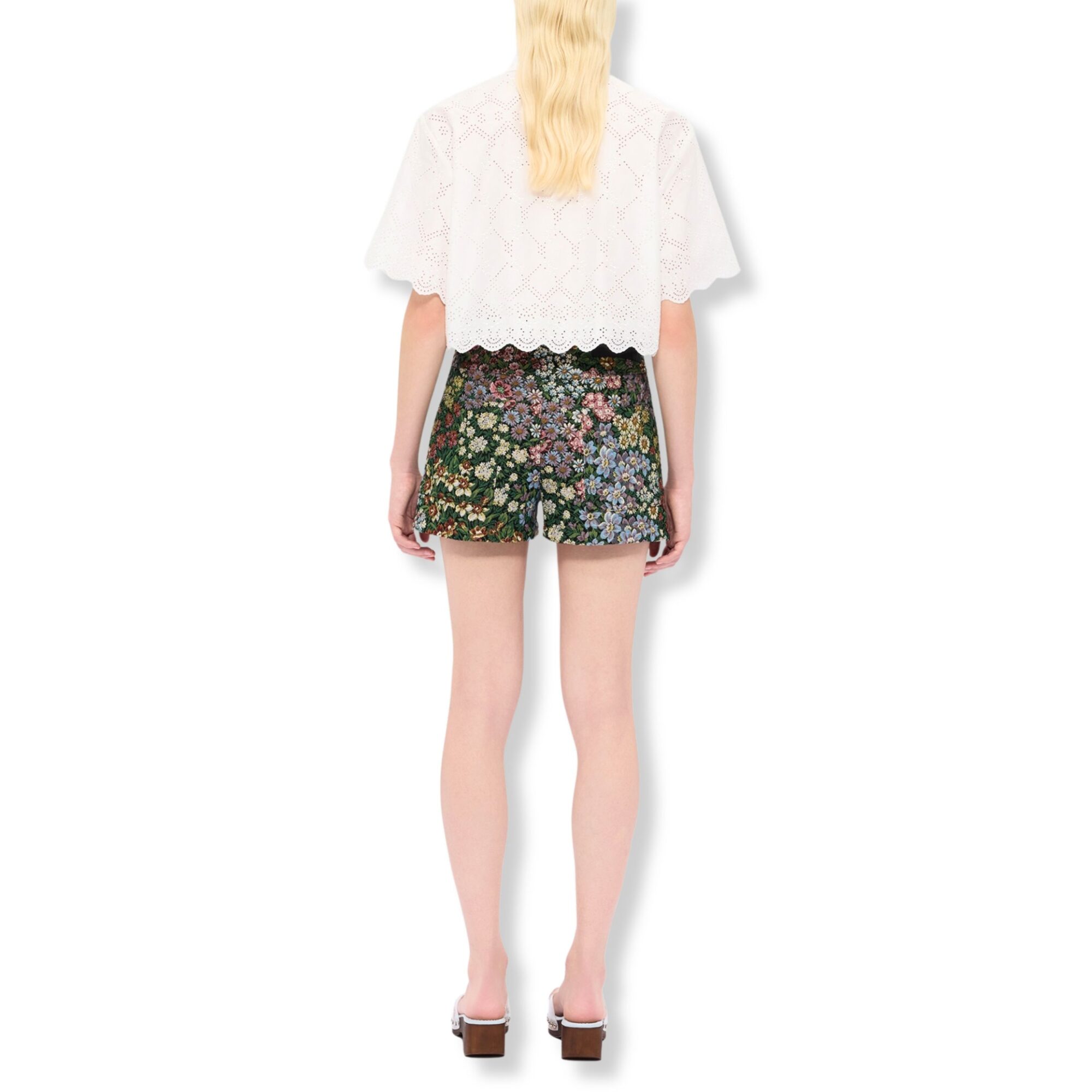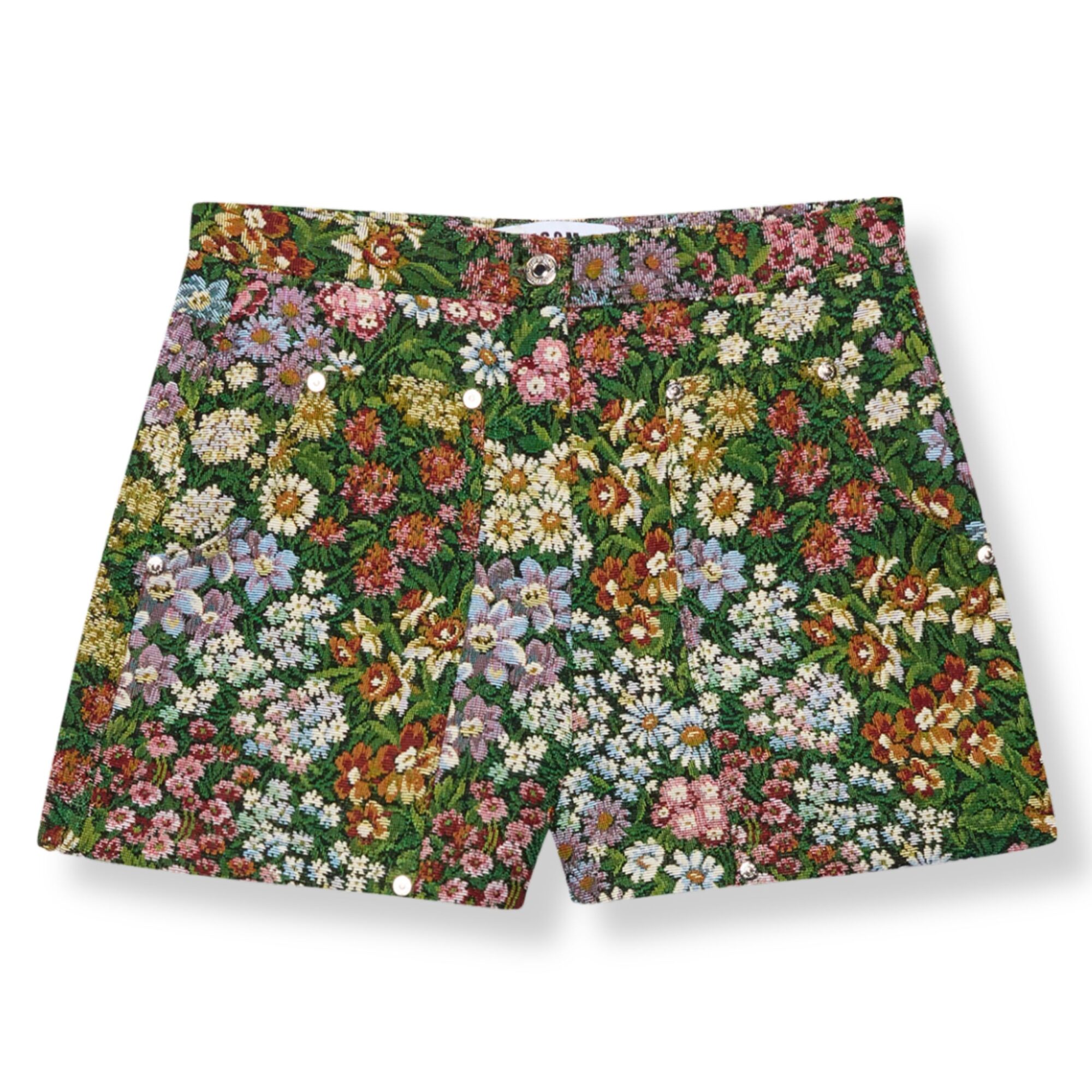 Shorts MSGM. Design in tessuto jacquard con tasche a toppa frontali decorate con rivetti. Vita con fascia elasticizzata e chiusura con bottone e zip coperta.