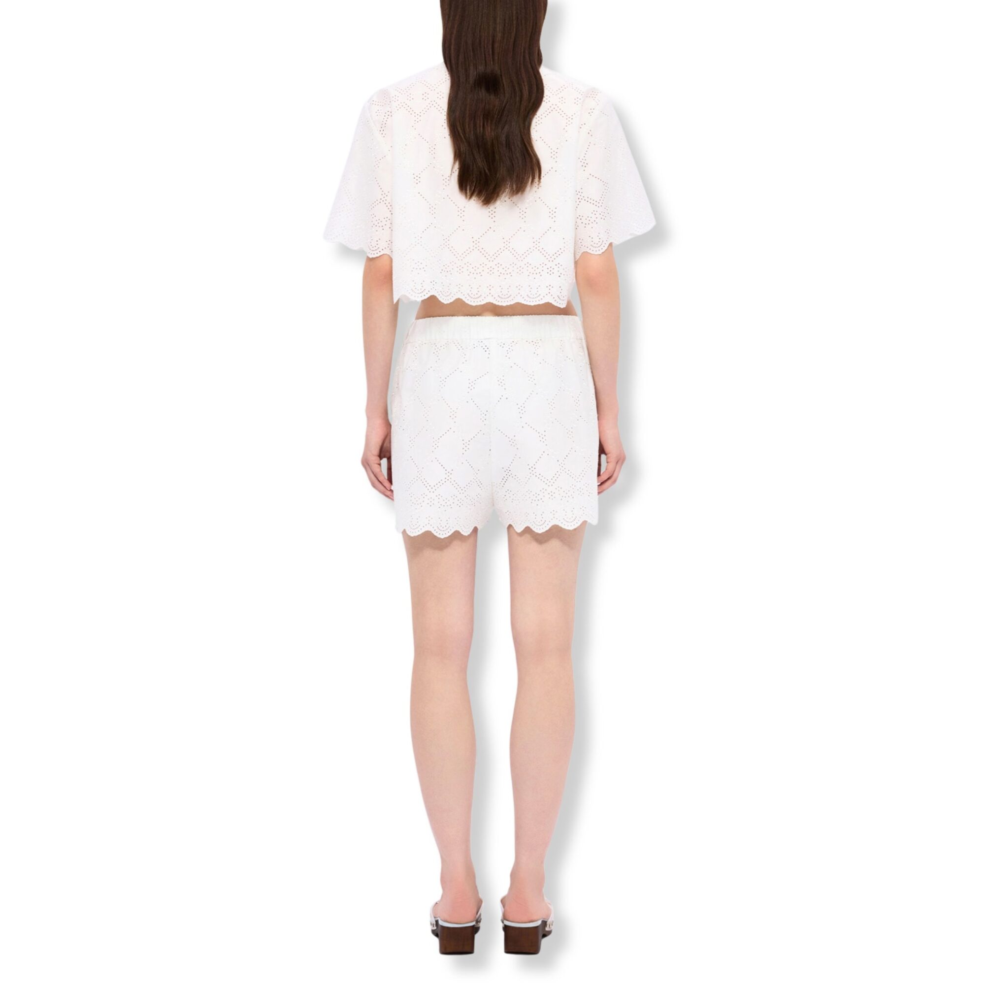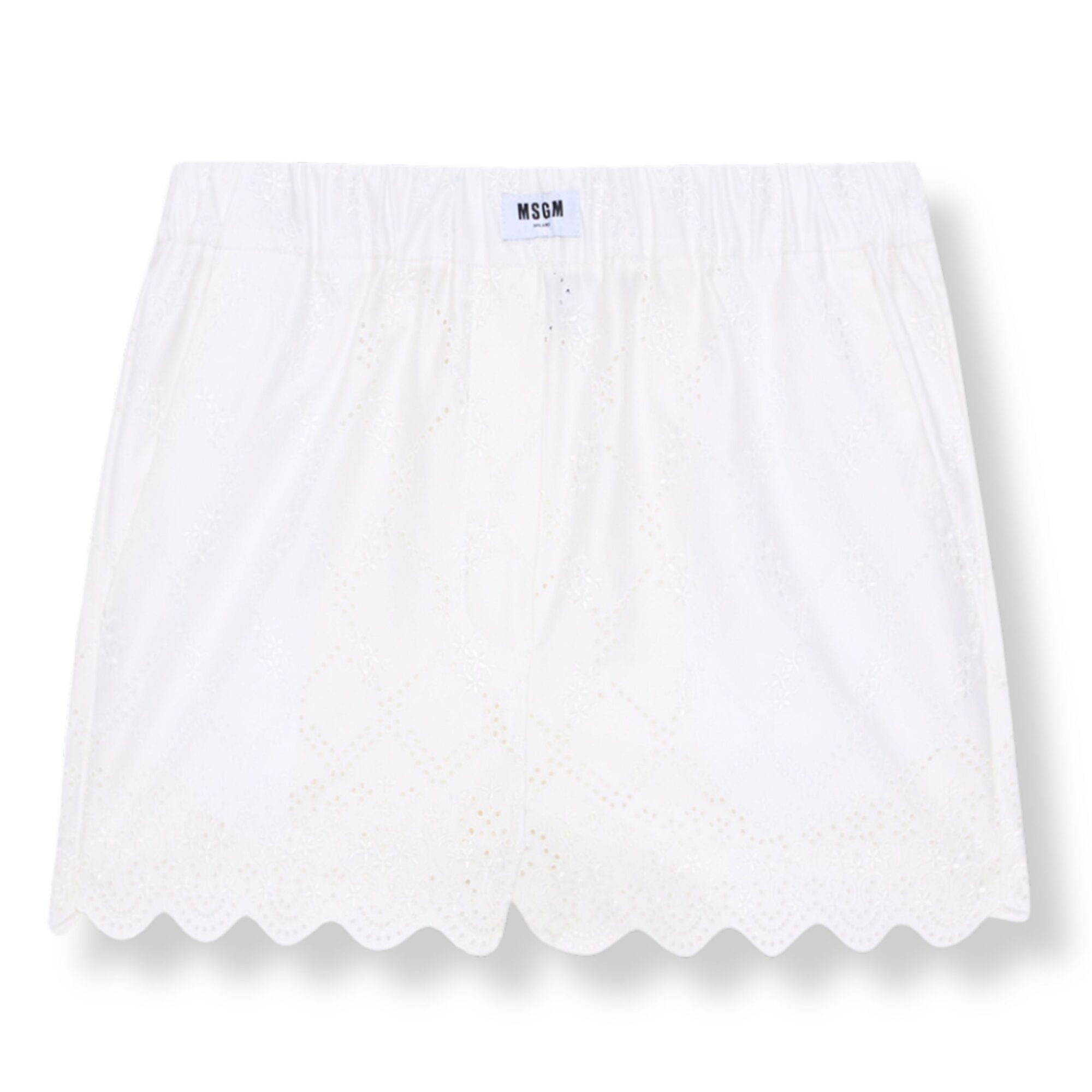 Bermuda MSGM in popeline. Silhouette fluida e ricami su tutto il corpo, vita con fascia elasticizzata e logo del brand.