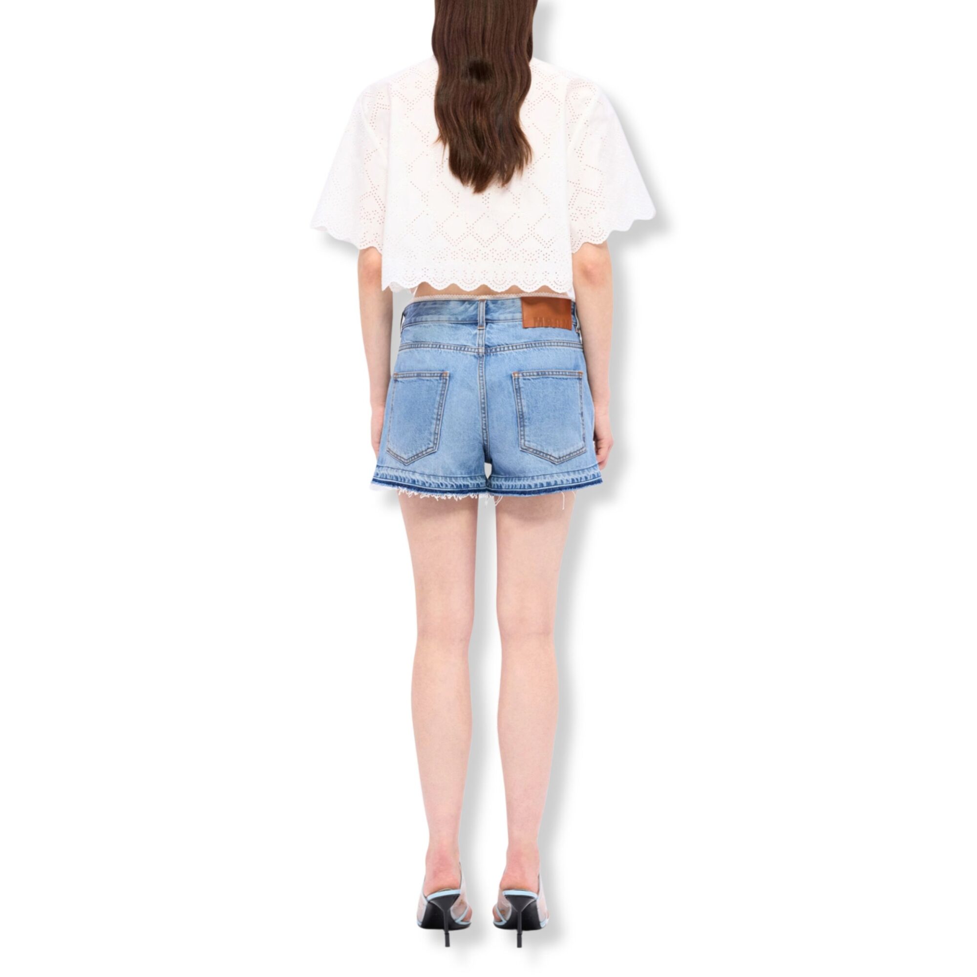 Shorts MSGM in denim. Design cinque tasche con orlo inferiore raw-cut, chiusura con bottone e zip coperta.