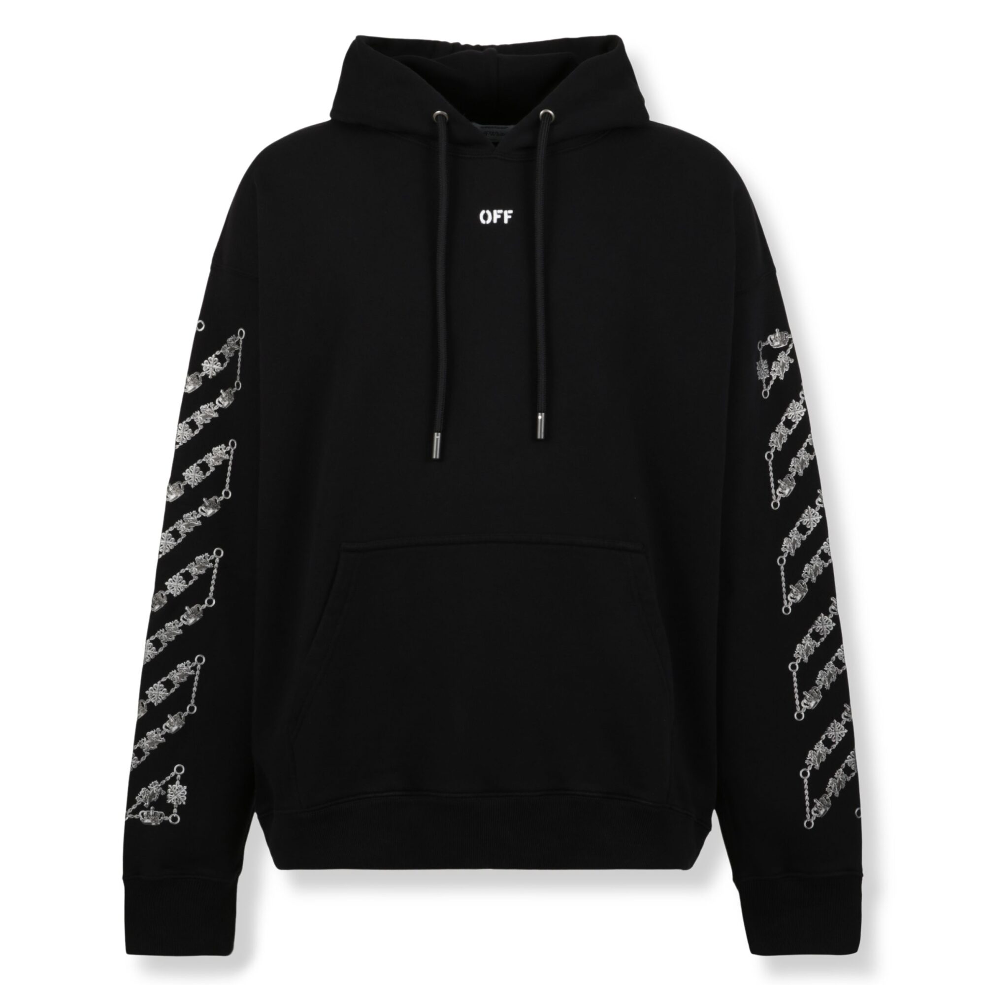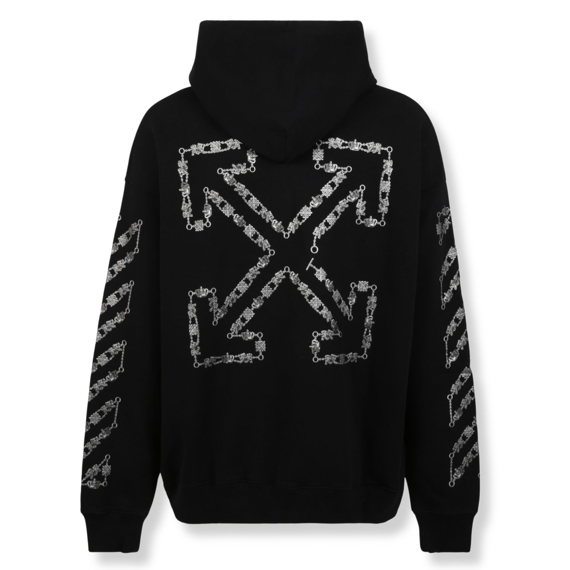 Chain Arrow Diagonal Skate Hoodie Off-White. Cappuccio regolabile con coulisse, bordi a costine e tasca a marsupio sul davanti. Logo frontale e iconico motivo Chain Arrow su maniche e retro.
