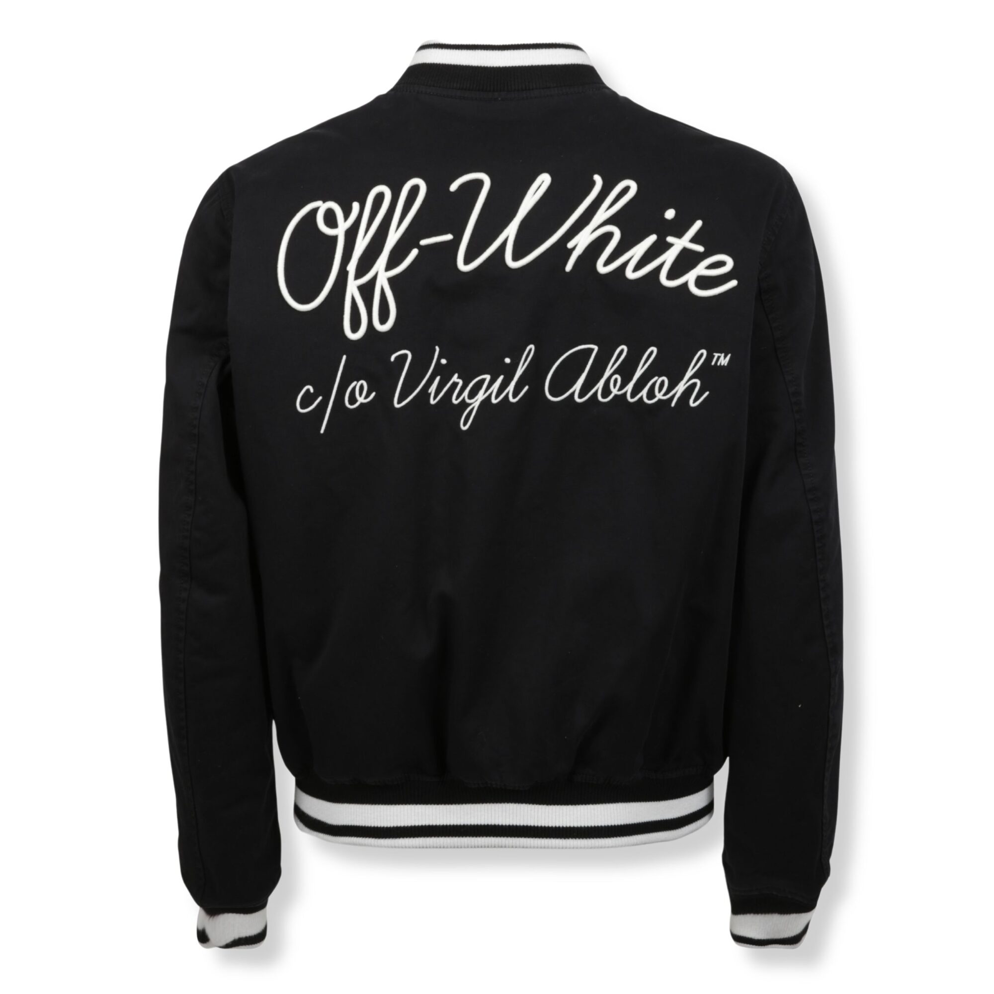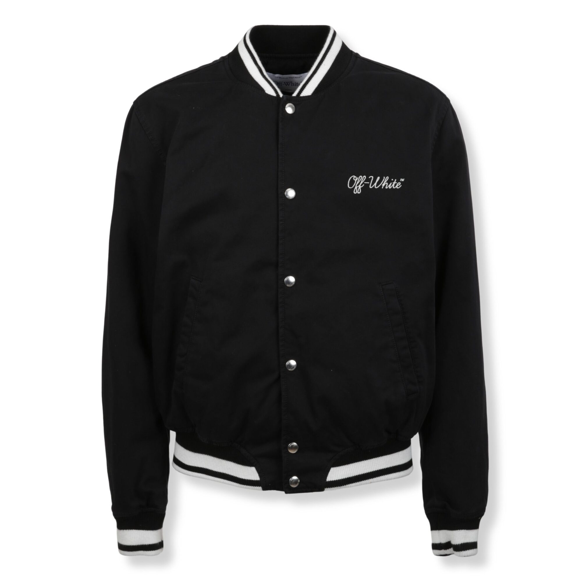 Giacca Varsity Souvenir Off-White. Linea oversize, collo e bordi rifiniti a costine chiusura sul davanti con bottoni. Logo del brand sul petto e stampa sul retro.