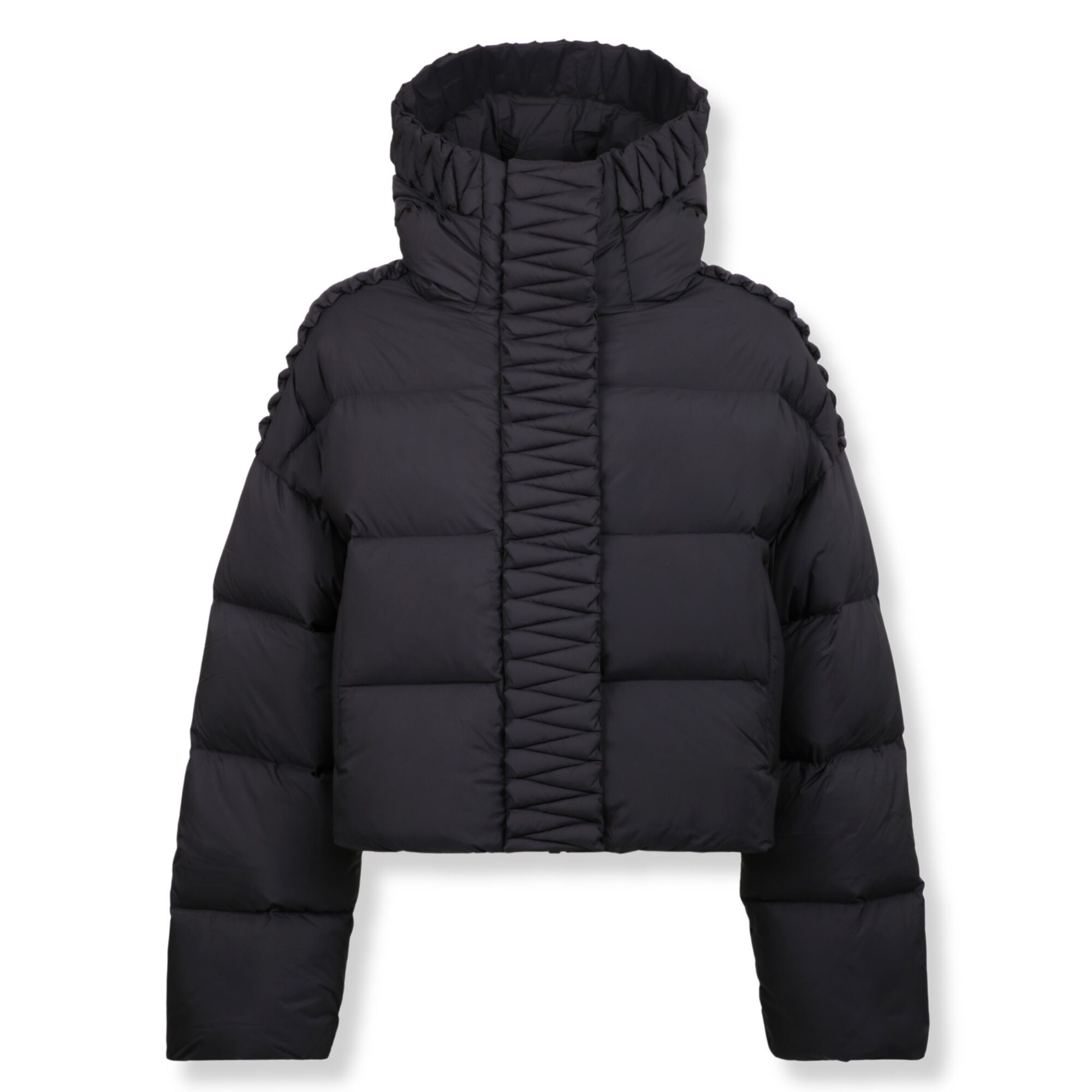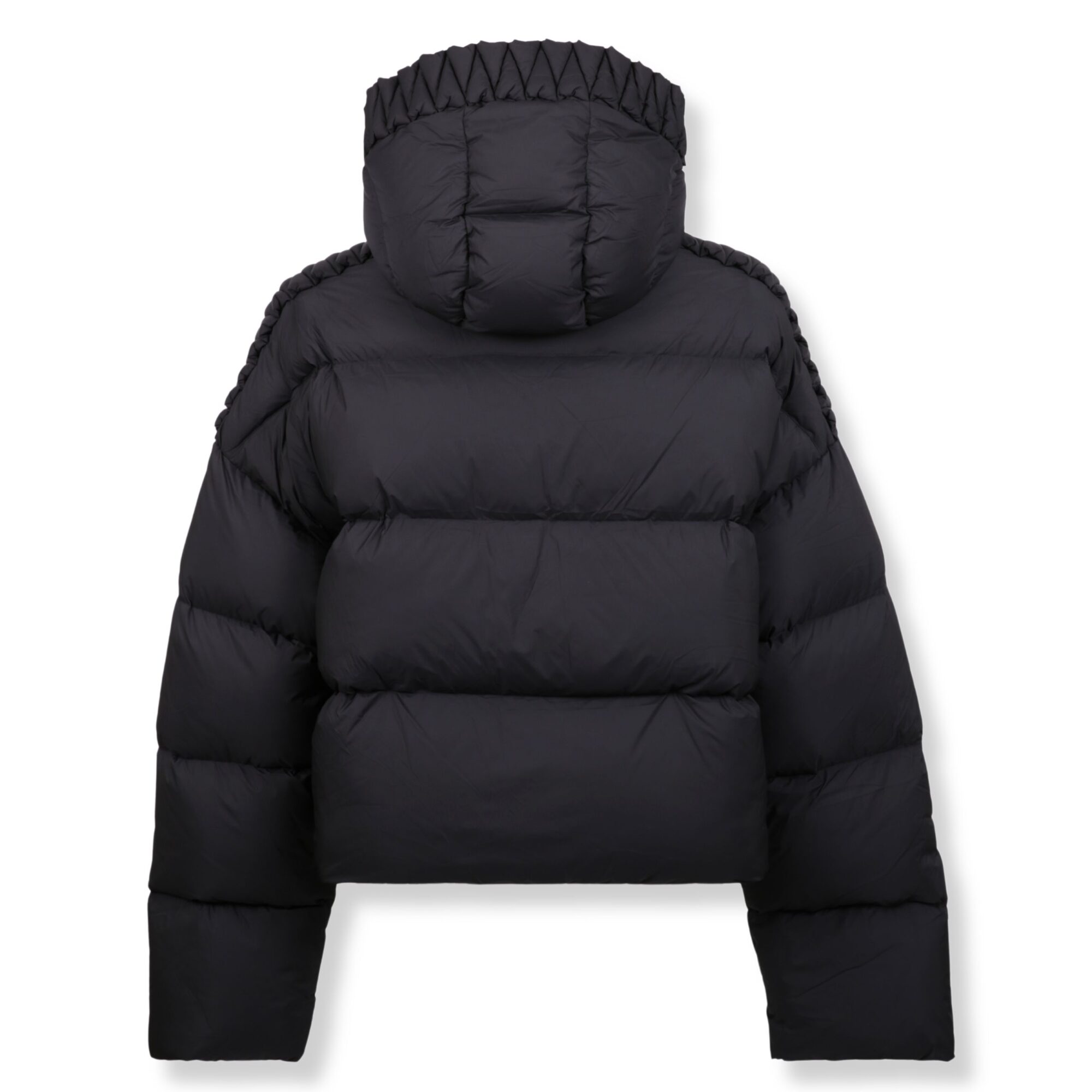 Piumino Raxxy. In nylon, con cappuccio classico e orli decorati con motivi geometrici. Linea oversize e maniche allungate.