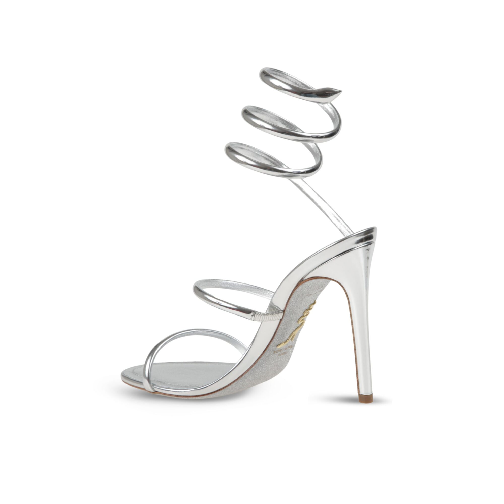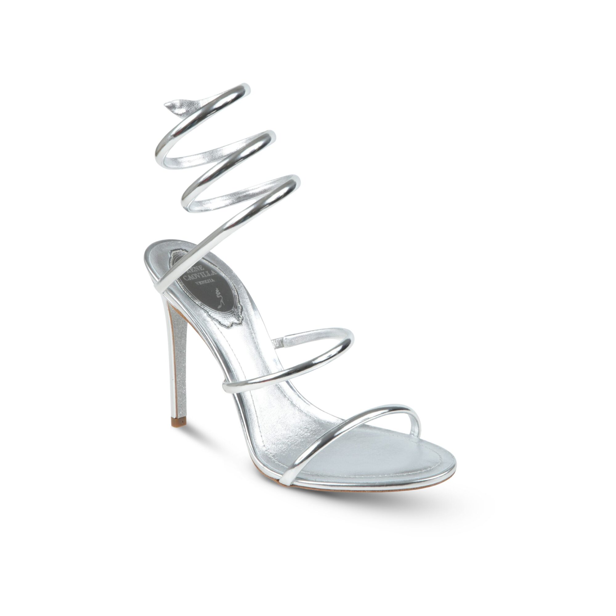 Sandalo Cleo René Caovilla. Punta tonda e tacco a stiletto con iconico cinturino a testa di serpente e suola stardust.