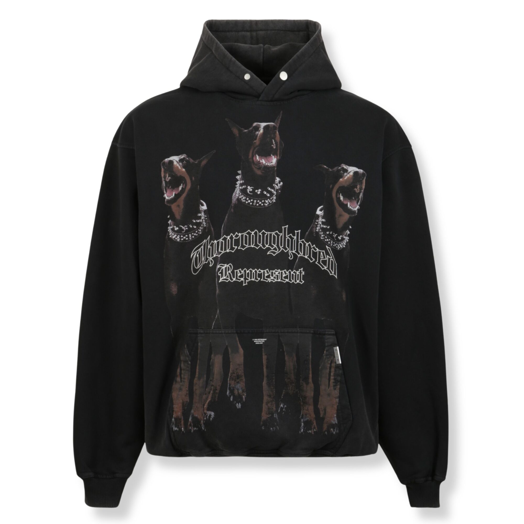 Thoroughbred Hoodie Represent. Vestibilità oversize e bordi a costine, tasca a marsupio e stampa grafica del brand sul davanti.