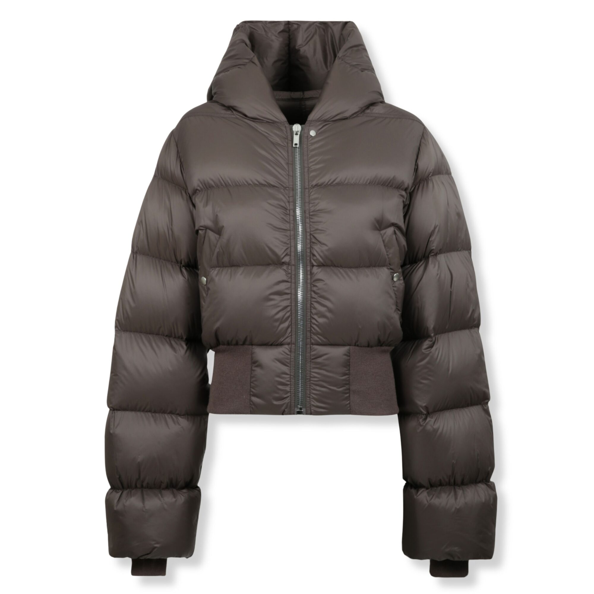 Piumino con cappuccio Rick Owens. Fondo elastico, polsini a costine. Chiusura zip e due tasche frontali con bottone.