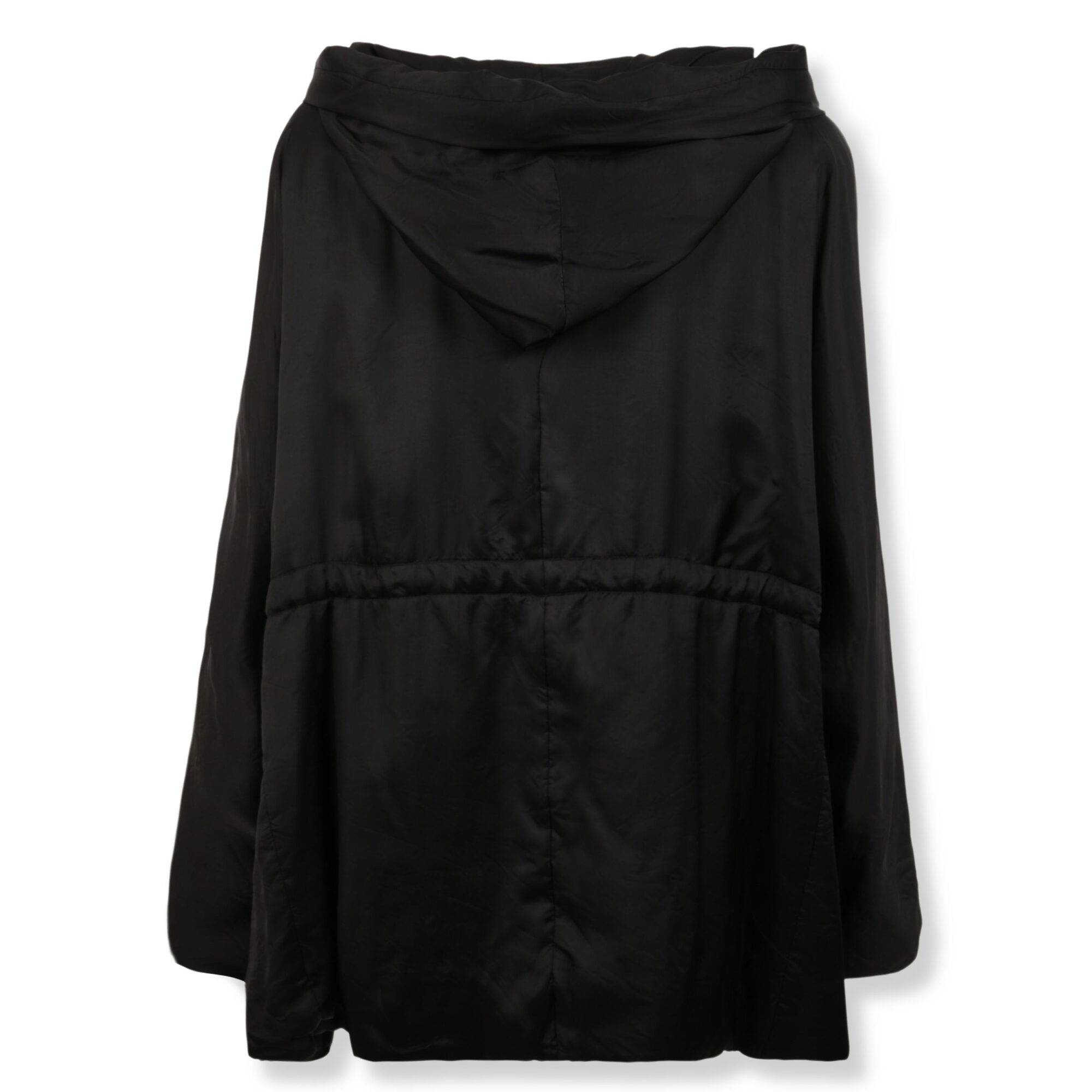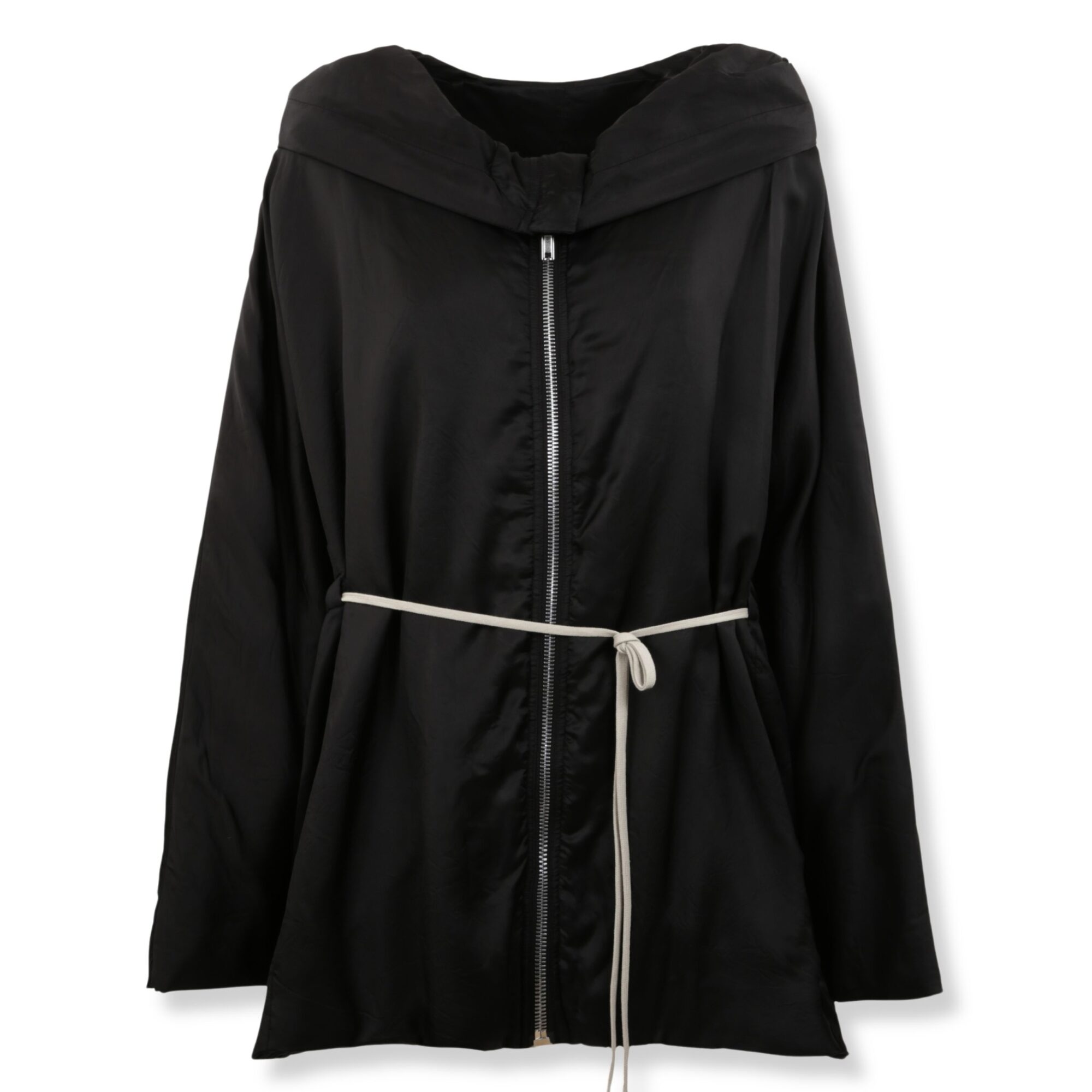Giacca Rick Owens. Vestibilità ampia e fluida. Cappuccio applicato voluminoso effetto mantella. Chiusura zip frontale, con cintura in corda.