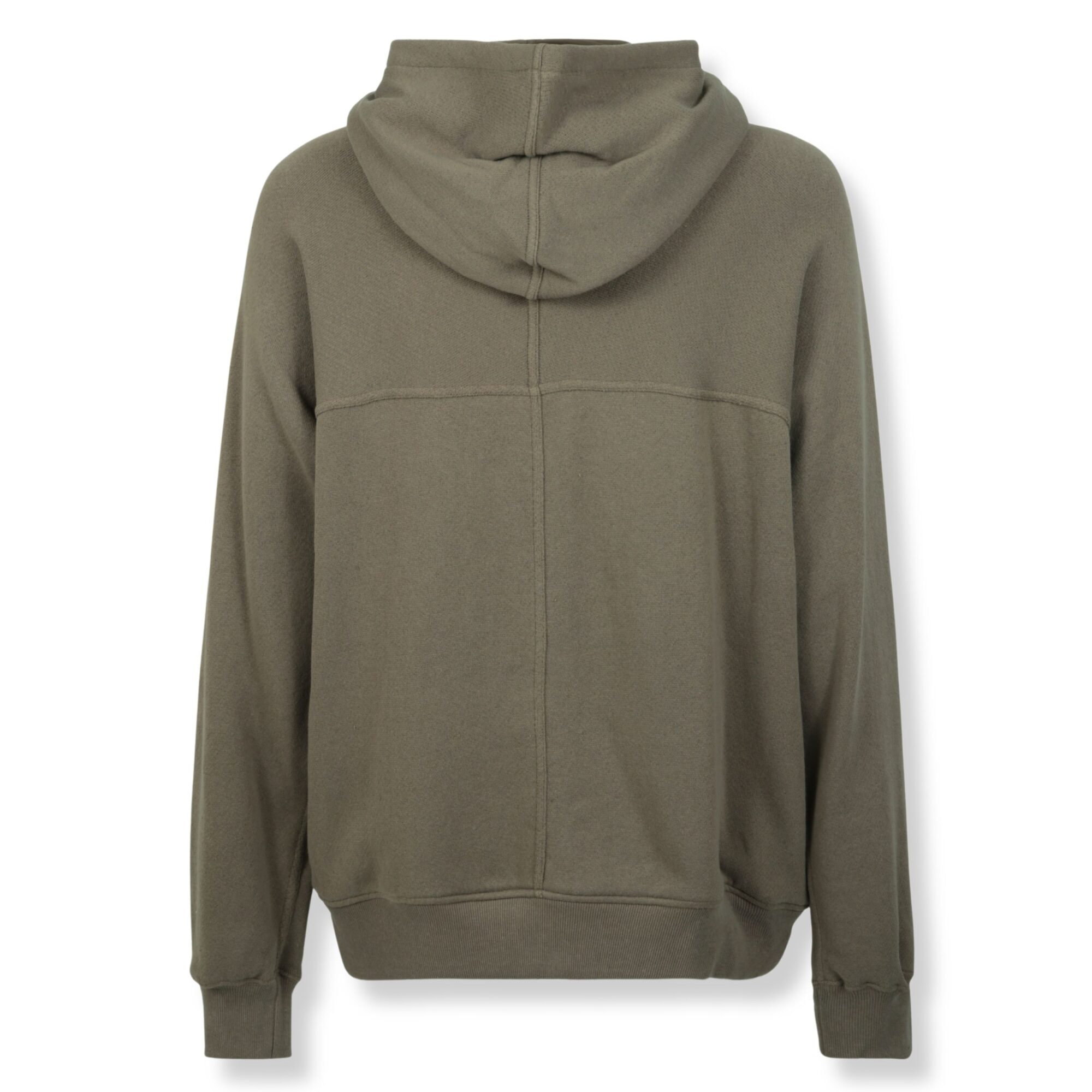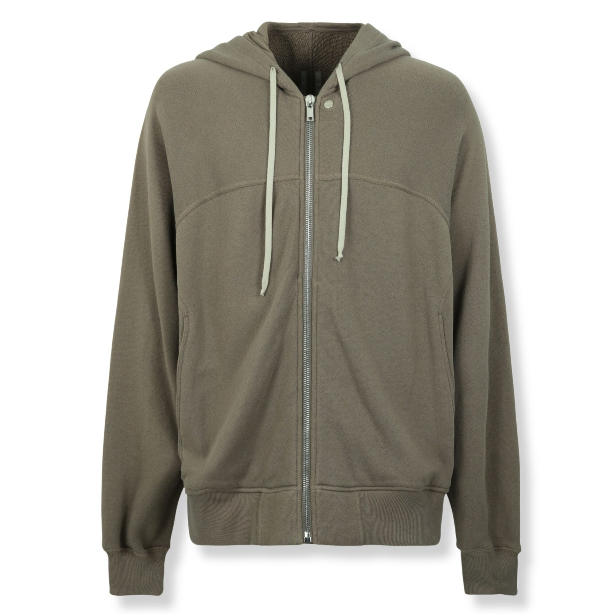Windbreaker Rick Owens. Vestibilità rilassata e cappuccio regolabile, bordi a costine e due grandi tasche laterali a filetto.