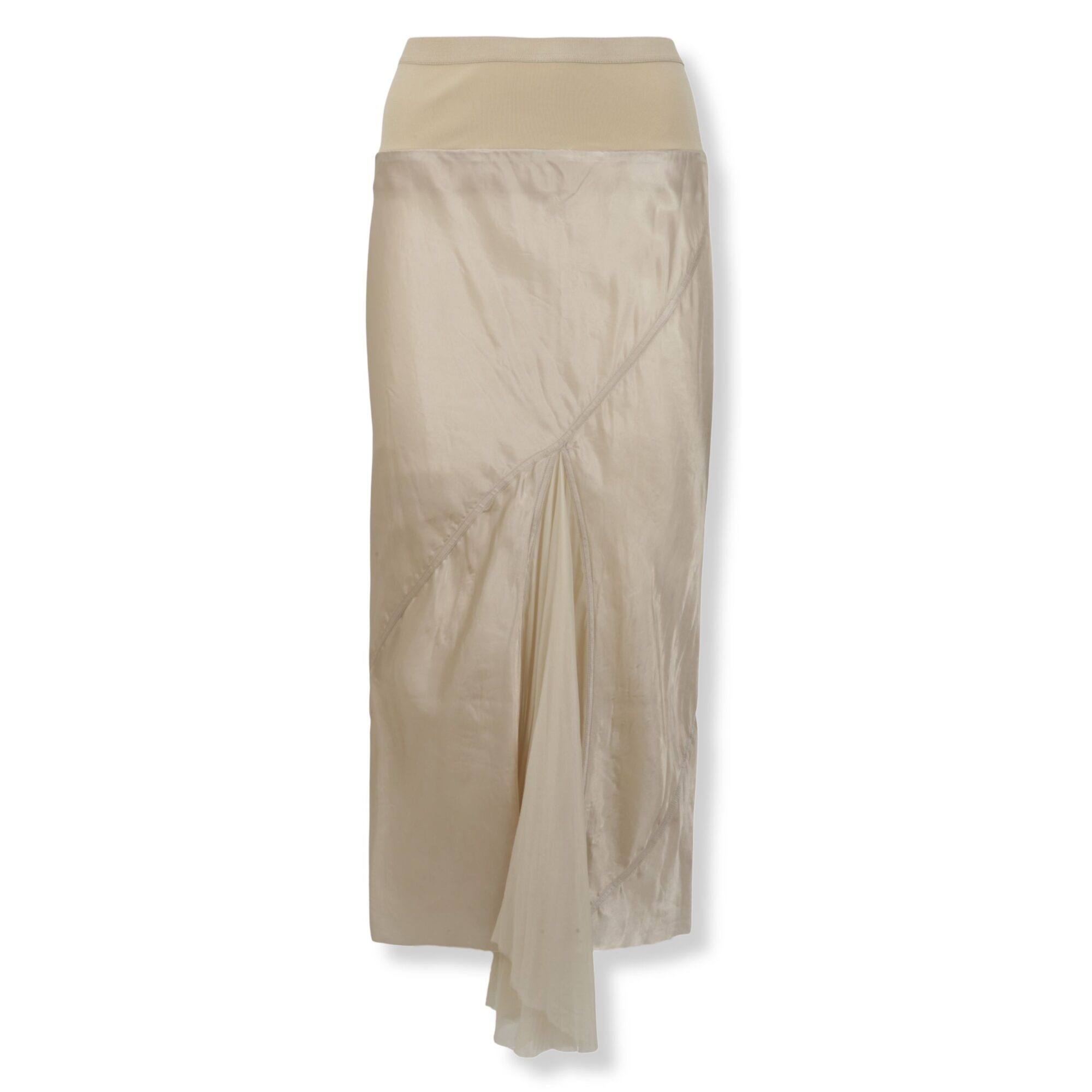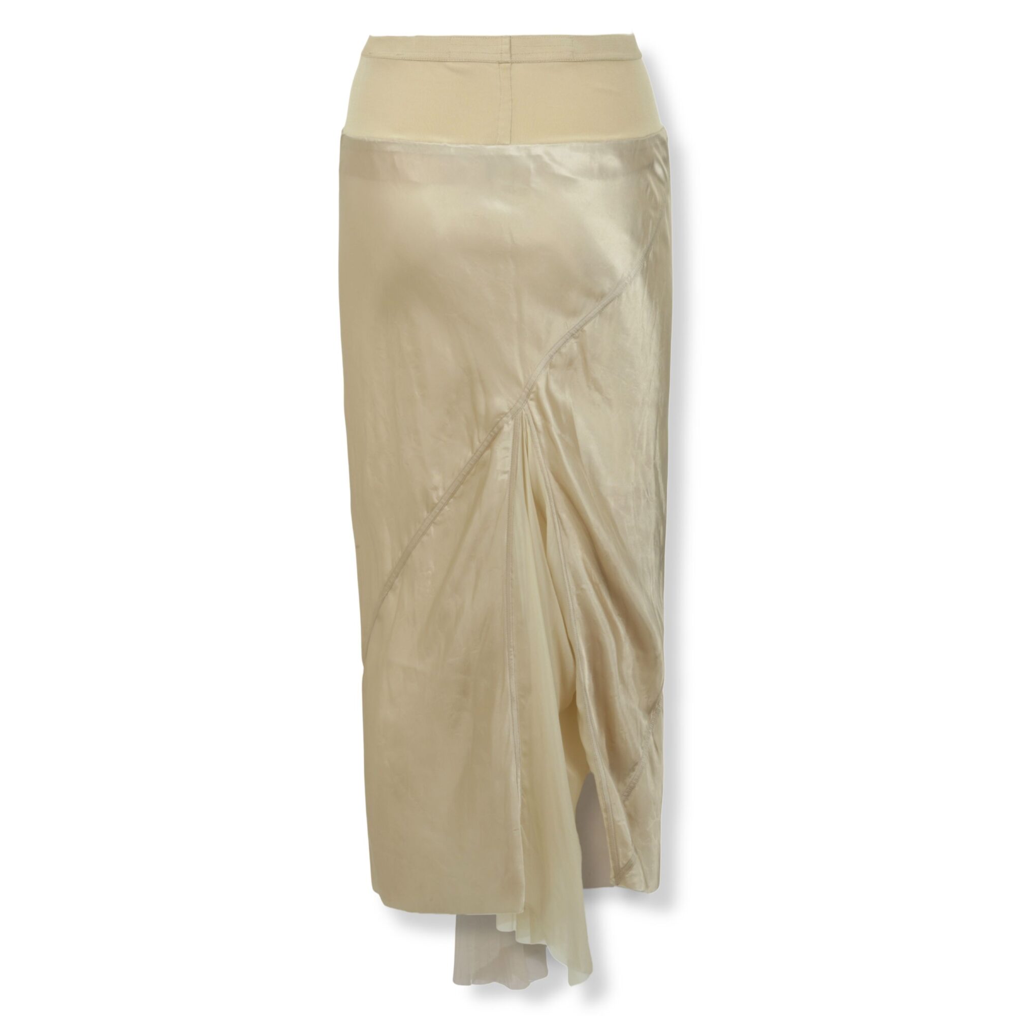 A Line Bias Skirt Rick Owens. Vita rifinita con inserto elasticizzato a costine verticali, cadenza fluida con cucitura diagonale e drappeggio centrale effetto cascata.
