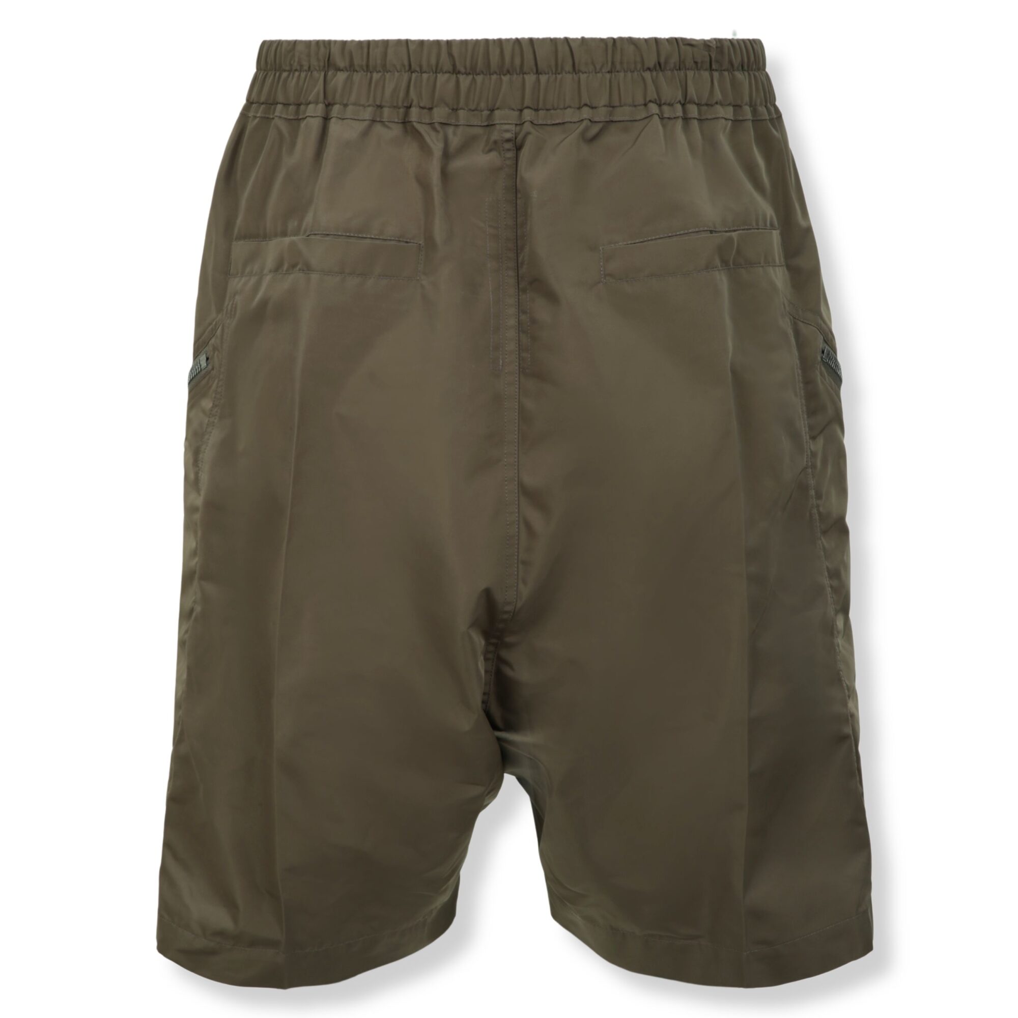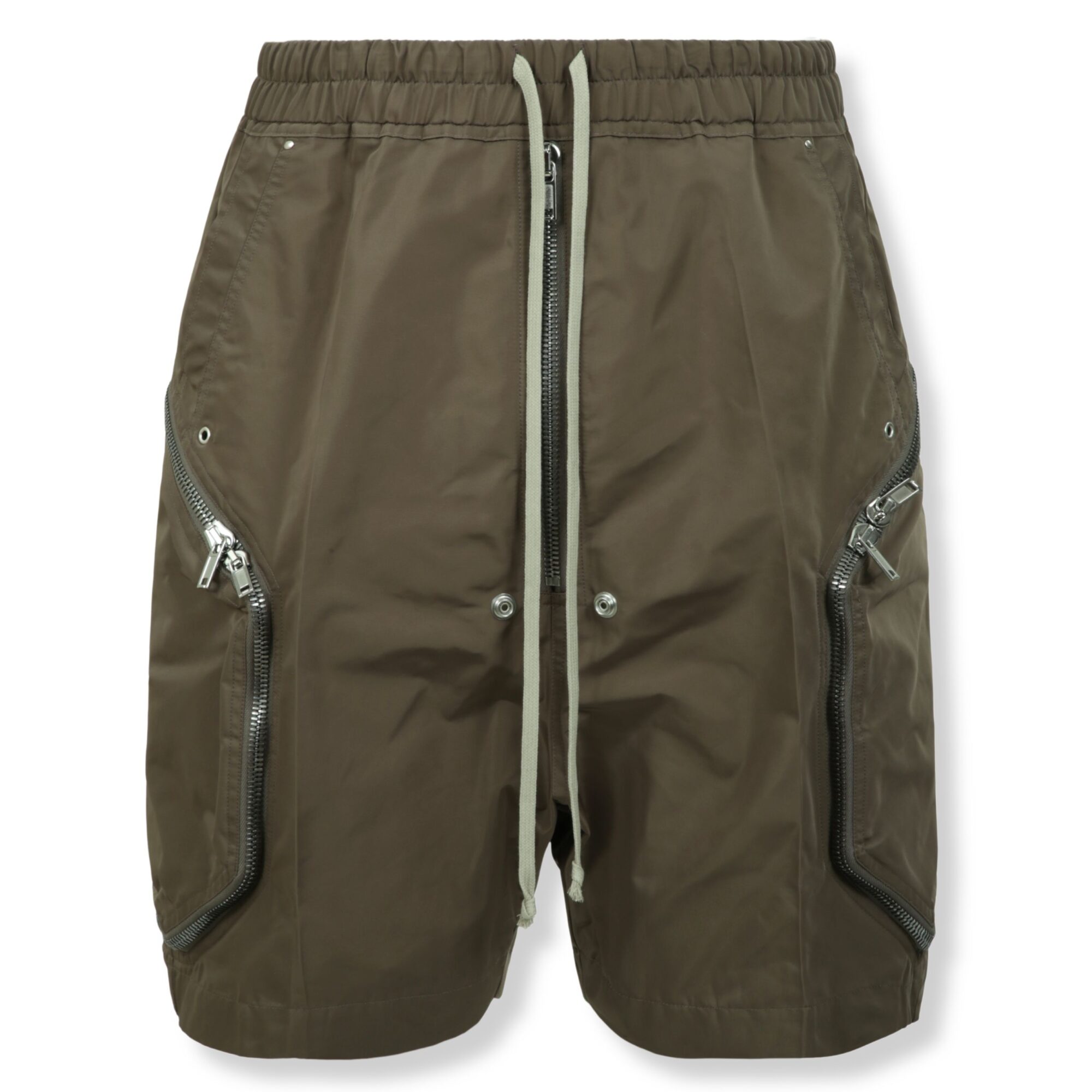 Temple Heizer Bela Rick Owens. Gamba dritta, design con cavallo basso e vita elasticizzata regolabile con coulisse. Chiusura frontale con zip a vista, due tasche laterali e due posteriori a filetto e due grandi tasche con zip laterali.